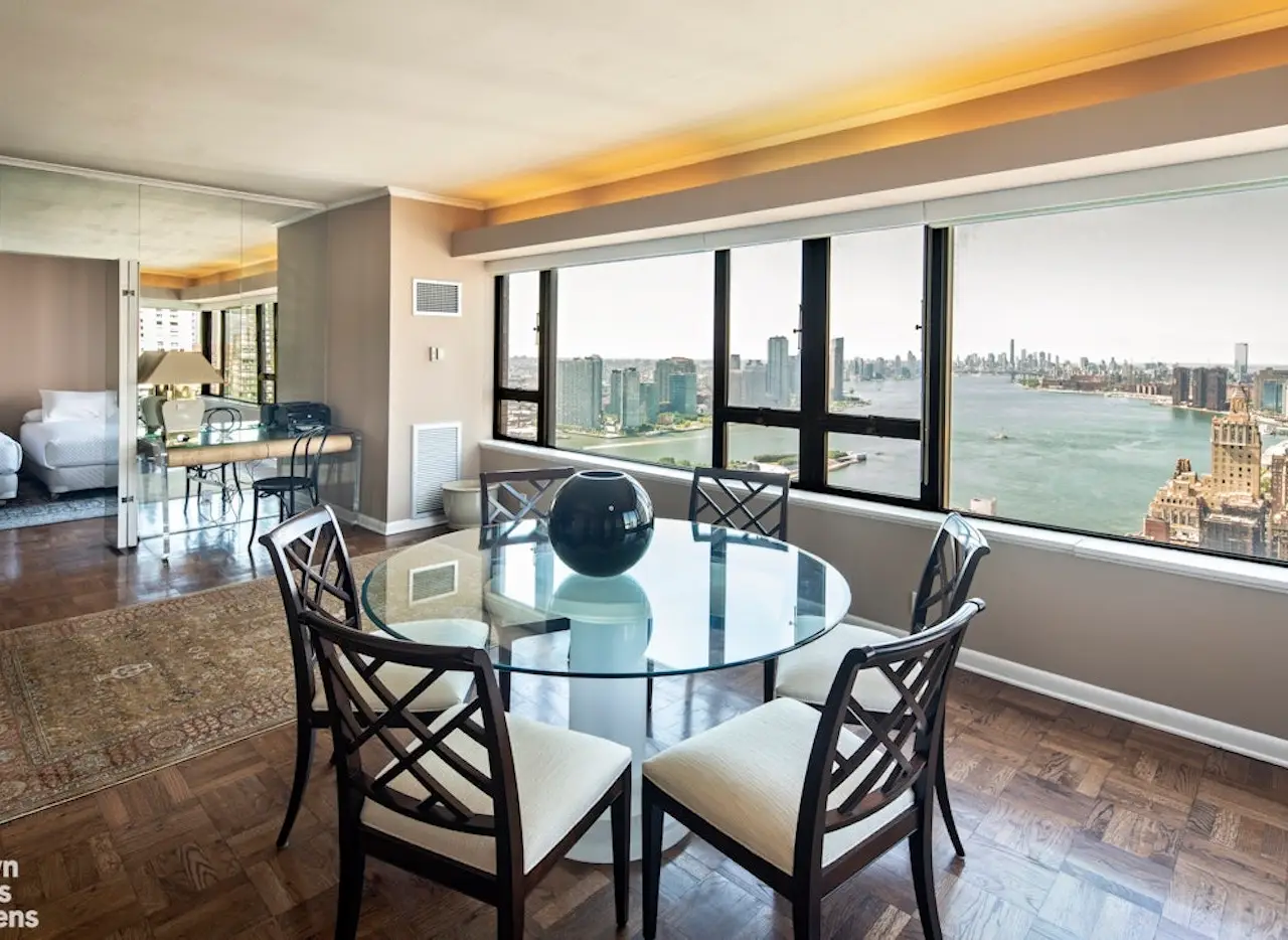 Spectacular views dominate every room of this spacious 42nd floor luxury home. Walls of windows capture the mesmerizing activity of all varieties of water going vessels on the East River as well as beautiful city skyline views south and west. At approximately 1800 sq. ft. with nine ft. ceilings there is a grandeur to this 2 bedroom 2.5 bath home in The Sovereign. The gracious entry opens to a large south facing living room with a south and west facing dining area. Adjacent to the living room is the second bedroom which currently has French Doors opening to the room. The primary bedroom has abundant closet space. There are two ensuite marble baths plus a powder room. The large windowed kitchen has a separate laundry area and service entrance for deliveries from a manned elevator. The Sovereign is a full service luxury building with a lobby level gym, valet parking garage with Tesla charges, and year round heat and a/c available. The building is surrounded by well-maintained park like gardens. The lobby is furnished with midcentury classics such as Venini chandeliers and curated modern art. "When The Sovereign was built in 1974, Paul Goldberger of The New York Times noted, "The Sovereign is in the super luxury category." The Emery Roth designed building has a lobby that "extends under the entire building, and there are four semiprivate halls per floor - a welcome (and expensive) alternative to the long, double loaded corridor. Such an arrangement has probably not been used in any New York building since the nineteen-thirties." Then as now, with only two apartments per floor, the residents are treated to impeccable world class service is provided by the staff that includes sentry, doorman, concierge,on-site management, valet parking in the 24 hr. garage equipped with Tesla charges. This mid-century building has an elegant lobby distinguished by Carlo Scarpa designed Venini chandeliers and rosewood paneling." Amenities include a state-of-the-art windowed gym, and manicured gardens surrounding the building.