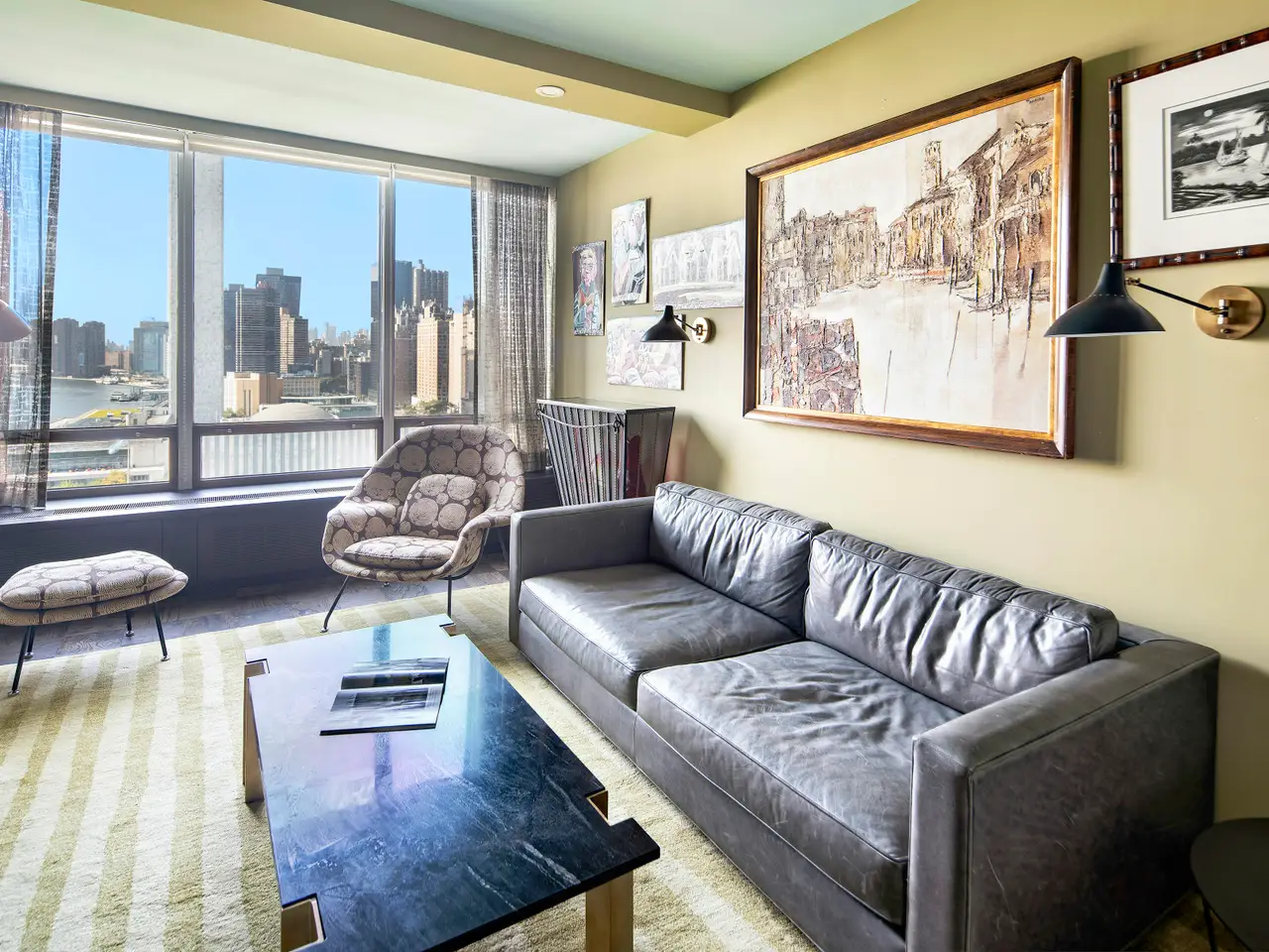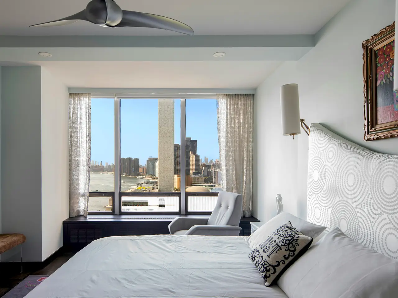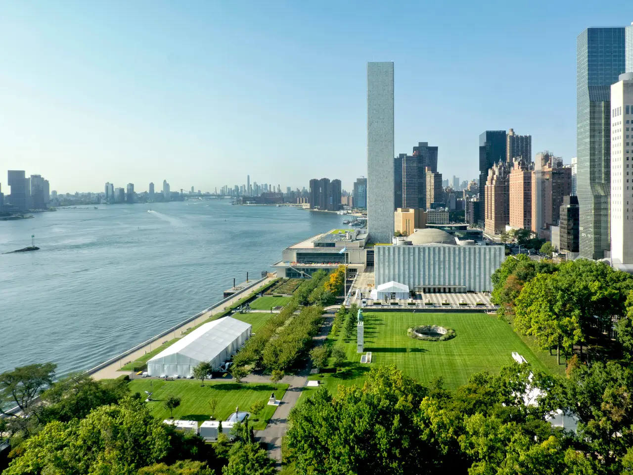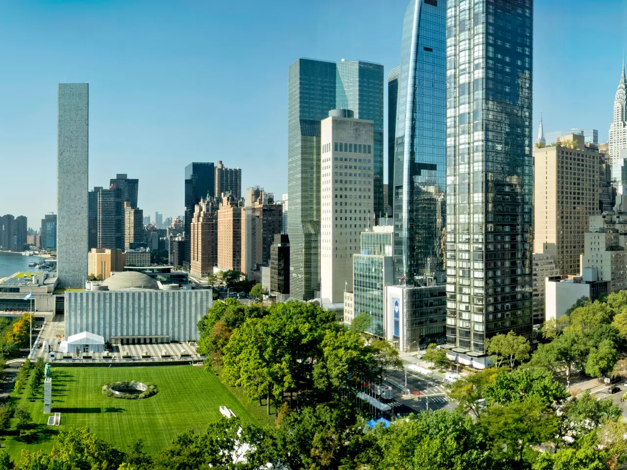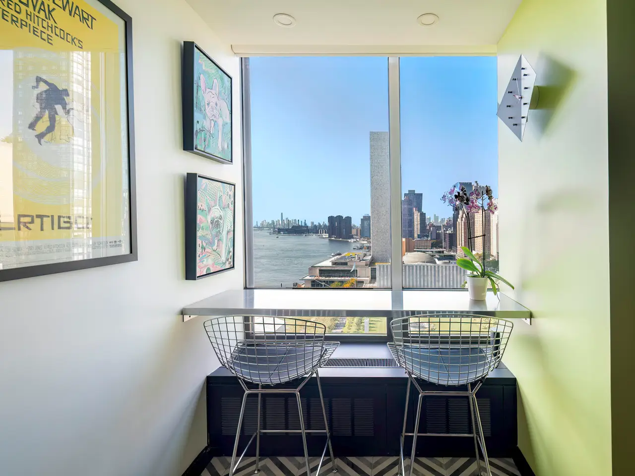 870 United Nations Plaza, Unit 18A is a stunning professionally designed and recently renovated residence with spectacular south views of the East River and the United Nations Gardens and a west view that includes the Chrysler Building. This elegant space boasts an impressive 1,660 square feet, ensuring every room is beautifully spacious and inviting.  18A perfectly captures the essence of elegant New York City living with a grand 17 ft. entry gallery, abundant natural light in all the rooms due to the glass curtain walls, expansive living and dining room designed for both comfort and style. The glamorous windowed kitchen features seating facing the river and UN gardens. The exceptional designer renovation includes custom cabinetry, a bar with wine refrigerator, a Bosch Washer and Dryer, microwave and dishwasher, and a Wolf stove. Both primary bedrooms have ample storage including walk in closets. There are two renovated marble baths. The luxurious primary bath has been thoughtfully enlarged and has a generous walk in shower and long custom vanity. The home also includes an ample basement storage locker. 870 United Nations Plaza was designed by master architects Harrison & Abramovitz and is one of the worlds most iconic residences in a mid-century Modern International Style . This architecturally prestigious luxury Cooperative has the longest private Driveway in the city which leads to a grand triple-height Lobby. 53 staff members provide residents with 24 hr service and security. Superb amenities are on-site Management Office, new Fitness Center, Pilates Studio, Private Residents Club 39 a Lounge with Kitchen and entertainment rooms, 2 Conference Rooms, Golf Simulator, Billiards Room, in-house Dry Cleaning Service, Rooftop Sun Decks and Garage. Pets are welcome. Apartments may be purchased in a Qualified Personal Residential Trust. Foreign buyers welcome with USA based assets. 75% Financing Permitted. Maintenance $3346/m, Utilities $1110/m (includes electric, gas, water, basic cable & internet & window washing). 3% flip tax paid by buyer.
