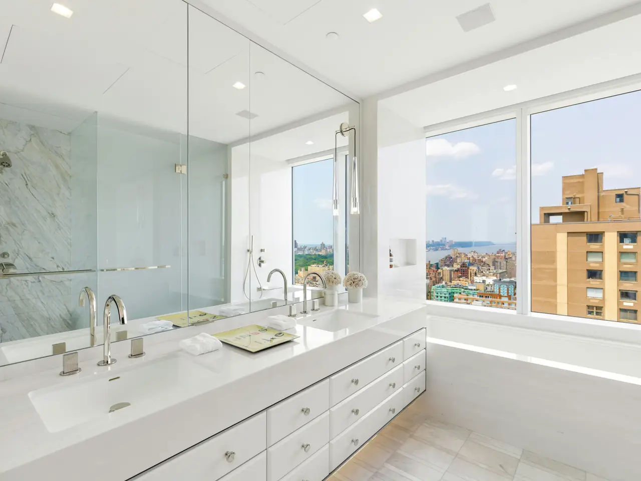 First RESALE of the BEST high floor 3-bedroom residence. A grand space with breathtaking Central Park, Hudson River, open City views with custom designer upgrades throughout! Enter this nearly 2,700 square foot, exquisite residence via a semi-private landing shared with only one other apartment on the floor. An elegant entry gallery sets the tone for this stunning home, with soaring 10 foot ceilings, 3 gigantic exposures, an enormous and show-stopping living space and 3 bedrooms and 3.5 bathrooms. Upon entering the corner living and dining room, stunning North and Eastern light and Central Park views from floor-to-ceiling glass windows will take your breath away! Conveniently open to the dining area is the fabulous chef's eat-in kitchen, complete with an impressive Calacatta island, and custom white oak cabinetry with satin nickel hardware. Top-of-the-line appliances include 2 Miele dishwashers, a Sub-Zero refrigerator, freezer and wine cooler, an 8-burner Wolf stove, a Miele speed oven, a warming drawer, and a fabulous marble, vented hood. Situated on the North West corner of the home is the luxurious primary bedroom suite, overlooking the Hudson River, with a custom outfitted walk-in closet, two supplemental closets, and a spa-like primary bathroom. The windowed primary bathroom is a true tranquil sanctuary, featuring radiant heated flooring made of white Iceberg marble, a lacquered vanity with double sinks, a deep soaking tub, a rain shower with a marble bench, a separate water closet, and polished nickel sink and bathroom finishes by Fantini. There are two additional spacious and well-proportioned bedrooms, each offering an en-suite bathroom and custom fitted and generous closet space. One bedroom enjoys Hudson River views, while the other has equally special views of Central Park. Completing this spectacular home is a glamorous jewel box powder room featuring a custom mirror and Pearl and Saint Laurent marble custom mosaic floors. The home also includes a separate laundry room with a vented washer/dryer and a sink, a state of the art smart-home system, and multiple zones of central air conditioning. Additional fabulous upgrades made by the owners include custom built-out closets throughout, installation of ceiling molding and new baseboards, stunning designer light fixtures, Lutron lighting system, electronic shades in all rooms (with blackout in the bedrooms), Sonos music system speakers in the primary bedroom suite and living room (surround sound with subwoofer), and an integrated living room TV sound system. Two bike storage licenses are offered with the sale. Please note that there is a working capital contribution equal to one month's common charges payable by the buyer. 200 Amsterdam is an iconic new condominium designed by Elkus Manfredi and CetraRuddy, perfectly positioned in Lincoln Square, just moments from Lincoln Center, world-class dining, and luxury shopping. It features 3 floors of indoor and outdoor amenities, including a resort level Spa featuring a 75" saltwater pool, rejuvenation rooms with steam and sauna, treatment rooms, a top-of-the-line fitness center curated by The Write Fit with yoga and pilates studios, a golf simulator, "The Club" with a landscaped terrace, lounge and dining room, billiards table, library with grand piano, teleconference rooms, soundproofed Rehearsal Room, and a children's playroom featuring a performance stage. 200 Amsterdam's level of service is unmatched featuring a 24-hour doorman and concierge, lifestyle management services provided by LIVunLtd, and a live-in resident manager.