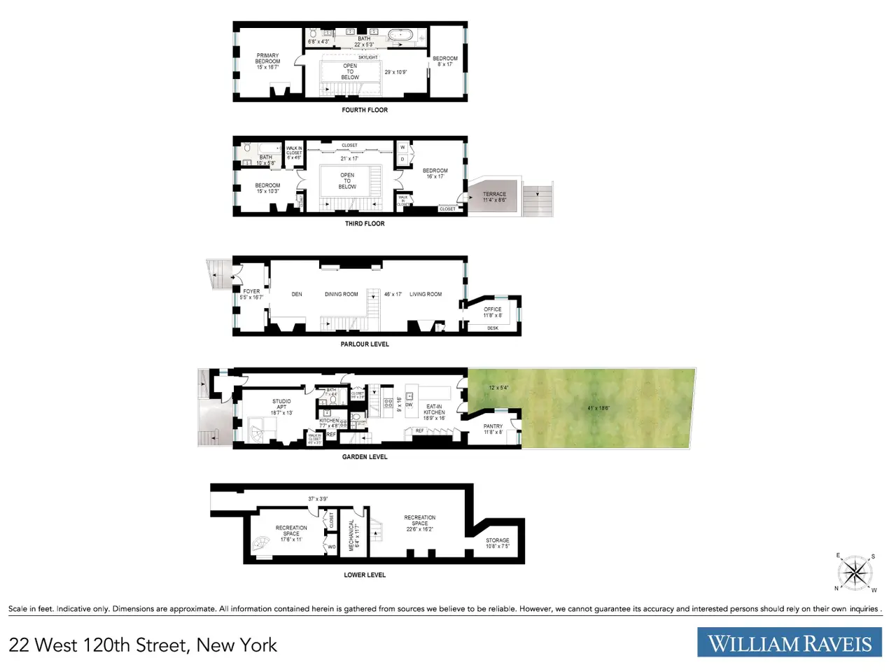 Located on one of the most coveted tree lined blocks in the Historic district of Mount Morris Park, one with the most beautiful Renaissance brownstones block, this gorgeous 4 story single family residence features 5 bedroom, 2.5 bathroom, a studio/home office and gigantic storage. Some features include: a dramatic skylight embraces the entire space, radiant heated floors, metal staircase and four wood-burning fireplaces. The architecturally unique brownstone is truly an architectural gem. There are four floors of living space: 5 bedrooms, 2.5 bathrooms + home office and tons of storage space. Oversized windows that let Southern and Northern light in all day long and soaring ceilings create the feeling of a loft-style home in a traditional brownstone. The primary bedroom boasts large windows with a view of the park and a wood burning fireplace. The primary bath features a double sink on a custom vanity with ample storage, soaking tub, separate glass stall shower and water closet with pocket door.The living room and dining areas both have high ceilings and wood burning fireplaces and are made for entertaining. The kitchen has premium appliances, a wrap-around island and a powder room. There are two southern outdoor spaces: large 18 + 55 ft. garden adjacent to the eat in kitchen and a deck off one of the bedrooms. The separate garden apartment is a duplex studio with home office/rec-room, kitchen, W/D, and has its own private entrance. The house has every room that is wished for and so much more! The outlooks are all onto park, trees and greenery. It is located near Restaurant's row, Whole Foods, Trader Joe's, 3 Parks, a dog run, and all public transportations. We will be delighted to offer you a tour.