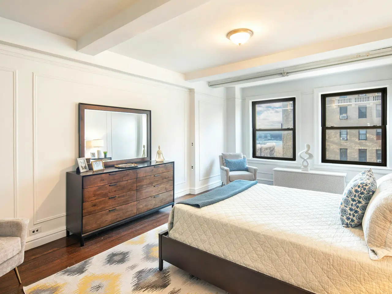 GIGANTIC. Measured at 2,300 square feet and a peek of the river. Your canvas awaits. This rarely available, over-scaled home has the grandeur and square footage more typically found in 7 to 8 room home. Boasting six super large rooms, this home has 2-3 bedrooms plus a staff room/office, a huge kitchen, oversized formal dining room, regal living room and grand formal gallery. A foyer leads to the large gallery which connects to the oversized living room facing West onto West End Avenue and to the large dining room facing East. There is also a windowed kitchen with ample prep space and lots of storage. The primary suite faces over West End Avenue and is super large with plenty of room for a king sized bed, sitting area, walk-in closets and a home office/dressing area! The large an en-suite window bathroom has both a tub and a separate shower. The generously proportioned second bedroom is serviced by a hall windowed bathroom. A staff room could be another bedroom or added to the kitchen. 670 West End Avenue is a very well established and well run prewar cooperative with low maintenance, 24 hour doormen, live-in superintendent, storage (as available), a bike room, playroom, pet friendly and a beautiful and tranquil planted roof deck. 75% Financing Allowed.