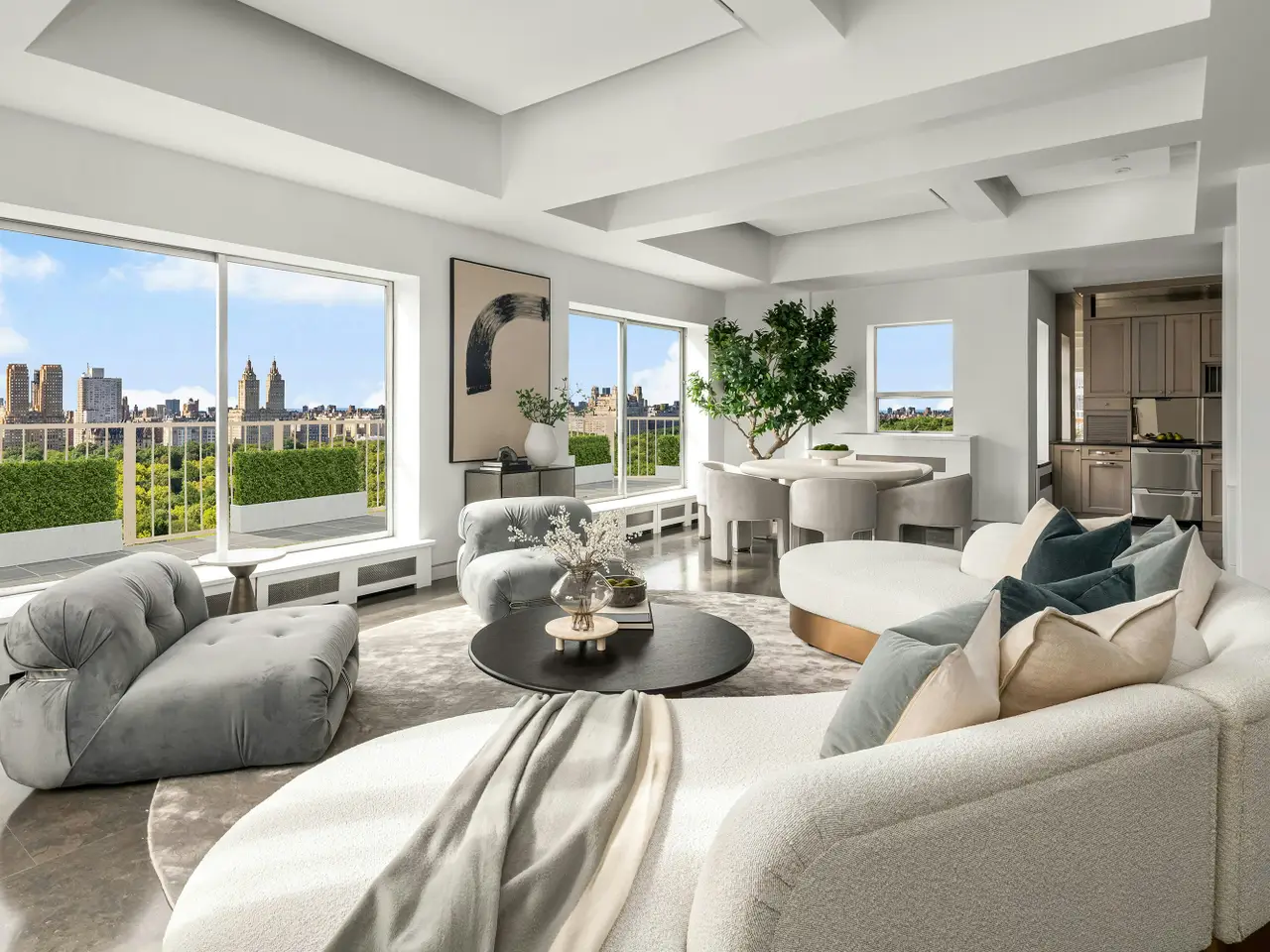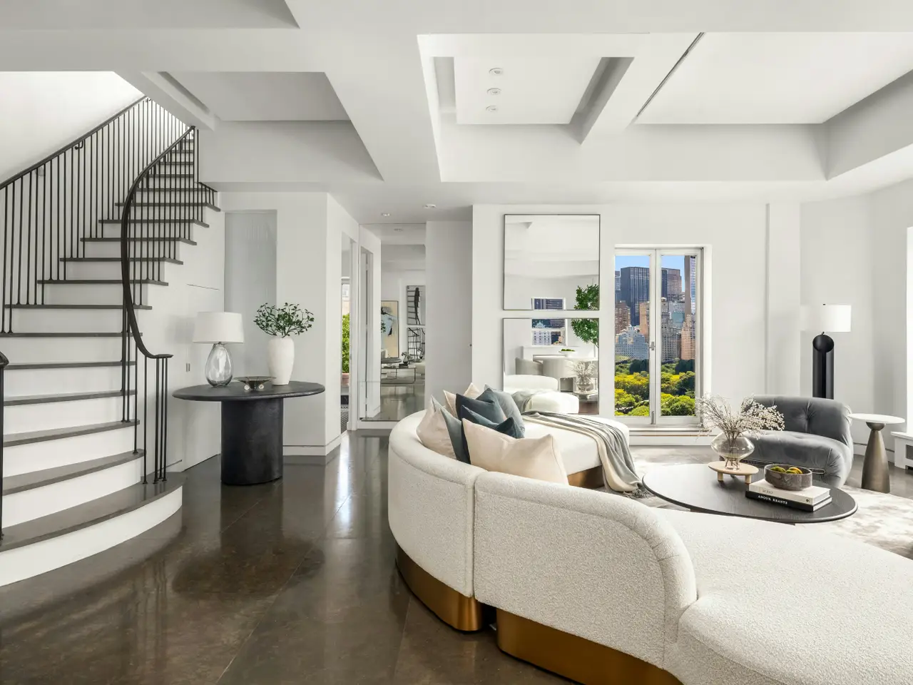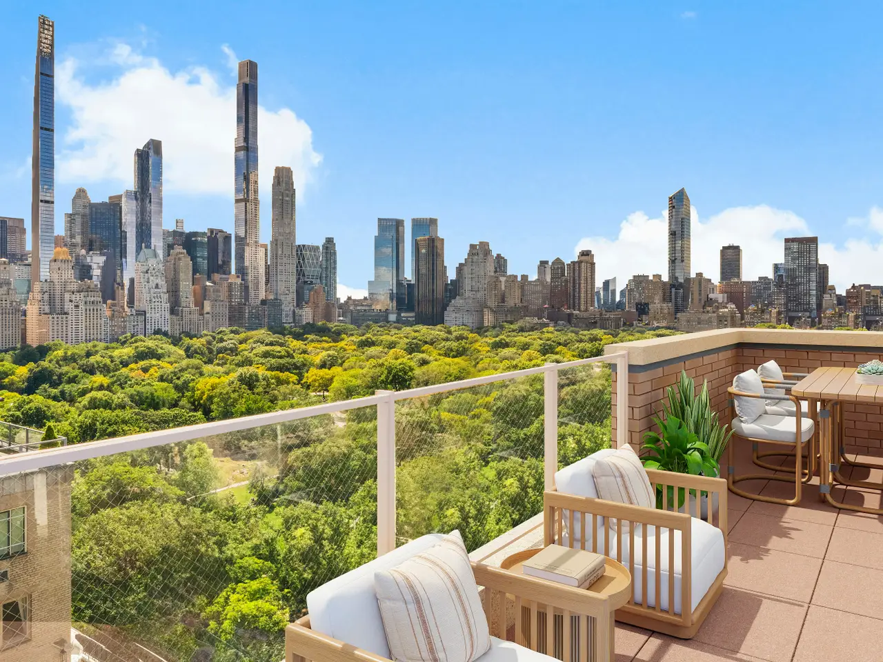 Experience jaw-dropping panoramic skyline views from this extraordinary, newly listed two-bedroom duplex penthouse with two floors of private terraces perched on the 20th and 21st floors and 360-degree views of the city. This architecturally iconic 880 Fifth Avenue residence offers a once-in-a-lifetime opportunity to live above it all in one of the city's most desirable buildings and locations. The expansive living and entertaining spaces include a grand, show-stopping living room featuring floor-to-ceiling windows and glass doors that open onto wraparound terraces high over Central Park. Polished stone floors add a sleek, modern aesthetic, while the open floor plan creates a seamless flow into the dining area and a masterfully appointed eat-in chef's kitchen. The entire space is infused with natural light and sweeping views, exuding a cool downtown vibe in an elegant uptown setting. The sophisticated private quarters include a south-facing primary suite on the main lower level that offers sunny exposures , direct terrace access, and a beautifully finished bathroom with a Japanese soaking tub. A custom staircase with a hand-forged wrought iron banister leads to the upper level where there's an enormous private terrace, approximately 1,300 sq. ft. -ideal for grand-scale entertaining or peaceful solitude as well as a second bedroom complete with a luxurious en-suite bath. Additional features include exceptionally high coffered ceilings, attractive recessed lighting throughout, abundant closet space, and gorgeous sunlight all day long. The purchase includes a sizable separate windowed staff room/home office with courtyard views and access to a shared bathroom. There is also a storage unit which transfers with the apartment. 880 Fifth Avenue is a fully staffed, full-service, white-glove cooperative and the only twin-towered building on Fifth Avenue. It was the last building designed by Emery Roth and the first building completed on Fifth Avenue after World War II. The Art Deco lobby is a timeless work of design, featuring glistening marble floors and signature silver-leaf bas-relief detailing. Building amenities include: 24-hour doorman and concierge service, a newly renovated gym, on-site parking garage with discounted rate for shareholders (current waiting list), 50% financing permitted, pied-a-terres allowed as well as pets, who must accompany their owner to the board interview. A Prime Upper East Side Location at the corner of Fifth Avenue and 69th Street, this address offers unmatched convenience with close proximity to Central Park, top-tier restaurants, gourmet markets, luxury boutiques, and cultural institutions. Access to both public and private transportation is just moments away.