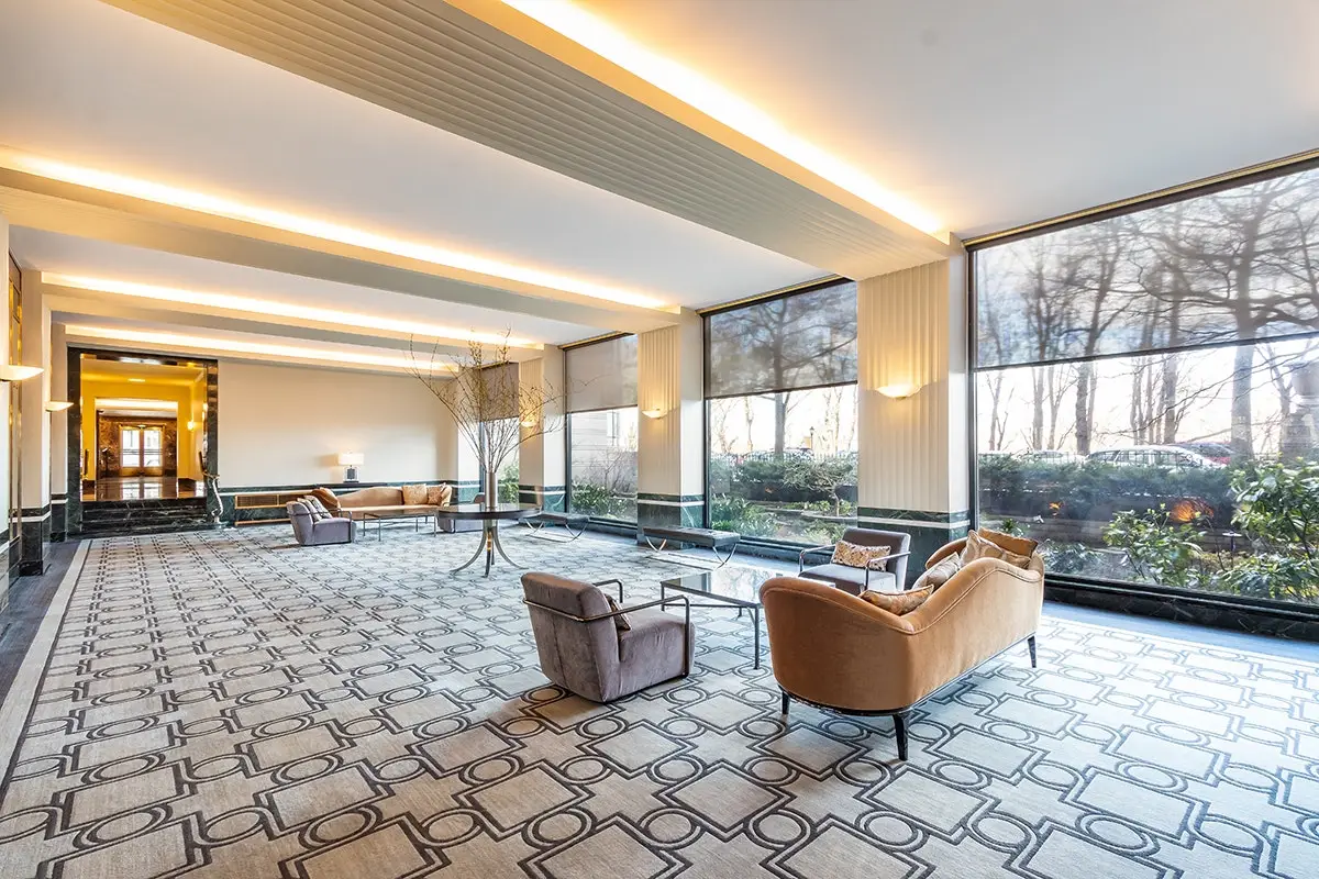 Massive Renovated Riverside Drive Five Nestled in the heart of the bucolic Riverside Drive Historic District, this gracious split two-bedroom, two-bath home with side Hudson River views is a must-see. Rarely does one find a two-bedroom home with the breadth, light, grandeur, and elegance of this one. Its grand proportions, generous rooms, inviting flow, and refined finishes exemplify the elegance and splendor one only finds in the best pre-war homes. Its beautiful renovation makes it a rare find indeed. Apartment 18-O is a mint, turn-key, forever home. This serene apartment is impressive in every sense. Upon entering, one is welcomed into a gracious foyer with 9'7" ceilings, classic wood molding, and immediate views of the sunny blue-sky-filled windows of the lovely dining room and adjoining chef's windowed kitchen. The kitchen is open to the dining room but delineated by a graceful arch, creating visual flow and inviting diners to be part of what is often the hub of a home. The kitchen is renovated in a classic style. It features a double sink under the window, two-drawer Fischer and Paykel dishwasher, five-burner stove, Sub-Zero refrigerator, and wine cooler. The counters and backsplash are made of the most appealing tumbled marble, providing ample room for cooking, prepping, and serving. The central foyer also invites one into a bright, welcoming, and spacious living room. Again, one notes with pleasure the flow and visual connectivity of all the rooms in this home. The living room offers generous space for living and entertaining. Among other features, the living room showcases elegant, handcrafted white wood built-ins flanking two windows - one of which is a corner window looking out to the Hudson River. There are additional built-ins on the opposite wall. "Balance" is genuinely a byword for this home. The built-ins not only provide space for displaying art, books, photos, sculptures, and more but also cleverly conceal a large television and a high-end sound system, which is wired to play throughout the home. Off the living room is a renovated bath and a generous secondary bedroom with double windows and a walk-in closet. Currently used as a study and den, this room may serve a variety of purposes to suit an owner's current or evolving needs. The primary bedroom is situated in a private wing adjacent to the main foyer. It features two large closets, additional bespoke built-ins, and a modern, windowed bathroom. The apartment also features a washer and dryer, conveniently located in a separate closet. The Normandy is one of the most treasured buildings on Riverside Drive. Designed by noted pre-war architect Emery Roth (creator of Upper West Side landmarks the San Remo and the El Dorado), the Normandy spans an entire block. Each wing has a private entrance with elevators and attendants. A grand lobby connects the wings and faces Riverside Drive and Riverside Park, visible through floor-to-ceiling windows and a sunken garden. The Normandy is a full-service building in every sense, with a live-in super, full-time and friendly staff, 24-hour door attendants, a playroom, an exercise room, and central laundry. The building also features a spectacular roof deck with sweeping views of the Hudson and the George Washington Bridge, as well as sunlit vistas of myriad Manhattan skylines to the south and east. Riverside Park is one of only eight designated scenic landmarks in the entire City. Stretching four miles along the waterfront, the Park is known for its stunning views, diverse recreational offerings, historical monuments, and more. The leafy promenades, deep lawns, and cultured gardens alone are extraordinary. Indeed, just near this home, one will find the romantic 91st Street Garden, where the happy ending of "You've Got Mail" unfolds. Perfection! For more on Riverside Park, check out the New York Landmarks Conservancy's "Tourist in Your Own Town" video. https://nylandmarks.org/explore-ny/riverside-park/ 75% Financing, Pieds-a-terre, and Co-purchasing allowed. Pets are most welcome! Showings commence June 4th.