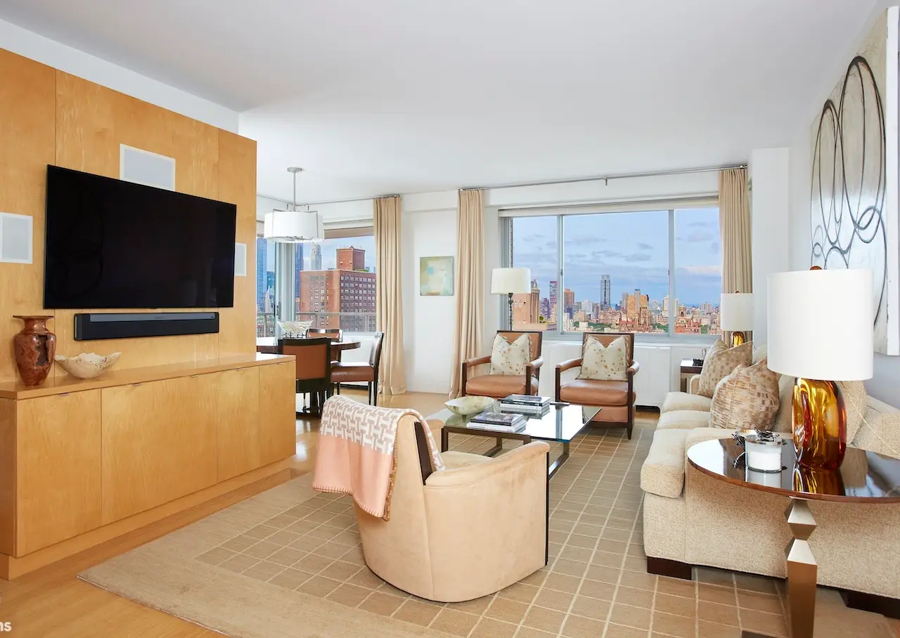 Mint condition with park views, oversized balcony, and sprawling proportions! Full-service cooperative with driveway and garage! This oversized one bedroom, two bath home boasts spectacular open views, a gorgeous renovation in mint condition, gracious proportions and private outdoor space. Perched high on the 34th floor, this corner home features sparkling city views to the south and breathtaking park views to the west. The views truly do not get better than this! You can also enjoy these sweeping views from your private corner balcony facing south and west. Enter through a proper entry foyer equipped with custom built-in closets. Continue into an open living room and dining room with double exposure, corner balcony and custom built-ins. The windowed, chef's kitchen is adjacent to the dining room and features top of the line appliances, custom cabinetry as well as a washer/dryer. A renovated, windowed full bath is conveniently tucked away off the living room for guests. The exceptional primary suite offers West-facing exposures overlooking Central Park, a walk-in closet and fully renovated ensuite bath with double sink. Excellent closet space throughout. 300 East 74th Street is a white glove full-service cooperative in the heart of the Upper East Side. Full-time doorman, concierge and live-in super. Amenities include a private circular driveway, onsite garage, state of the art fitness center (for an additional fee), storage, bike storage and laundry room. Pet friendly. Pied-a-terres welcome. Up to 60% financing.