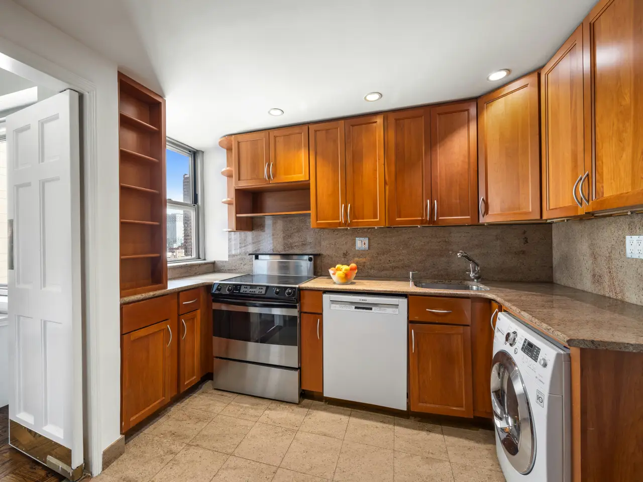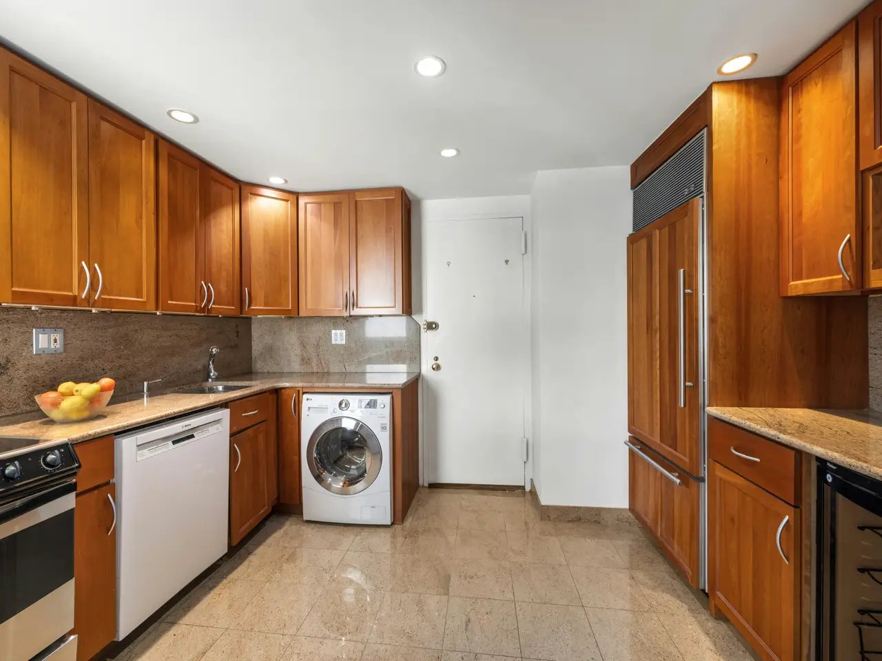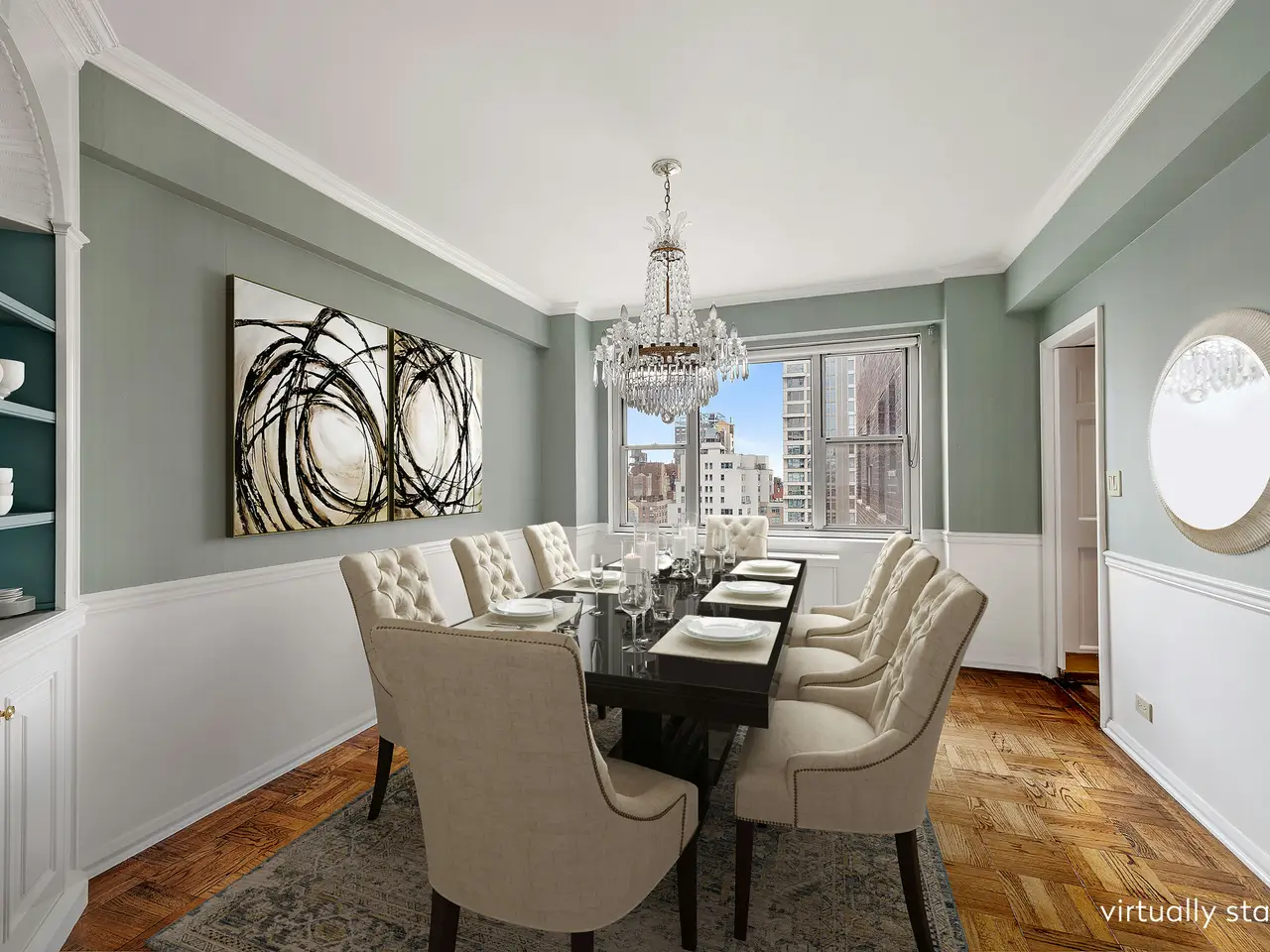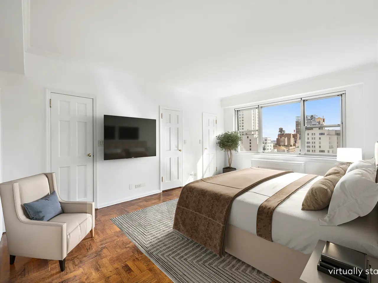 This oversized, light-filled five room apartment has a classic hub and spoke floorplan with rooms arranged around a large entrance gallery. Add a table with a floral arrangement, and drawers that hold keys, mail, and a concealed device charging station to create an elegant, modern entry. The large coat closet is currently configured as a home office, but can be reconfigured to accommodate coats, a shoe and boot rack, golf clubs and pet gear. There is also a powder room (half-bath) through a small hallway. Directly ahead, the entrance gallery opens onto the expansive living room with a wood burning fireplace, and sliding glass doors that open onto the west-facing terrace with open sky views. The dining room's wall of windows provides open views to the east and can comfortably accommodate a table for 8. However, if you don't host frequent dinner parties, the dining room could be transformed into a great library and movie viewing room. The living room is large enough to hold a drop leaf dinner table for formal occasions. The windowed kitchen has a sub zero refrigerator, wine refrigerator, and a washer/dryer. The kitchen has a service entrance, so that you don't need to carry garbage and recycling out in front of your guests. This property offers the luxury of two split bedrooms. The primary bedroom has two walk-in closets and an en suite bathroom. Eastern light floods the room, which is large enough for a king sized bed and a reading chair. The second bedroom also has an en suite bathroom, two large closets, built-ins, and access to the terrace. 201 East 62nd St is a full service building, featuring a 24 hr doorman, live-in resident manager, and a fully equipped gym. A storage unit comes with the apartment and there is also a bike room. Pieds a terre are allowed, as are pets, with board approval. Electricity and cable are included in the maintenance. Showings M-F.