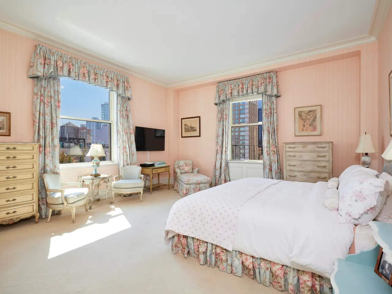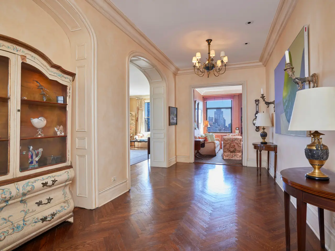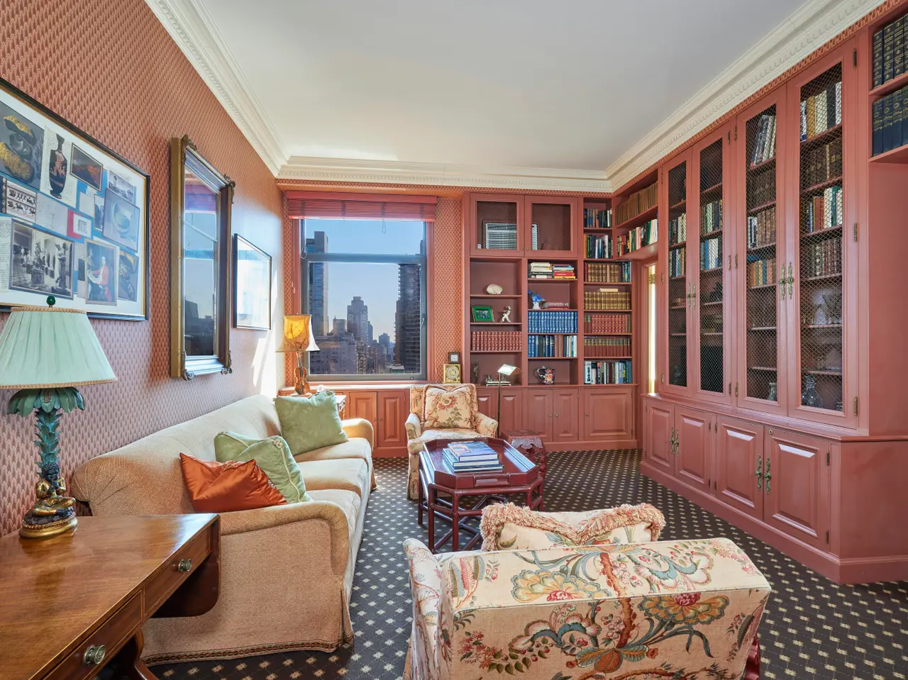 Grand, sun-flooded 3 bedroom residence with soaring 10+ foot ceilings and panoramic skyline views of Park Avenue and beyond -- reaching all the way to the East River. This elegant home is abound with classic pre-war details featuring: crown, dental and chair rail moldings, beautiful herringbone floors, oversized windows and copious closet space. One enters from the semi-private elevator landing into a stately formal entry gallery where a paneled archway leads to the 27-foot, expansive corner living room, with multiple seating areas and a marble-mantled gas fireplace. The traditional formal dining room is accessed from the living room through pocket doors, making this sublime home perfect for large or intimate entertaining. Off the dining room is a spacious windowed kitchen with glass-front cabinets and granite countertops replete with a sizeable walk-in pantry. On the far side of the gallery is the well-appointed library lined with custom bookcases, built-ins and a charming dry bar. The shared en-suite bath connects to the spacious second bedroom with light-filled Eastern views. A long, private hallway lined with mirrored floor-to-ceiling wardrobes accesses the enormous corner primary bedroom with walk-in closet and a luxurious en-suite bath. There is central air in the public rooms and a basement storage unit is included. Can be combined with neighboring apartment 16AE to create a full floor residence. Built in 1917 by renowned architect J.E.R. Carpenter, 550 Park Avenue is one of the City's premier, full-service co-ops in close proximity to Central Park and the best shops and restaurants. Washer/Dryer and pets allowed. Up to 50% financing is permitted and a 3% flip tax is paid by the purchaser.