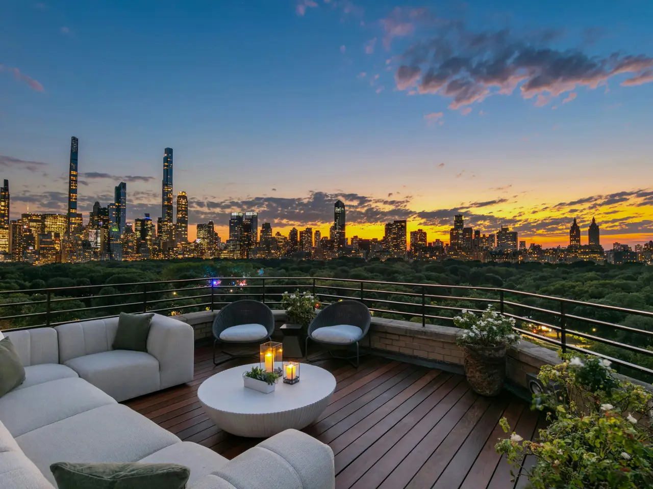 Perched atop 936 Fifth Avenue, this recently updated three-bedroom penthouse is a true gem, offering unparalleled Central Park vistas and an abundance of natural light. The fully renovated, duplex spans 3,800 square feet of exquisite interior space, complemented by over 2,400 square feet of private outdoor terraces. A private elevator opens directly onto the 18th floor, where you're greeted by a stunning marble-clad gallery with double-height ceilings and a sweeping marble staircase. The residence features a series of lush, landscaped wrap-around terraces that enhance every principal room with green, panoramic views. The grand living room is a highlight, boasting a bay window with sweeping westward views over Central Park and expansive northern and southern vistas. The elegant formal dining room impresses with its parquet de Versailles flooring and exquisite boisserie. A floor to ceiling corner window was just added in a recent renovation, offering open Eastern exposures. Adjacent to this is a sun-drenched breakfast room with heated floors, and folding glass doors opening to the Southern terrace. The entire first floor boasts soaring 10'+ ceilings throughout. The chef's kitchen is a culinary dream, outfitted with custom-designed Bulthaup cabinetry, a large Wolf stove, Miele ovens, and a Sub-Zero refrigerator, all framed by open, airy views. A stylish powder room completes the public spaces. The main bedroom suite, located on the lower floor, offers stunning Central Park views and direct terrace access. Its spacious en-suite bathroom features heated marble floors, double sinks, a large soaking tub, and a shower, all finished in luxurious onyx. Additionally, there are two generously sized bedrooms on the first floor, each with en-suite bathrooms, ample closet space, large windows, and terrace access. Upstairs, the library/media room is a standout feature, equipped with a surround sound system and blackout shades. It offers another bay window and three additional large windows with single-pane fenestration. This level also provides access to a west- and north-facing landscaped terrace, complete with a grill, refrigerator, and ice maker, ideal for al-fresco dining. The upper floor includes a staff room, a half bath, and a sizable outdoor laundry room. The apartment is enhanced with five-zone central air conditioning, new windows and doors with insulated glass for soundproofing and weather resistance, a Crestron/Lutron system, as well as waterproofing and irrigation systems for the terraces. An ADT security system is also installed, and the apartment is wired throughout. Built in 1955, 936 Fifth Avenue is situated at the southeast corner of 75th Street and Fifth Avenue. The building provides white-glove service, including a full-time doorman, elevator attendant, resident manager, fitness center, and laundry room. Up to 50% financing is permitted, with a 4% flip tax payable by the buyer.