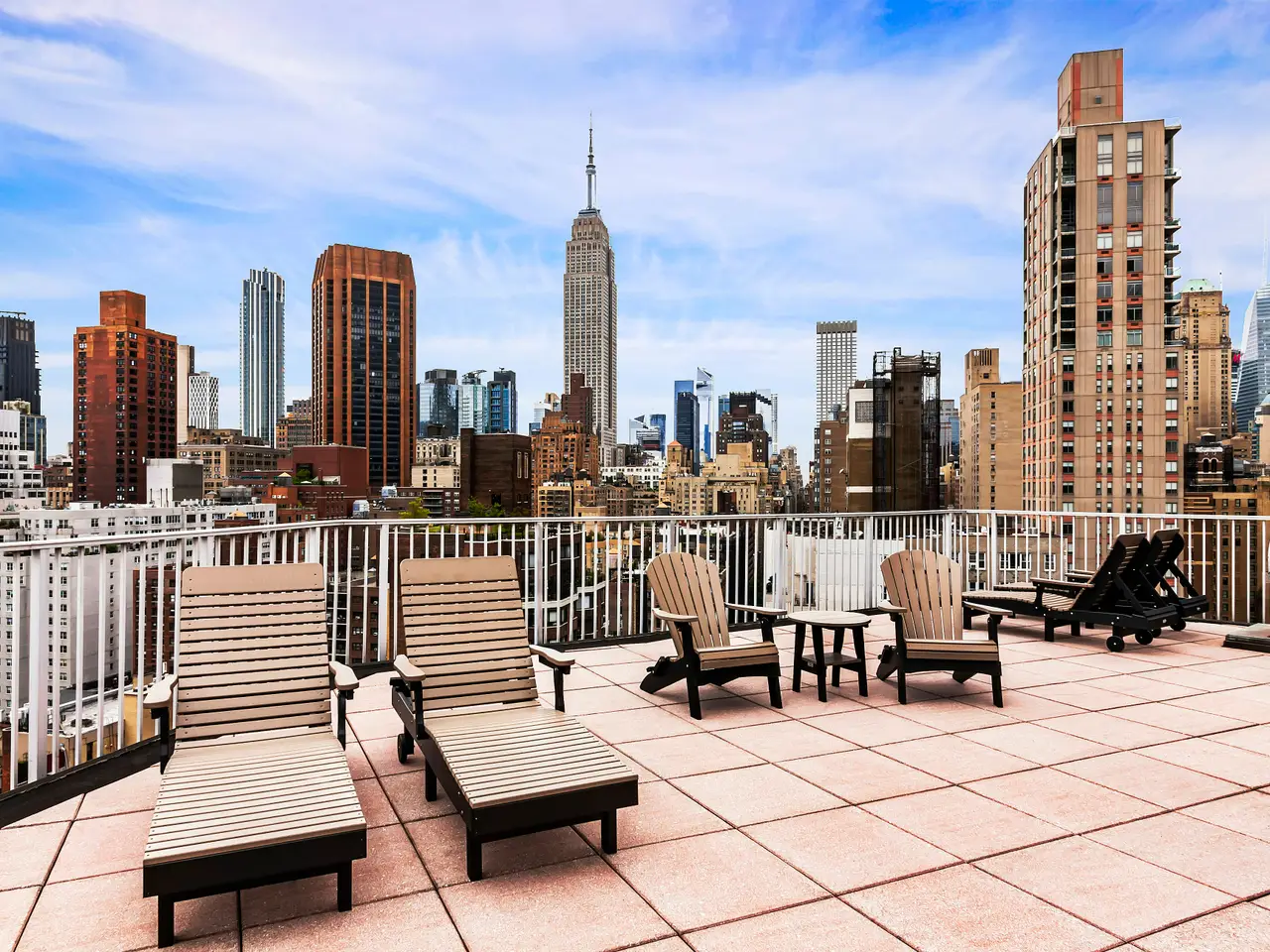 Private Outdoor Space with Iconic Views! This renovated 2-bedroom, 2-bath apartment perched high up on the 18th floor offers stunning south and west views of Midtown and Hudson Yards. Enjoy sunsets from your private terrace, large enough for a table and chairs. The perfect place for morning coffee or evening wine. The kitchen was fully renovated just a few years ago and features full-size appliances, including a Bosch dishwasher, Caesarstone quartz countertops, subway tile backsplash, and a bar-height pass-through counter. The expansive 28-foot living room easily accommodates a dining area, sectional sofa, plus desks. Both bedrooms are generously sized: the primary fits a king bed and includes an en-suite bath with a stall shower; the second fits a queen and additional furniture. There are 6 closets (including 2 walk-ins), all with new doors. Both bathrooms have windows-one with a tub, the other a shower. Three recently replaced PTAC units feature Bluetooth-enabled smart thermostats. Maintenance includes heat, hot water, gas, and A/C-rare in NYC! The Murray Hill Crescent is a full-service co-op with a 24-hour doorman, roof deck with Empire State and Chrysler Building views, updated lobby and hallways (no assessment needed), laundry room, live-in super, storage units, and garage (recently renovated to comply with Local Law 126). Pied-à-terre, co-purchasing, gifting, and subletting (after 3 years) allowed. Pets welcome! Prime location close to Fairway, Trader Joe's, Target, and the upcoming Lidl. Easy access to the 6 train at 33rd St, Grand Central (4/5/6, 7, Metro-North), and East River Ferry to Wall St., Brooklyn, and Sandy Hook, NJ.