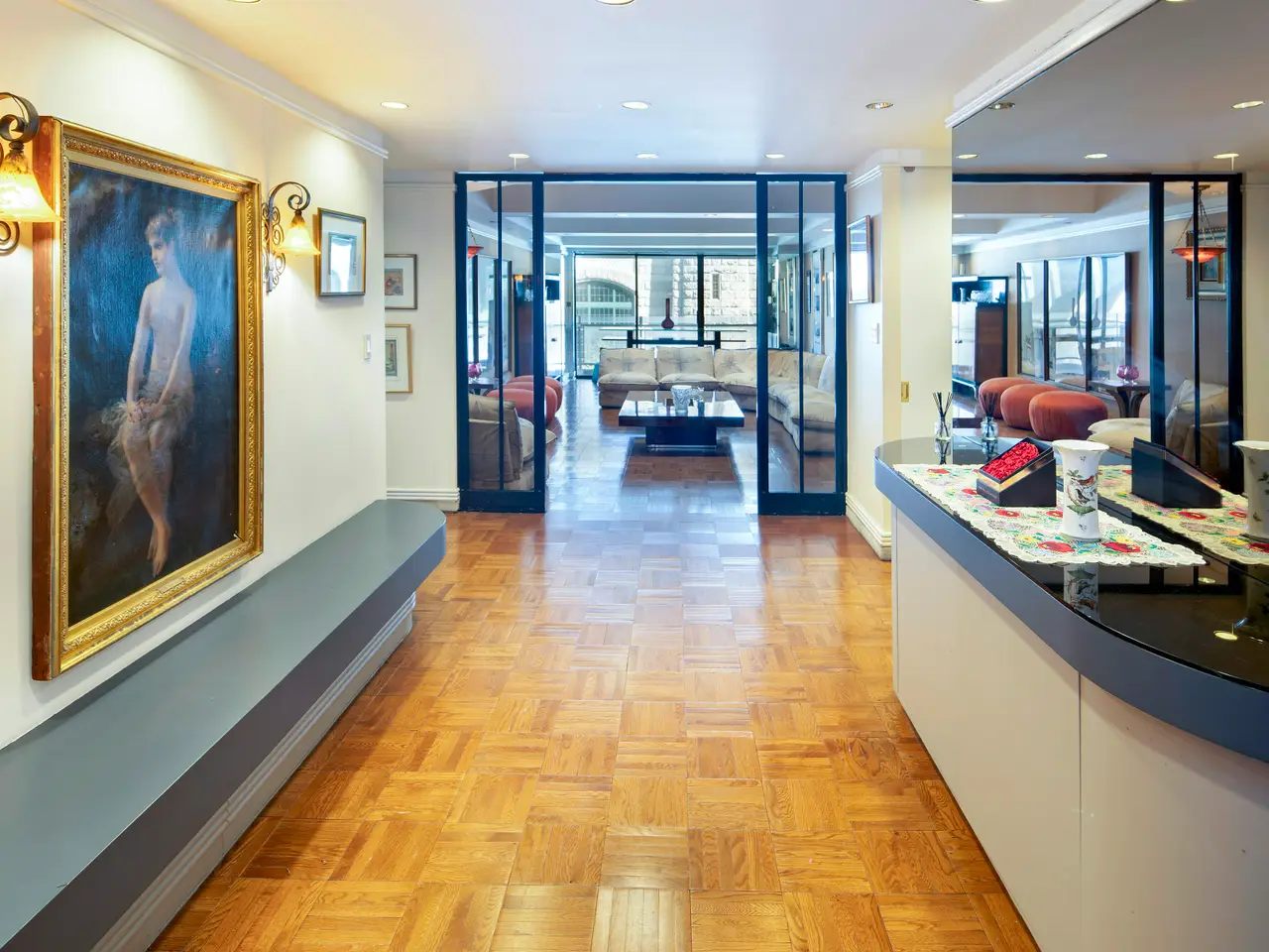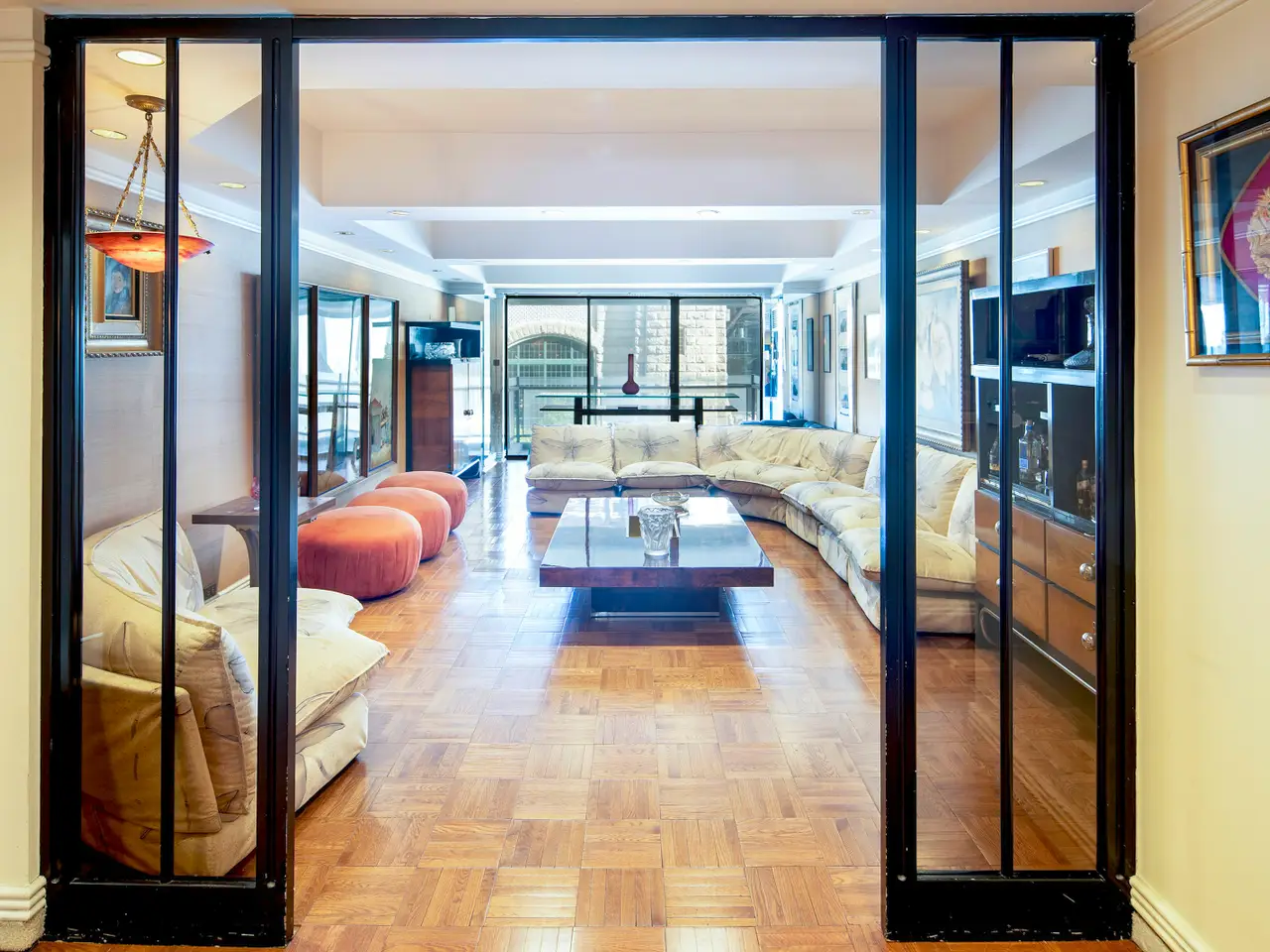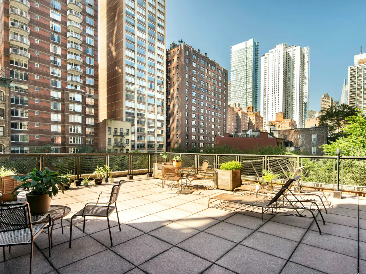 Spacious, sunny outdoor living can be yours in this 2400 sq. ft. classic 6 with a balcony plus a huge 24 ft. x 27 ft. south and west facing patio perched on the third floor of this luxury cooperative. Enter this fabulous home from a semi-private landing into a gracious foyer with a 65 ft. expanse from the north facing living room with a large balcony to the south facing formal dining room which opens to an astonishing patio with space for lounging, entertaining and playing. Two large split primary bedrooms offer walk-in closets and ensuite marble baths one of which offers windows overlooking your private outdoor space. The windowed kitchen has a pantry and washer/dryer and the third bedroom/staff room has a private bath. When The Sovereign was built in 1974, Paul Goldberger of The New York Times noted, "The Sovereign is in the super luxury category." The Emory Roth designed building has a lobby that "extends under the entire building, and there are four semiprivate halls per floor - a welcome (and expensive) alternative to the long, double loaded corridor. Such an arrangement has probably not been used in any New York building since the nineteen-thirties." Then as now, with only two apartments per floor, the residents are treated to impeccable world class service is provided by the staff that includes sentry, doorman, concierge, on-site management, valet parking, and more. The Sovereign is one of the most renowned post war cooperatives. The elegant and impressive International Style lobby has soaring ceilings accented by the sparkle of hand-blown 1950's Venini chandeliers, designed by the Italian Architect Carlo Scarpa. Enhancing the mid-century lobby are its original Rosewood panels, travertine marble floors and collection of curated paintings. Enjoy the lobby level gym, 24 hr. valet garage with Tesla charges and wonderful luxury service including on-site management. There is a bike room and private storage. The Board permits pets (up to two dogs). Pied-a-terre and purchase in a Trust and LLC's are permitted with Board Approval.