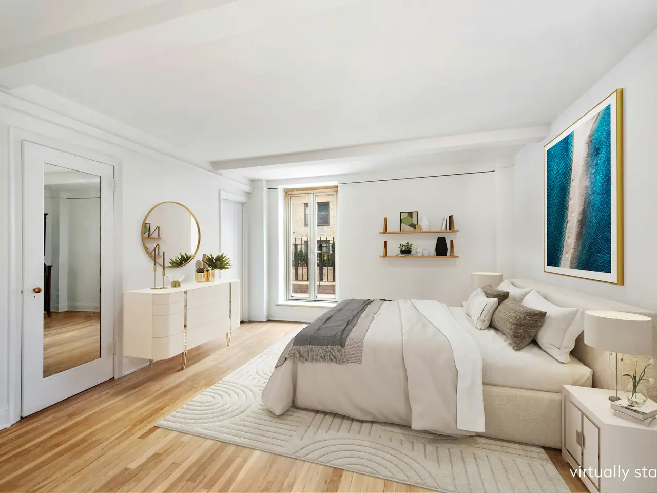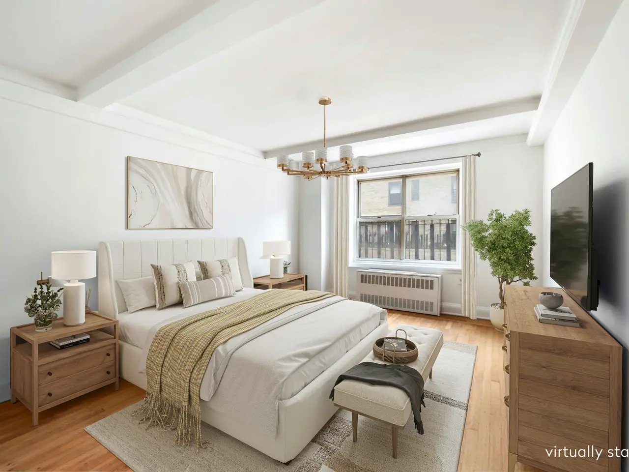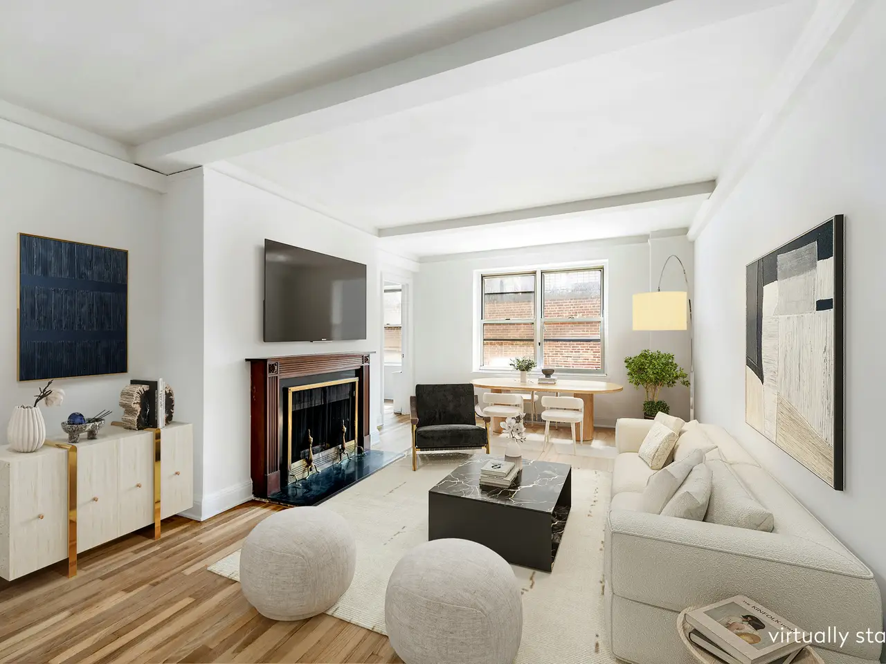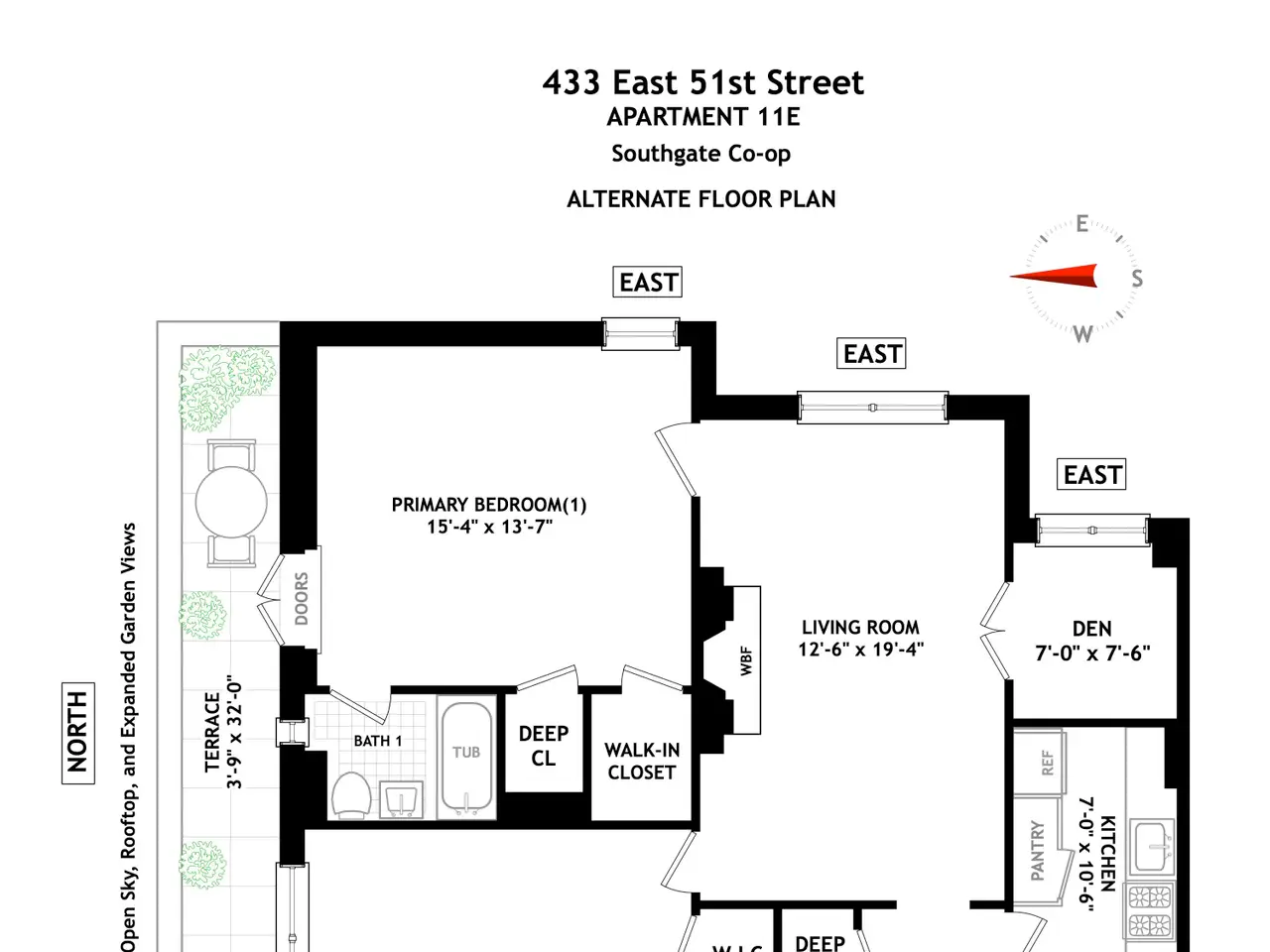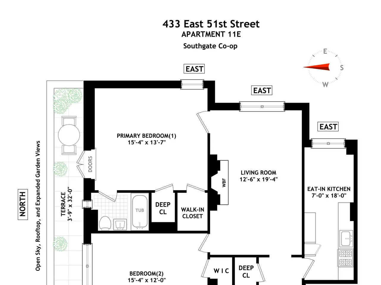 All photos virtually staged. Bring your contractor to Apt. 11E, a graciously sized 2BR/2BA unit located in the Southgate community. At approximately 1,140 square feet (per draftsperson), this corner unit offers the perfect footprint from which your ideal home or getaway can be imagined. Not to be missed, 11E offers: - Private 32 foot long terrace which spans across both bedrooms - Large living room with wood burning fireplace - Generously sized primary bedroom which comfortably fits a king-size bed with seating area, and boasts an en suite bathroom, walk-in-closet and second deep closet - A well-proportioned second bedroom which can also accommodate a king-size bed and includes an en suite bathroom and large walk-in closet - Amply sized, windowed eat-in kitchen which can be opened to the living room or configured into a windowed, third bedroom/den/office - A welcoming entrance gallery with two large closets - Double exposures (north and east) - Newly sanded hardwood flooring - Incredible pre-war detailing - In unit washer/dryer permitted with approval - Central air permitted with approval One of the apartment's standout features is the expansive 32 ft. north facing planter terrace from where you will enjoy open sky, iconic rooftop, and charming Southgate garden views. An ideal spot for morning coffee or conversations in the twilight. Designed by the renowned architect Emory Roth in collaboration with developers Bing and Bing, this pre-war, white glove cooperative affords you an attentive full-time doorstaff, live-in resident manager, landscaped gardens, laundry room, bike room, add'l storage (when available), and onsite building management. The co-op allows 80% financing, guarantors, pied a-terre ownership and subleasing . Electricity is included in the maintenance. This is a pet friendly community. Ideally positioned in the tranquil, tree-lined enclave of historic Beekman Place, 11E offers unmatched access to serene parks, dog runs, and the East River Greenway Promenade, all while being just moments away from Midtown's celebrated restaurants, shops, and cultural institutions. The Southgate complex comprises five pre-war cooperative buildings situated along East 51st and 52nd Streets, between First Avenue and the East River. A distinctive feature of the Southgate complex is its beautifully maintained park-like private gardens. These lush, landscaped areas provide residents with serene green spaces, enhancing the community's appeal and offering a peaceful retreat from the bustling city environment. A capital improvement assessment of $462.15/month through July 2027 is to be paid by the seller at closing. A 2% flip tax is to be paid by the buyer.