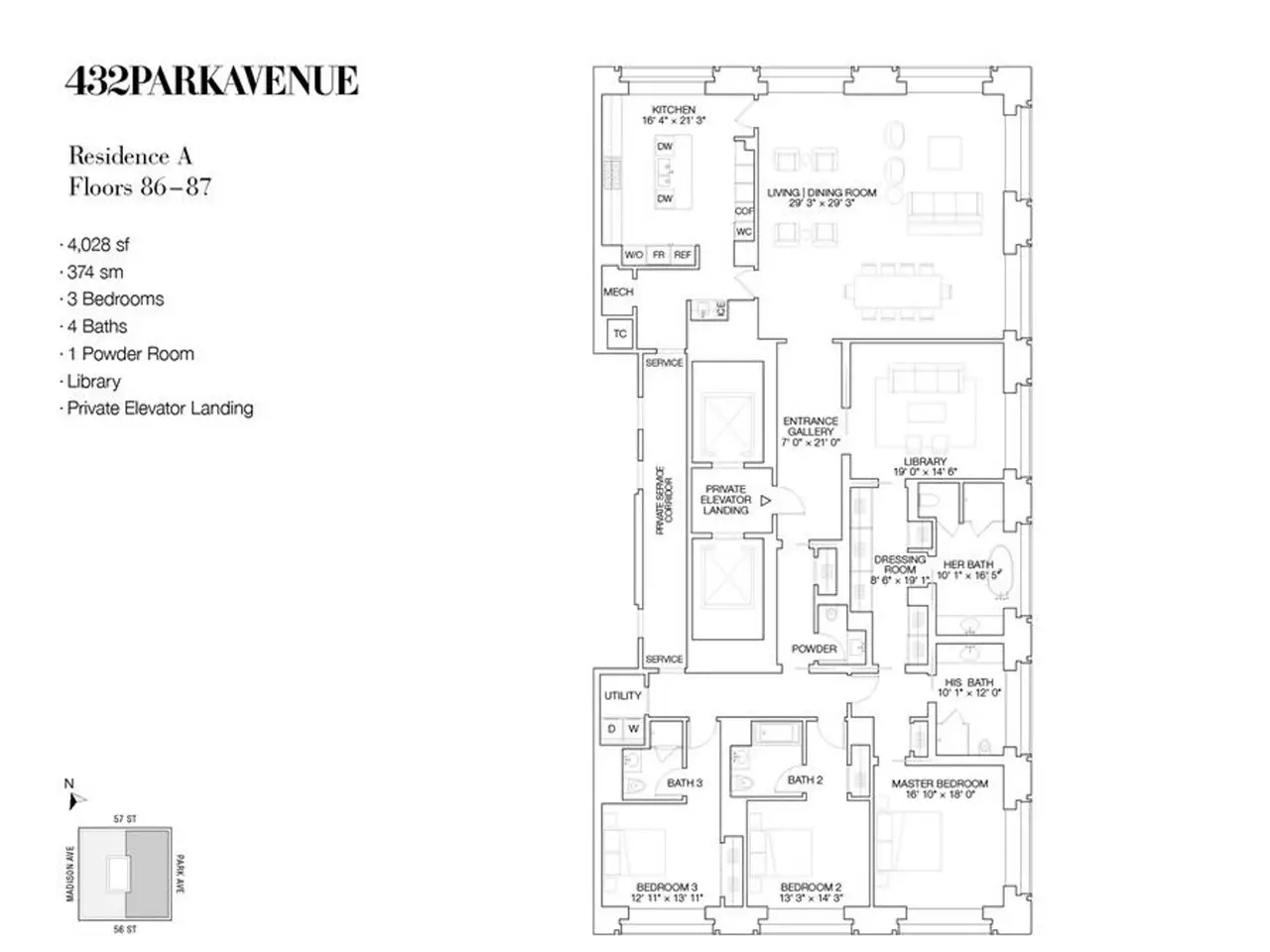 This spacious 4,028 square foot, three-bedroom residence with library and 4.5 baths is a spectacular oasis from which to view the city. The apartment features 12'-6' ceilings, expansive 10x10 windows with stunning Eastern, Northern and Southern exposures and unobstructed views of Central Park. A private elevator landing opens onto a gracious entry gallery and a grand 29x29 corner living and dining room. The windowed eat-in kitchen includes a large center island, marble floors, marble countertops, white lacquer and natural oak cabinetry, Miele stainless steel appliances and Dornbracht chrome fixtures. The corner primary bedroom suite boasts two windowed full primary bathrooms with marble floors and walls, marble vanities, custom wood cabinetry, freestanding soaking tub and glass shower, radiant heated floors and Dornbracht bath fittings. The two additional south facing bedrooms both feature en suite baths. Building amenities include a 24-hour doorman, concierge service, in-suite dining, 75-foot swimming pool, residents' lounge, fitness center with spa, massage rooms, sauna and steam rooms, yoga studio and conference room. Additionally, the building includes a library, screening and billiards rooms, an on-site parking garage and valet services.