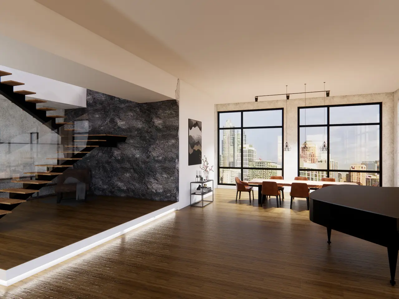 15-foot ceilings with floor-to-ceiling windows
