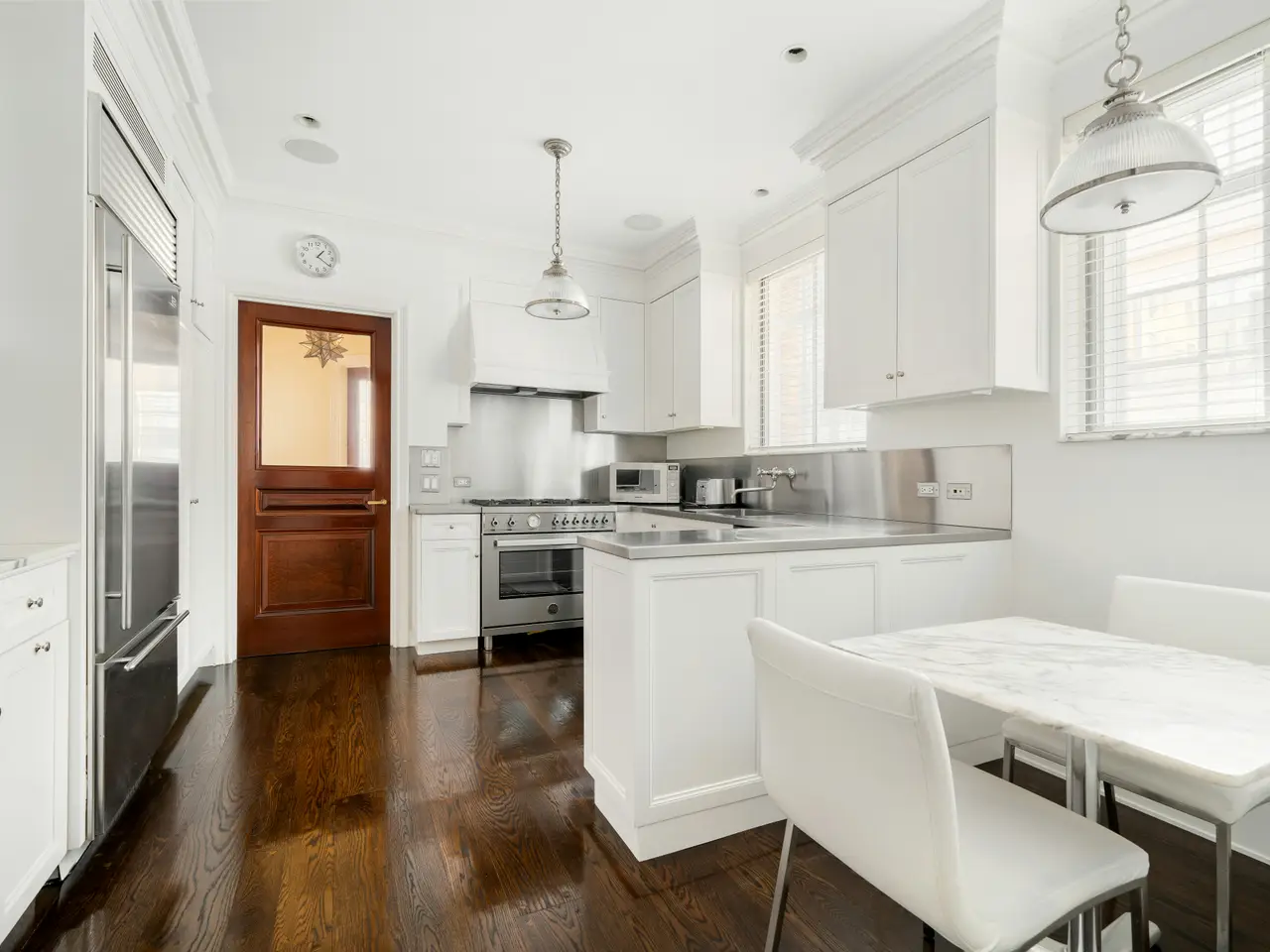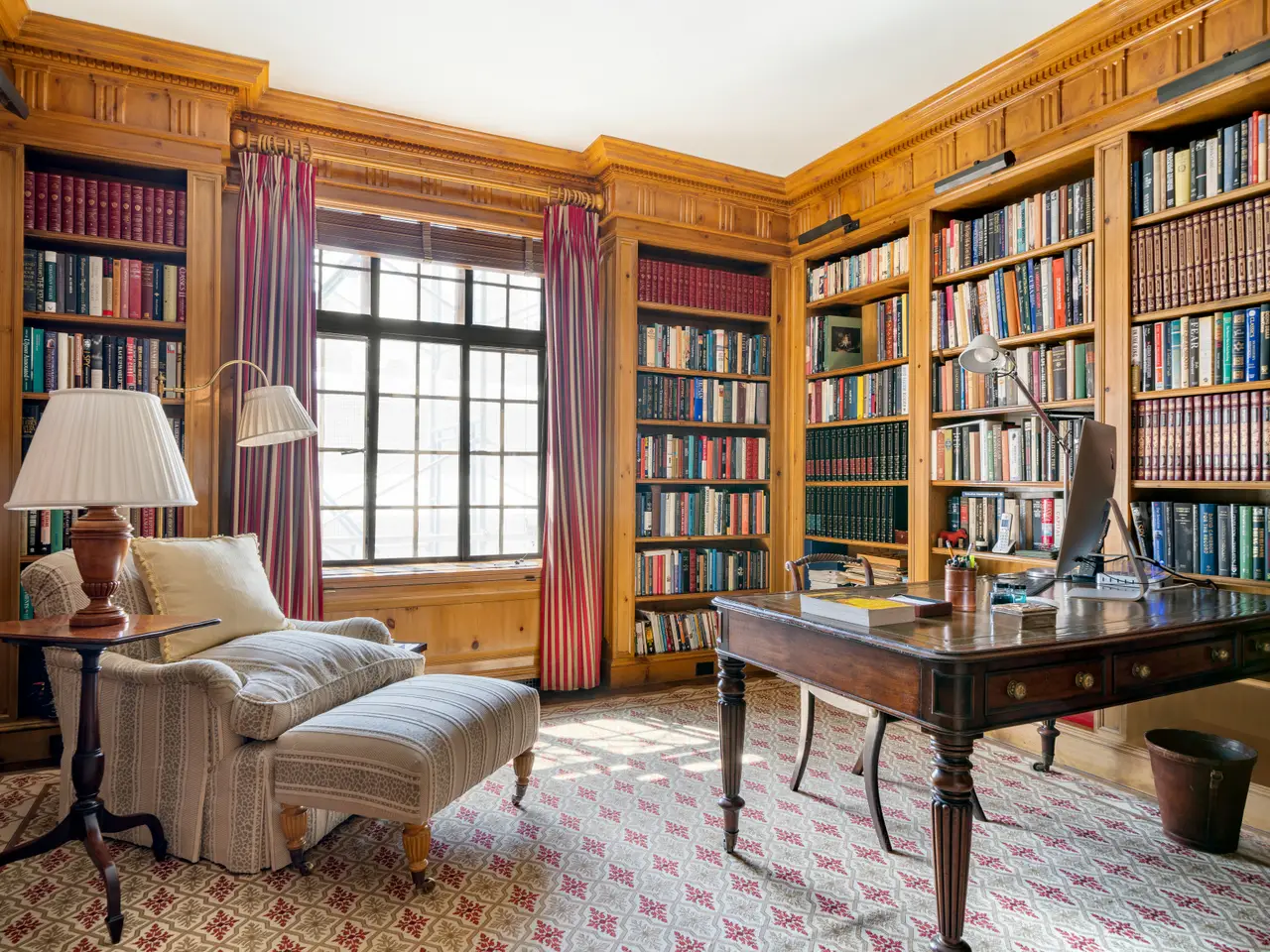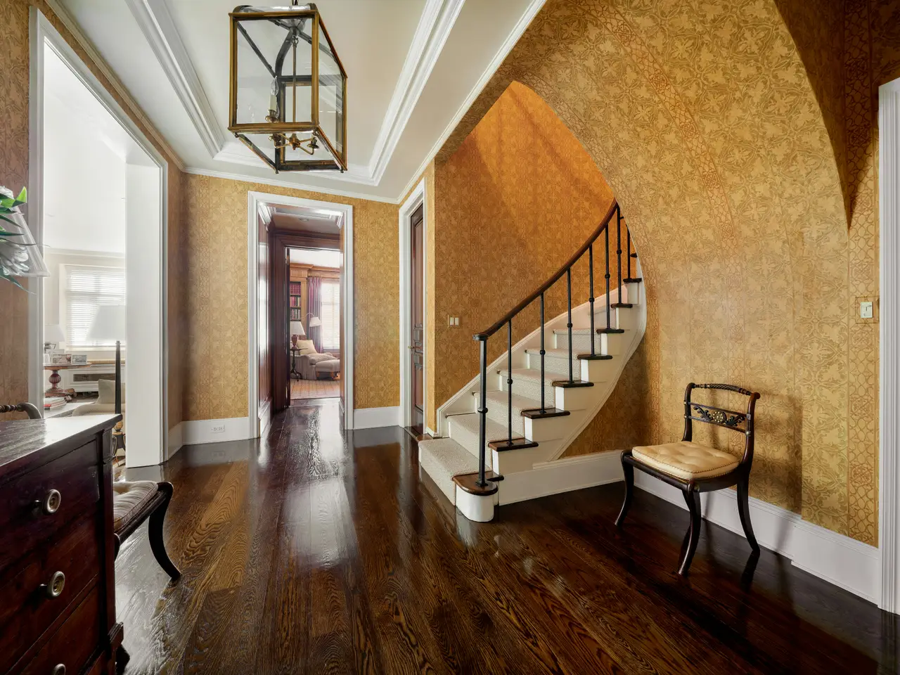 Newly renovated, glamorous duplex at Millan House. A foyer with a sweeping curved staircase provides the point of arrival for this elegant apartment. A step-down living room is entered through an archway, and has a wood burning fireplace, ten foot ceilings, and original casement windows, with sunny southern exposure over the roof of the landmarked Park Avenue Armory. A gorgeously pine-paneled library is adjoining, an ideal spot for cozy evenings or intimate gatherings. There is a huge cloak and powder room with a mahogany and marble vanity. A large and gracious formal dining room with parquet de Versailles floors and china closet faces north to Millan House's famed garden. All of the doors are figured mahogany with custom brass hardware. Beyond the dining room is a pantry with marble counters, ample storage, an under counter subzero wine fridge, two SubZero refrigerator drawers, and a sink and a bar. The pantry leads to a gourmet eat-in kitchen with a SubZero refrigerator, Miele dishwasher and brand new six-burner Bertazzoni vented chef's range. In the rear of the apartment is a full bath, a large and private guest bedroom and a wonderful laundry room with tons of storage. Ascending the staircase one arrives on the upstairs floor, also accessed by the passenger elevator. A large primary bedroom suite has a south-facing bedroom with lovely views over the Armory and the midtown skyline. The middle bedroom has been artfully transformed into a jaw-dropping dressing room with elegant mahogany built ins worthy of Saville Row. Beyond is a bathroom that transports one to the most elegant of London hotels, with a free-standing soaking tub, a large limestone shower with rainfall head, a separate water closet, a marble and mahogany vanity, and custom mahogany moldings and millwork throughout. A hallway leads to a very private and spacious guest suite, with a custom marble bathroom, eastern exposure over the garden, and ample closet space. The apartment is fully centrally air conditioned. Built by John D. Rockefeller in 1931, Millan House consists of two separate buildings connected by a two-level Italianate interior private garden courtyard, with a wonderful fountain and seating areas. Designed by architect Andrew J. Thomas with 57 apartments, the buildings have Romanesque details such as carved animal capitals and arched loggias. Pied-a-terres and pets are welcome. 3% flip tax by purchaser. Special assessment for Local Law 11 through 7/25 of $1897 a month.