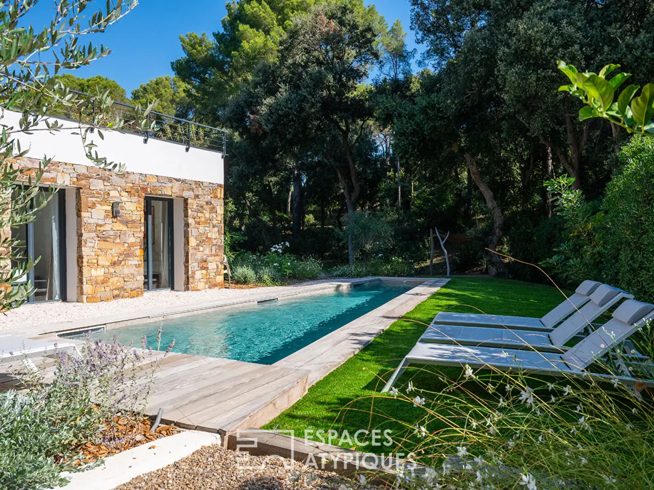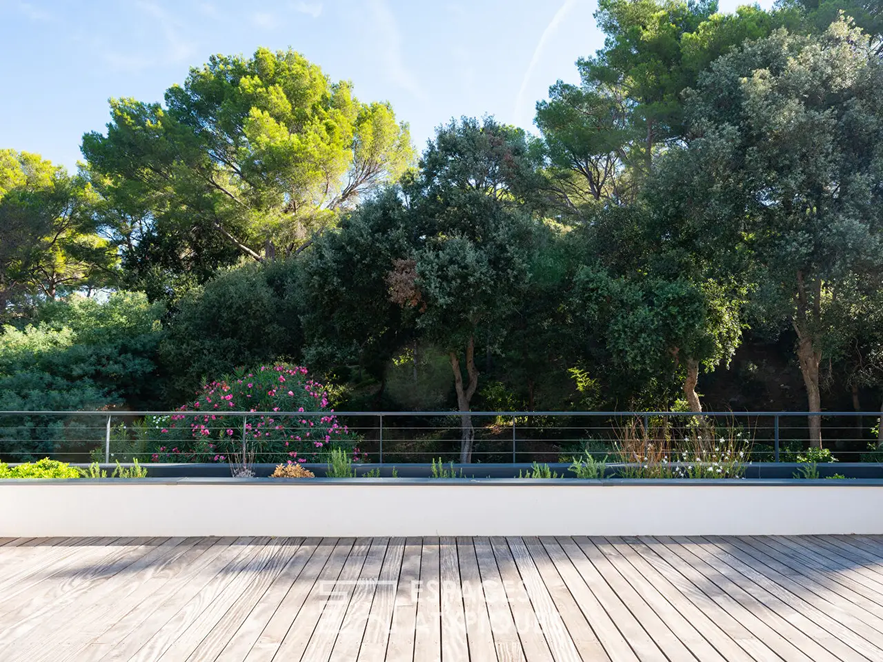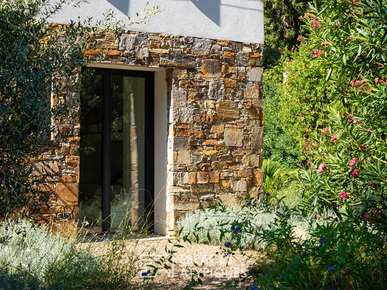 Maison d'architecte Just steps from the lapping sea, in the exclusive and unspoiled Cap Benat estate, stands an architect-designed villa that reimagines luxury living. With its clean lines and rooftop terraces, it blends perfectly into the landscape, enhanced by the Bormes stone cladding, which gives it remarkable authenticity. On a plot of over 1,700 sqm, this 258 sqm residence offers an art of living on two distinct and complementary levels. The ground floor opens onto a spacious and bright living room. The Bormes stone flooring blends with an ultra-modern kitchen. Its marble countertop is in keeping with the contemporary lines of the property. This space is completed by two comfortable suites, each with its own bathroom, for single-story comfort, as well as an ideal dormitory for children. The staircase, a sculptural element, is a highlight of the interior design. Made of chalky white polished concrete, it creates a seamless transition to the upper level. This floor is dedicated to reception. It reveals a master suite with direct access to a vast teak terrace, a children's bedroom and its bathroom, a bright office, as well as a separate studio. The latter, modular, offers an additional double bedroom, making this villa a perfect place to welcome family and friends in complete serenity. Outside, the spirit of the villa continues. A 13-meter heated swimming pool borders multiple terraces and a meticulously landscaped garden with Mediterranean species. The rooftop terrace offers a wide panorama of the garden and the surrounding nature, inviting absolute calm. The Domaine du Cap Benat, with its 24-hour security and its secret coves, guarantees absolute tranquility and security. A rare property, a symbiosis of raw and refined materials and an exceptional geographical location. DPE in progress Marie-Laure REF. 12840 Additional information * 8 rooms * 6 bedrooms * 1 bathroom * 4 shower rooms * 1 floor in the building * Outdoor space : 1737 SQM * Parking : 4 parking spaces * Property tax : 2 398 € Energy Performance Certificate Primary energy consumption b : 74 kWh/m2.year High performance housing