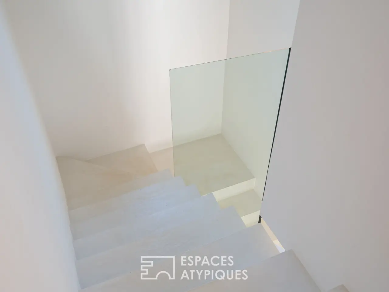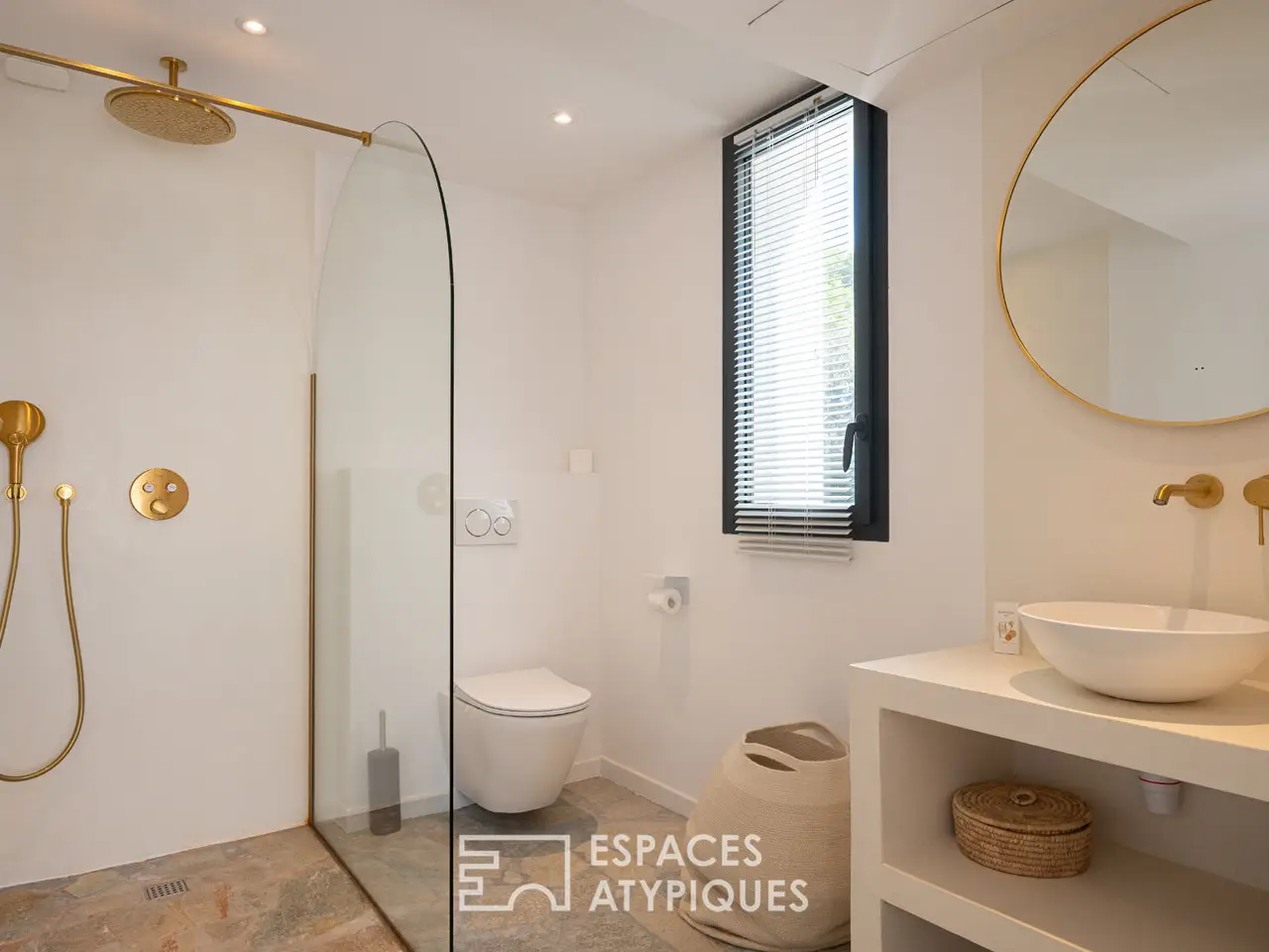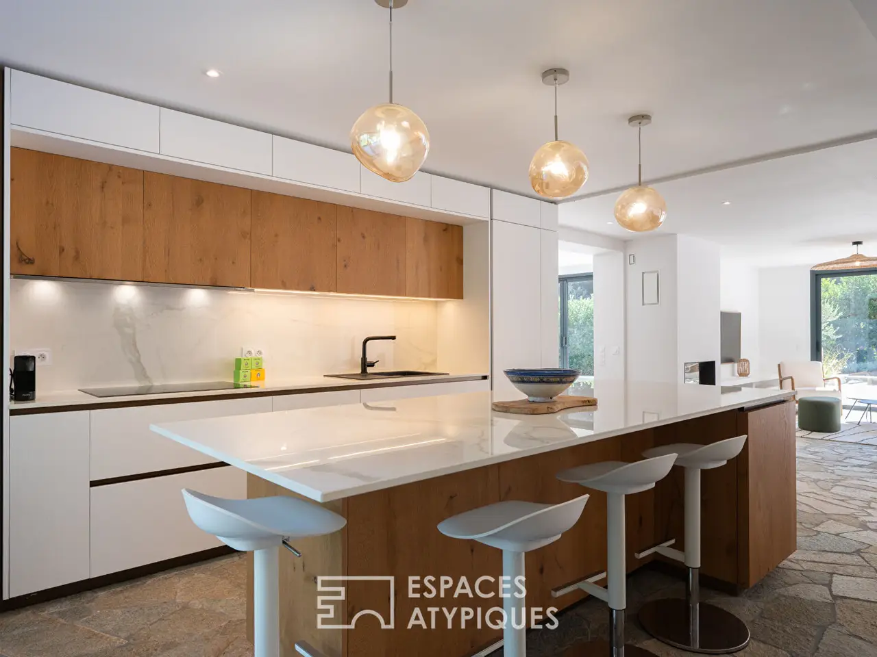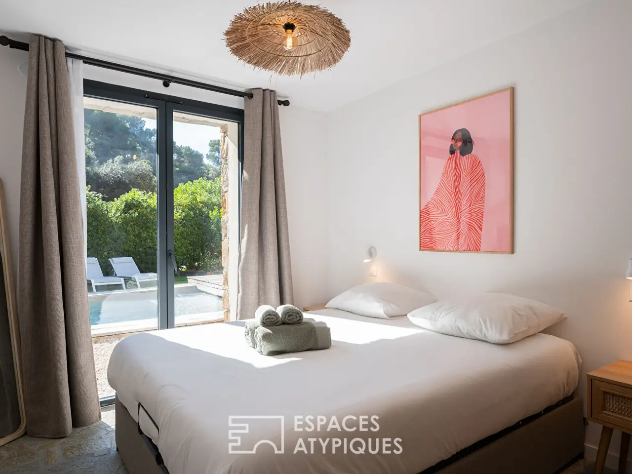 Maison d'architecte Just steps from the lapping sea, in the exclusive and unspoiled Cap Benat estate, stands an architect-designed villa that reimagines luxury living. With its clean lines and rooftop terraces, it blends perfectly into the landscape, enhanced by the Bormes stone cladding, which gives it remarkable authenticity. On a plot of over 1,700 sqm, this 258 sqm residence offers an art of living on two distinct and complementary levels. The ground floor opens onto a spacious and bright living room. The Bormes stone flooring blends with an ultra-modern kitchen. Its marble countertop is in keeping with the contemporary lines of the property. This space is completed by two comfortable suites, each with its own bathroom, for single-story comfort, as well as an ideal dormitory for children. The staircase, a sculptural element, is a highlight of the interior design. Made of chalky white polished concrete, it creates a seamless transition to the upper level. This floor is dedicated to reception. It reveals a master suite with direct access to a vast teak terrace, a children's bedroom and its bathroom, a bright office, as well as a separate studio. The latter, modular, offers an additional double bedroom, making this villa a perfect place to welcome family and friends in complete serenity. Outside, the spirit of the villa continues. A 13-meter heated swimming pool borders multiple terraces and a meticulously landscaped garden with Mediterranean species. The rooftop terrace offers a wide panorama of the garden and the surrounding nature, inviting absolute calm. The Domaine du Cap Benat, with its 24-hour security and its secret coves, guarantees absolute tranquility and security. A rare property, a symbiosis of raw and refined materials and an exceptional geographical location. DPE in progress Marie-Laure REF. 12840 Additional information * 8 rooms * 6 bedrooms * 1 bathroom * 4 shower rooms * 1 floor in the building * Outdoor space : 1737 SQM * Parking : 4 parking spaces * Property tax : 2 398 € Energy Performance Certificate Primary energy consumption b : 74 kWh/m2.year High performance housing
