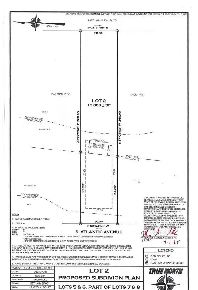 Oceanfront Lot - Rare Offering! This 50' x 260' parcel presents a unique chance to create your ideal beach retreat with unobstructed ocean views and your own dune crossover just steps from the backyard. Wake up to spectacular sunrises, spend carefree summer days on the sand, and unwind to the sound of the waves each evening. Ideally located just a short walk from downtown Bethany's restaurants, shops, and boardwalk, this property offers both tranquility and convenience-leave the car behind and enjoy everything by foot. Opportunities to own an oceanfront lot in Bethany are exceedingly scarce-don't miss your moment to make this coastal dream a reality. Existing home will be removed, and the property will be subdivided prior to settlement.