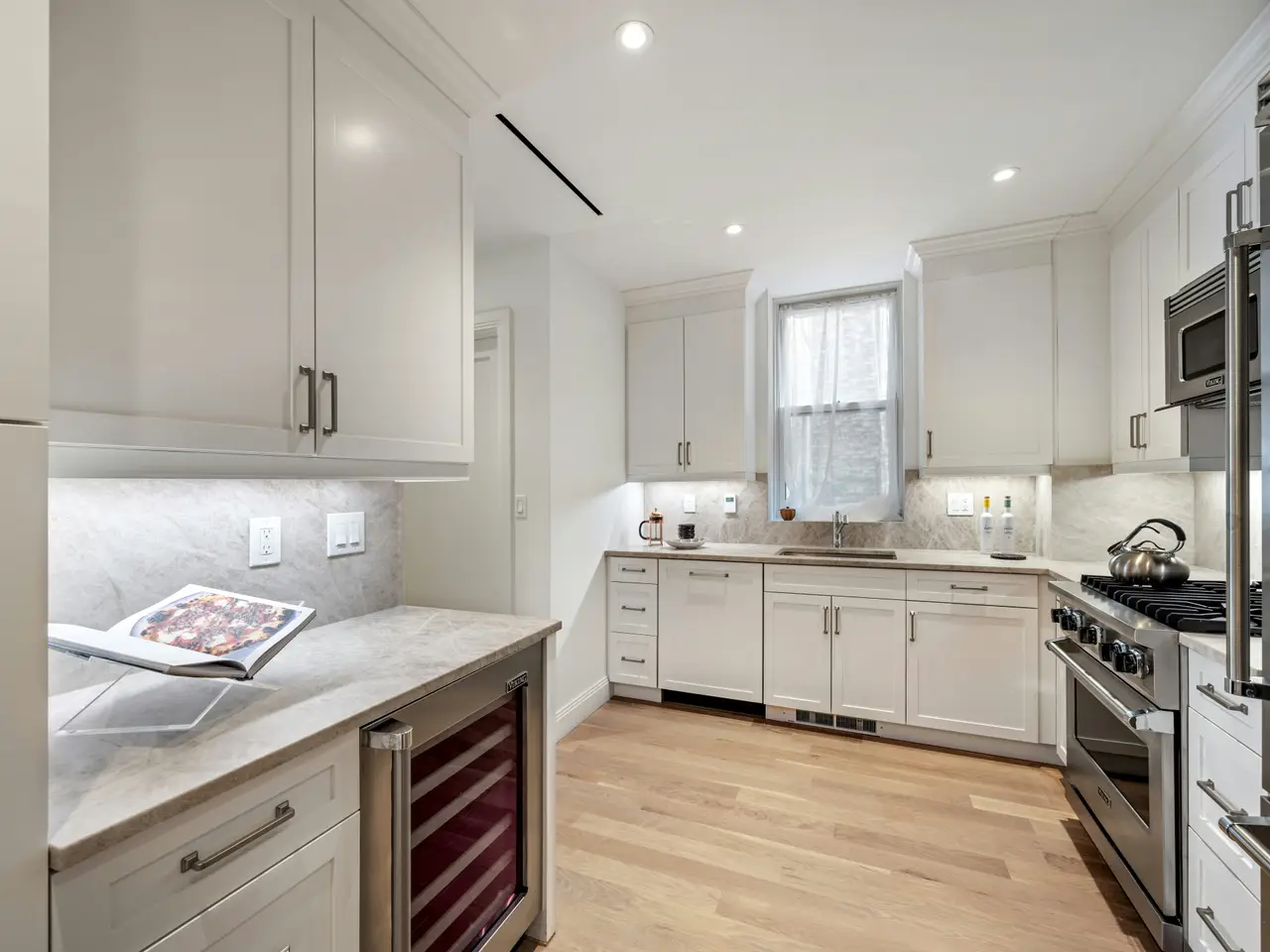 Sponsor Sale - No Board Approval Required! Apartment 9C at 1150 Fifth Avenue is a reimagined classic six by J. E. R. Carpenter with three bedrooms, an office, and three full bathrooms, boasting 10ft ceilings, moments from Central Park.A closet lined entry foyer flows to a sunny south facing living room anchored by a wood burning fireplace and tree lined views of 96th Street and Central Park. An adjoining dining area conveniently accommodates six. The private wing includes a serene north facing primary bedroom and a spa like ensuite bath finished in Calacatta stone with a walk-in shower. Two additional bedrooms offer generous storage, and there is a second bath with a relaxing soaking tub. The windowed chef's kitchen is a showpiece with honed Taj Mahal stone counters and backsplash, custom Shaker cabinetry, and a full suite of Viking appliances. The adjacent dedicated office enjoys its own full bath, ideal for flexible guest use. South facing rooms are bathed in sunlight, while white oak strip floors run throughout, tying the layout together with warmth and character. A stacked washer and dryer are tucked away for convenience. Building amenities elevate daily life with a fitness room, a landscaped roof garden with Central Park views, and a bike room. Pets are permitted. Services are comprehensive with a door attendant on duty at all hours, a live in superintendent, and an experienced staff of porters and a handyman. Beyond the front door are the Reservoir, East Meadow playgrounds, and the Central Park Tennis Center. Turnkey and sponsor owned, 9C is ready for immediate occupancy in Carnegie Hill.