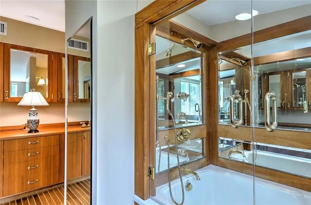 Teak and holly flooring in primary bathroom