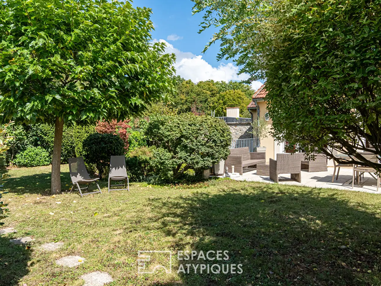 In a sought-after area, hidden from view, this pretty bourgeois house has benefited from a beautiful extension that opens onto a 722 sqm garden, enclosed and quiet. After a flight of steps, the wide entrance, decorated with cement tiles and old parquet flooring, offers a charming independent kitchen with triple exposure, then continuously, a 17 sqm bedroom which benefits from a shower room. The reception room of 44 sqm bathed in light, decorated with its fireplace, opens onto a large terrace surrounded by its garden beautifully arranged with flowers and shrubs subtly shaded. The lower level has a generous bedroom/workshop of 44 sqm facing its private terrace. This beautiful volume can easily be organized into a suite with its bathroom or into an office for an independent profession, with its exterior access. The first floor is organized around the landing which distributes three pretty bedrooms of 11, 12 and 17 sqm which share a bathroom. The last floor consists of a landing which leads to a large bedroom with storage of 23 sqm, an office and an attic games room of 18 sqm. Finally, the basement includes a boiler room, cellar and two storage rooms. The garden allows two above-ground parking spaces (electric terminal). A rare property, combining character, comfort and prime location, in a calm and green environment, in the immediate vicinity of many amenities. ENERGY CLASS: E / CLIMATE CLASS: E. Estimated average amount of annual energy expenditure for standard use, established from 2021 energy prices: between EUR5,040 and EUR6,880 Nursery and elementary schools 3 and 5 min walk away. N 13, A14 5 min by car, Tram 13 9 min on foot, International High School 9 min on foot, REF. 12700 Additional information * 8 rooms * 6 bedrooms * 1 bathroom * 1 bathroom * Outdoor space : 722 SQM * Parking : 2 parking spaces * Property tax : 3 294 € Energy Performance Certificate Primary energy consumption e : 278 kWh/m2.year High performance housing