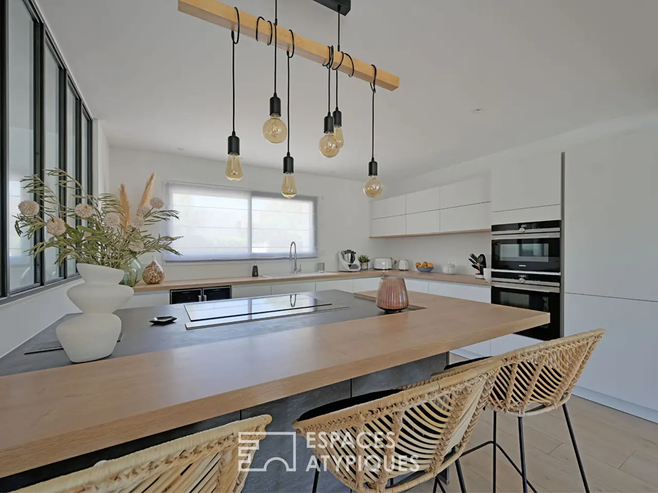 In the popular Pic St Loup area near Teyran, we offer you this elegant and refined villa nestled in a magnificent natural environment. Located very quietly, the villa offers 200 m2 of living space on a plot of 2,000 sqm including a buildable and separable annex garden of 470 sqm. As soon as you enter with a glass roof style, you discover through transparency generous and bright living spaces enhanced by a very modern and extremely warm decoration. An open kitchen with central island, combining aesthetics and quality, offers a practical and elegant culinary space. The large and bright living room opens very widely to the exterior spaces including a large and very friendly covered terrace, a real annex living room with a summer kitchen. Let's discover this splendid garden, a beautiful natural setting, adorned with sought-after plants, including a majestic olive tree approximately 600 years old, a symbol of serenity and longevity. A superb swimming pool with submerged beach, a spa and a wooden terrace with a solarium feel harmoniously completes the premises. On one level, the villa also offers an office as well as a large multifunctional room/laundry room. The first floor offers a very beautiful master suite of 35 m2, equipped with a dressing room and a private bathroom as well as two bright bedrooms and a bathroom. A tiled garage of more than 50 m2, a large courtyard, a bowling alley, a borehole and a recent photovoltaic installation further complete the premises. Nothing is missing and nothing is left to chance in this exceptional property combining luxury, comfort, nature and proximity (30 minutes from the airport or beaches, 20 minutes from Sommieres). ENERGY CLASS: B / CLIMATE CLASS: A Estimated average amount of annual energy expenditure for standard use, established based on energy prices for the year 2024: between EUR1,140 and EUR1,610. REF. 9817 Additional information * 6 rooms * 4 bedrooms * 1 bathroom * 1 bathroom * Outdoor space : 2000 SQM * Property tax : 2 038 € Energy Performance Certificate Primary energy consumption b : 80 kWh/m2.an High performance housing