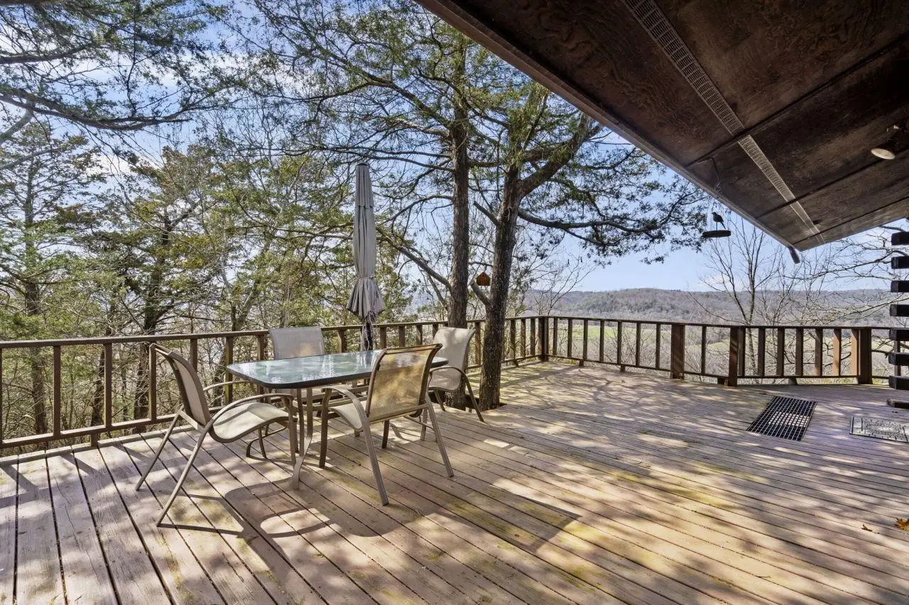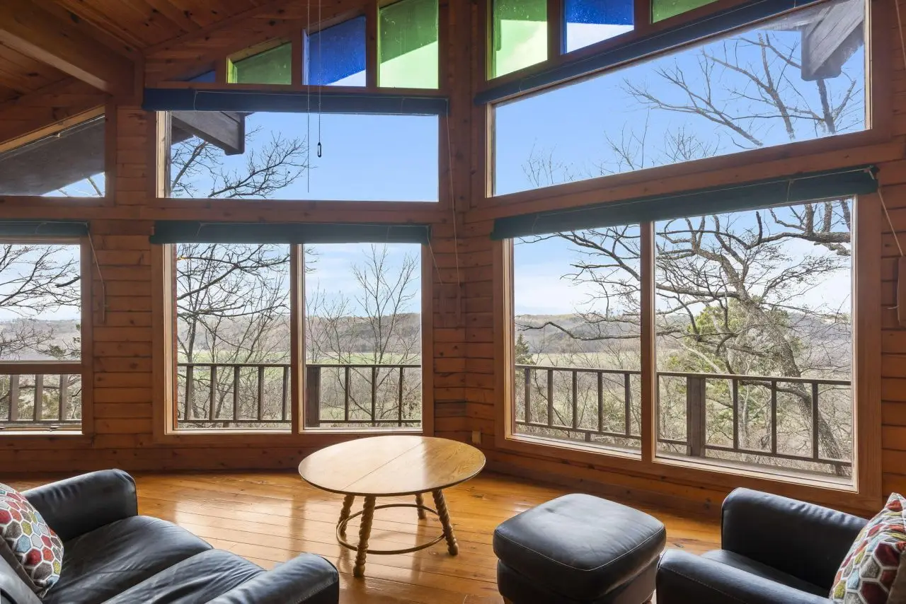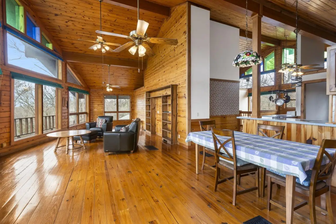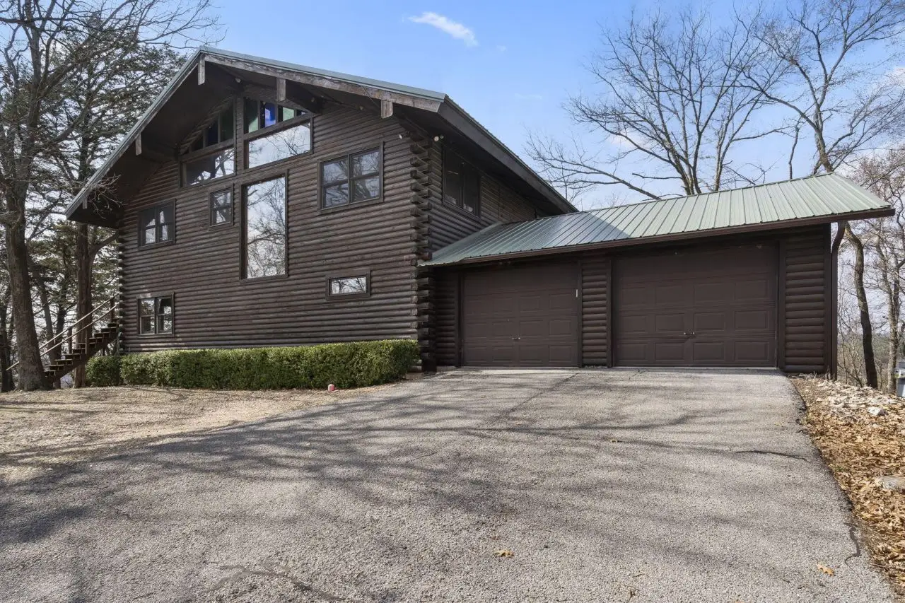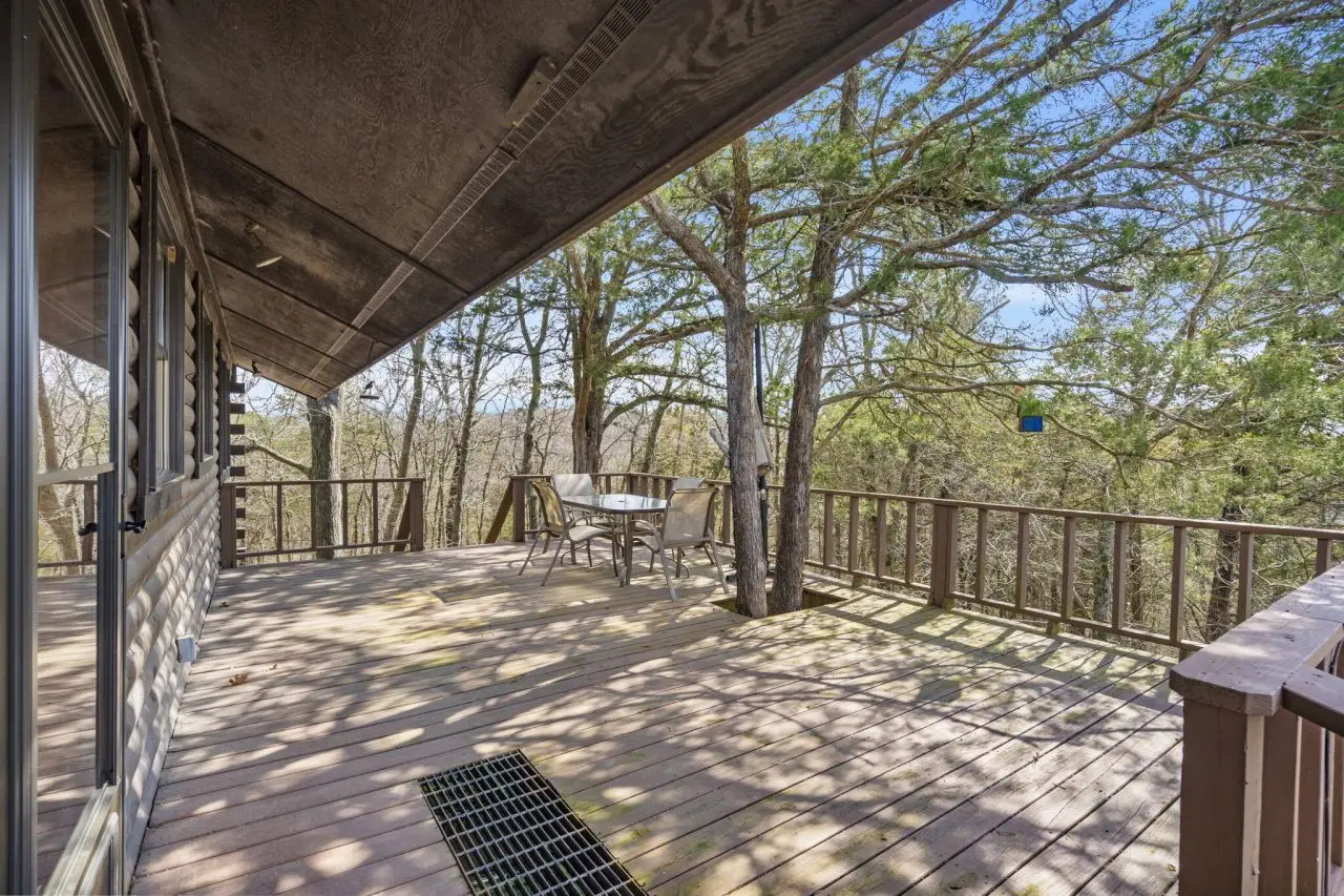 Private, peaceful and perfectly maintained--this two-story log home on 83 wooded acres offers a rare blend of rustic charm, modern comfort, and breathtaking natural beauty. Designed for exceptional mountain living, the home features an open concept main level with soaring vaulted ceilings, exposed wood beams and floor to ceiling windows that frame sweeping river and valley vistas. The spacious primary suite includes an ensuite bath, a custom walk-in closet and direct access to the wraparound deck--perfect for morning coffee while eagle watching and soaking in the serene privacy. Downstairs, you'll find two additional bedrooms, two full bathrooms, and a versatile workshop or hobby space, complete with a cozy wood-burning stove. A separate, fully renovated 1 bed/1bath guest house provides excellent privacy--ideal for visiting family, rental income, or remote work. Both addresses are move in ready and include all appliances. The oversized two-car garage offers ample storage. The property shares a paved driveway with one neighboring home but maintains a strong sense of seclusion throughout. The 83 acre parcel features mature hardwood forest, gently rolling hills and an elevated terrain overlooking the scenic Elk River Valley. Whether you're seeking a peaceful homestead, a weekend retreat, or simply a place to unwind and reconnect with nature, this property offers a rare opportunity--just a short, scenic drive to Bella Vista and Bentonville for easy access to shopping, dining and amenities.