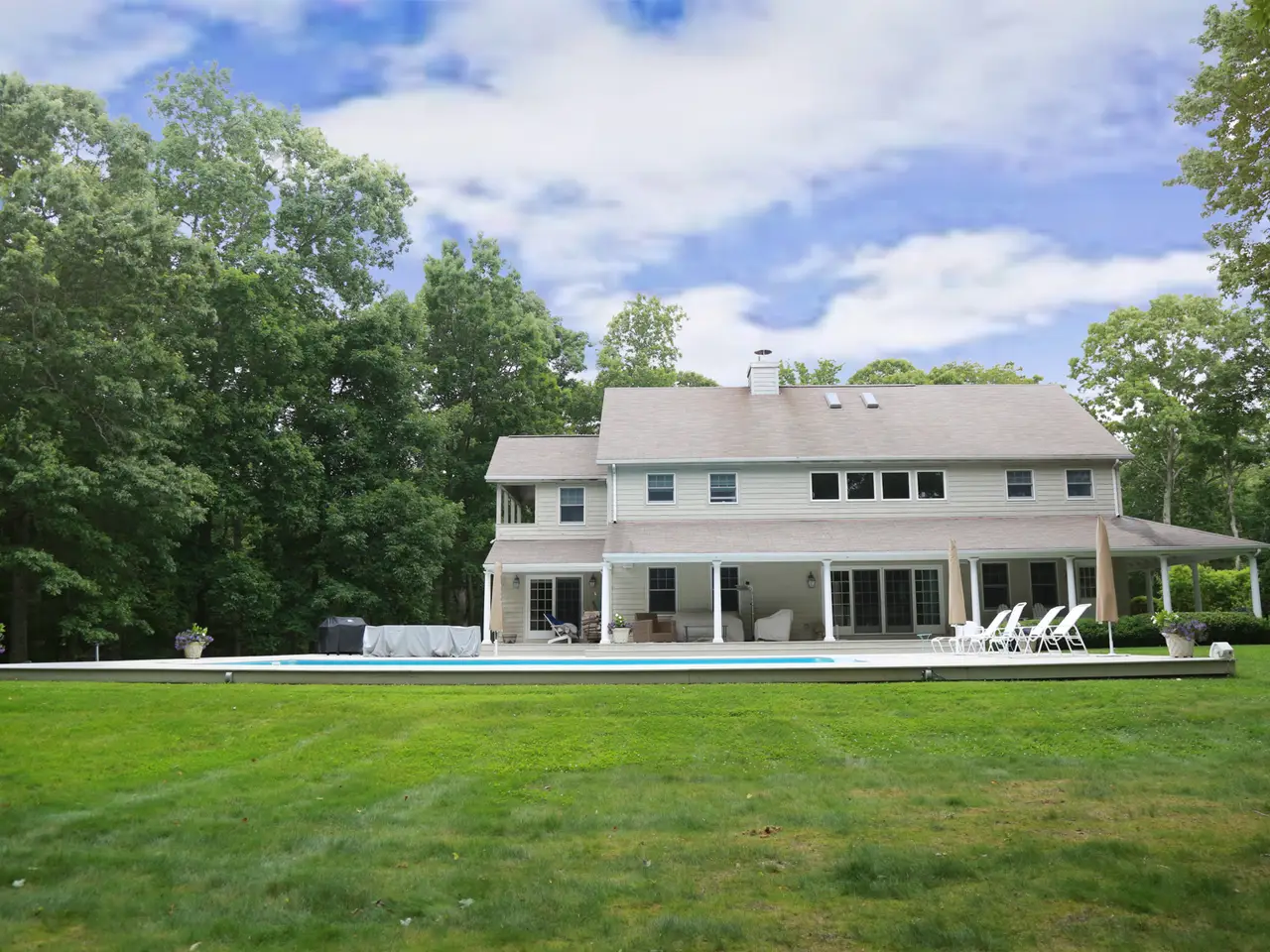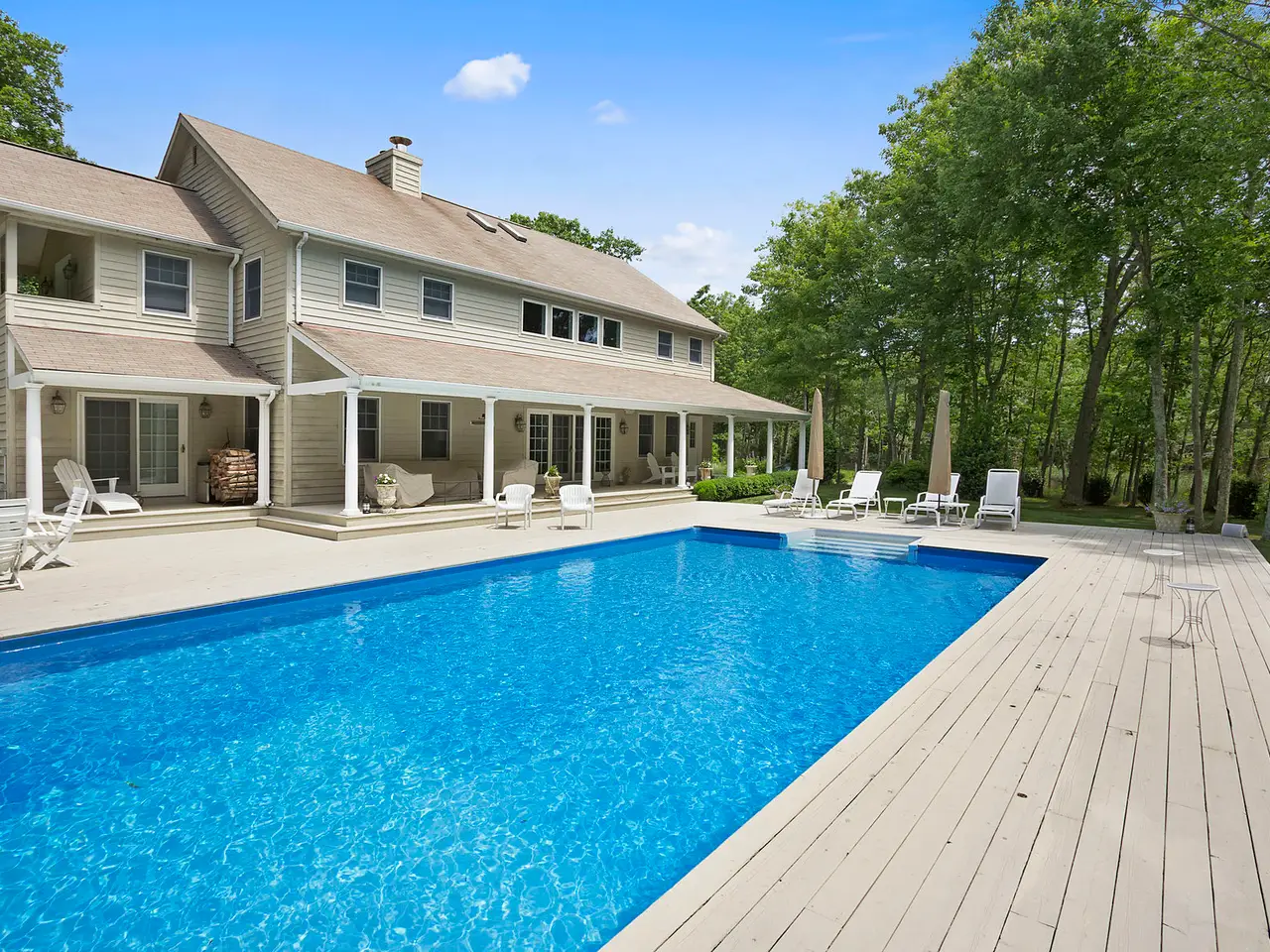 This expansive 3800 sq ft farmhouse is conveniently located in North Haven just minutes to Sag Harbor Village shopping, restaurants and cultural activities. The clean and fresh open plan interior includes a double height living room with fireplace, comfortable den with French doors, fully-equipped, newly-remodeled expanded kitchen with stainless appliances and a large island, 4 bedrooms and 3.5 bathrooms, including a first and second floor master suite, a heated pool with ample decking for entertaining and access to use North Haven Village community tennis courts. This wonderful home is privately sited on 3 acres of lush lawn and woods with a gated entrance ensuring your privacy. Additional comforts include hardwood floors, central air, and a 2 car garage. This is a clean, light, and bright summer house. Listing ID: 736305
