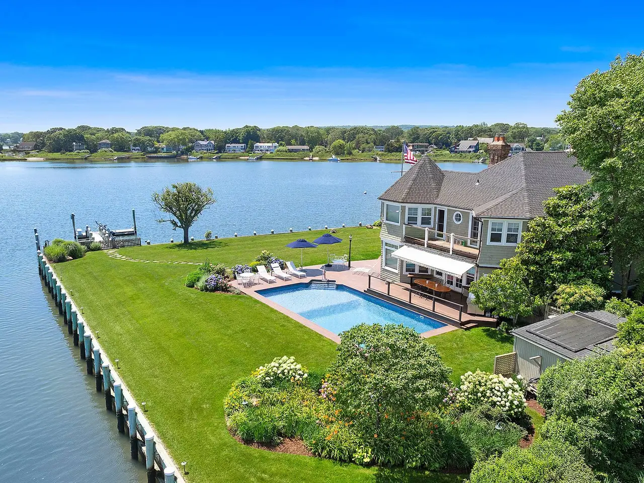 Waterfront boaters' paradise with a full-service deep-water dock and access to Sag Harbor Bay awaits your arrival. This Nautical property with a sparkling waterside pool and views over the harbor to Sag Harbor Village, offers 4 bedrooms, 4 baths, and water views from every room. Bright and airy, this open concept first-level floor plan includes a living room, chef's kitchen, dining area, and private den ~ media room with an en suite bedroom option. The second floor has a very spacious primary suite, 2 oversized walk-in closets, and gorgeous water views from its waterside balcony. Wake up to panoramic water views while lounging in the morning! The en-suite guest bedroom is also spacious, with a waterside balcony overlooking this lush waterfront property. Two additional bedrooms are offered with this wonderful property design. A renovated beach Cabana is located perfectly off the expansive back patio deck, along with many sun-drenched lounge areas. This spectacular property is surrounded by 2 waterfront bulkheads and is well-appointed for entertaining. Featuring an outdoor bar pavilion, a saltwater solar pool, and one of the longest docks permitted in Sag Harbor. Enjoy relaxing and dining by the waterside pool with views galore of Sag Harbor and the Bay. Sail your boat/yacht for the most incredible westerly sunsets over Foster Memorial Long Beach or under the bridge into Sag Harbor Village with award-winning restaurants and Marinas. Visit Bay Street Theater and community cultural center or take a stroll down the historic Main Street of this popular Old Whaling Village. This waterfront property is a sublime retreat on the peninsula of Bay Point and is truly a rare gem and one-of-a-kind in Sag Harbor.