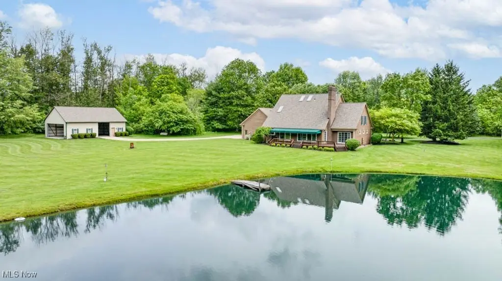 Welcome to your private oasis at the end of a picturesque driveway offering complete 360-degree privacy, peace, and serenity. This custom cedar-sided home sits on a breathtaking property with spectacular views of a large pond featuring a dock, paddle boat, and excellent fishing. Step inside to find soaring vaulted ceilings, solid wood doors, and custom details throughout. The expansive great room features a beamed ceiling, fireplace, and sliding doors that open to a large deck with an O'Neil awning overlooking the water. The first-floor primary suite offers the same tranquil views, two closets (including a walk-in with built-ins), and a spa-like ensuite with a jacuzzi tub, walk-in shower, and private water closet. Enjoy entertaining in the tile eat-in kitchen with handmade cabinetry, double ovens, a wet bar, and direct deck access. The formal dining room boasts hardwood floors, two built-in buffets, and beautiful crown molding. A cozy office/den with built-ins, fireplace, and front porch access, plus a large laundry/half bath combo and huge pantry, complete the main level. Upstairs features three generously sized bedrooms with fresh carpet, custom shutters, built-ins, and two full bathrooms one being a Jack-and-Jill with private vanities. A separate upstairs office/workout room provides flexibility. The finished basement with walk-up access to the 3rd car garage adds even more living space with new LVT flooring, a full bath, and a full wet bar with refrigerator. Additional features include geothermal heating, extensive storage, and a large metal-sided outbuilding for hobbies or equipment. This is a truly rare opportunity for privacy, luxury, and nature all in one property.