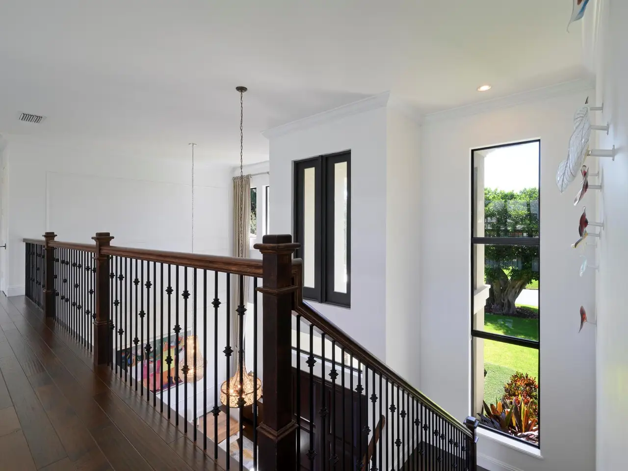 Discover timeless elegance in this stunning two-story waterfront estate located in the gated community of Portage Landing. Designed for both comfort and sophistication, this home offers 6 bedrooms (office and gym options) 4.5 baths, and exquisite craftsmanship throughout.Enter to soaring 22' ceilings, cast stone fireplace, and custom millwork. The chef's kitchen features marble floors, Thermador professional appliances, dual ovens, gas range with griddle and pot filler, butler's pantry, and granite wet bar with wine cooler. Expansive formal and casual living spaces are enhanced with marble inlays, engineered walnut wood flooring, custom drapery, and designer chandeliers--all of which convey. Retreat to the luxurious primary suite with private balcony, custom closets, and spa-like marble bath. Additional guest suites feature en suite baths, wood flooring, and built-ins. The home is complete with a gym/cabana room, office with custom wall treatments, laundry room, and epoxy-finished garage with Tesla charger station hookup and a private sauna. Enjoy the Florida lifestyle outdoors with a resort-style pool, spa, sun shelf, summer kitchen, tongue-and-groove lanai, outdoor shower, and spiral staircases leading to multiple balconies and observation deck. The property includes a private dock with ocean access (fixed bridge). Additional features include impact glass, whole-house water filtration, propane system, 4-zone A/C, central vacuum, and tankless gas hot water. This residence is a rare offering combining luxurious finishes, modern amenities, and the ultimate in waterfront living.