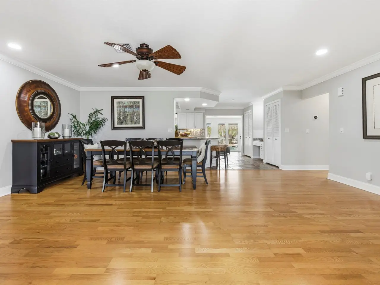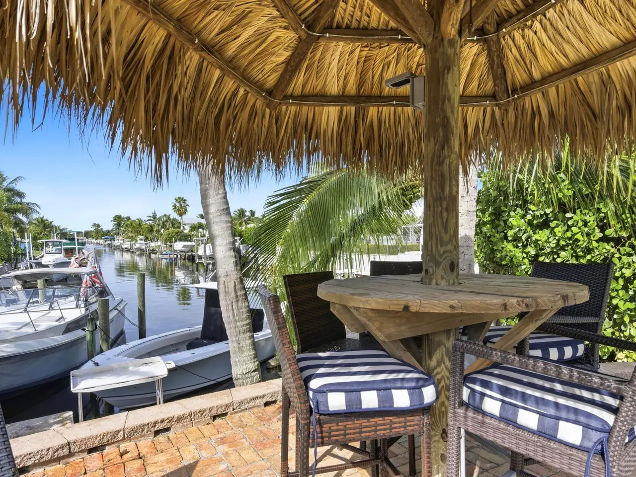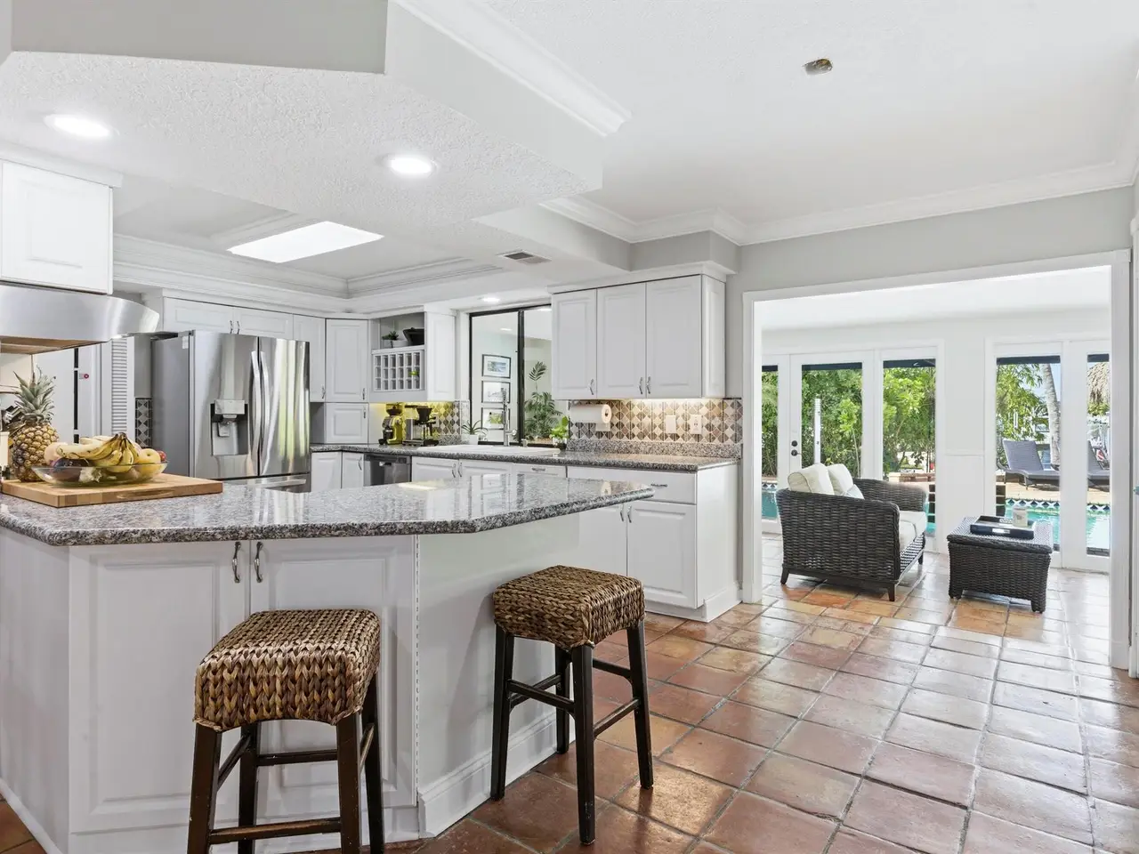 Located in the desirable Village of North Palm Beach, this waterfront residence blends coastal appeal with thoughtful design. The property features partial impact-rated windows, a metal roof, and a private dock with fish-cleaning station, offering direct canal access with fixed bridges leading to the Intracoastal Waterway and Atlantic Ocean. Inside, the home welcomes you with engineered hardwood flooring, recessed lighting, and crown molding throughout the main living areas. The open dining area connects to a well-appointed kitchen featuring granite countertops, a full tile backsplash, stainless-steel appliances. A breakfast nook and enclosed Florida room provide inviting spaces for dining or relaxation, complemented by a built-in cabinetry and reach in pantry.