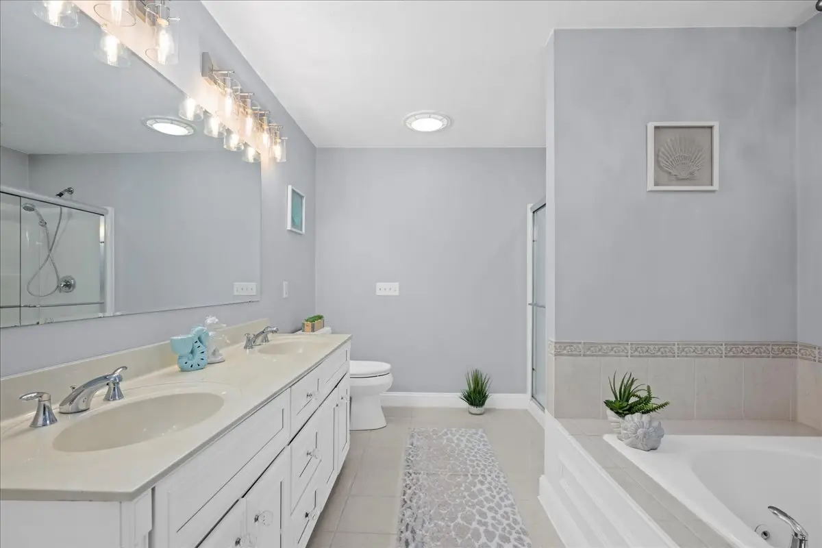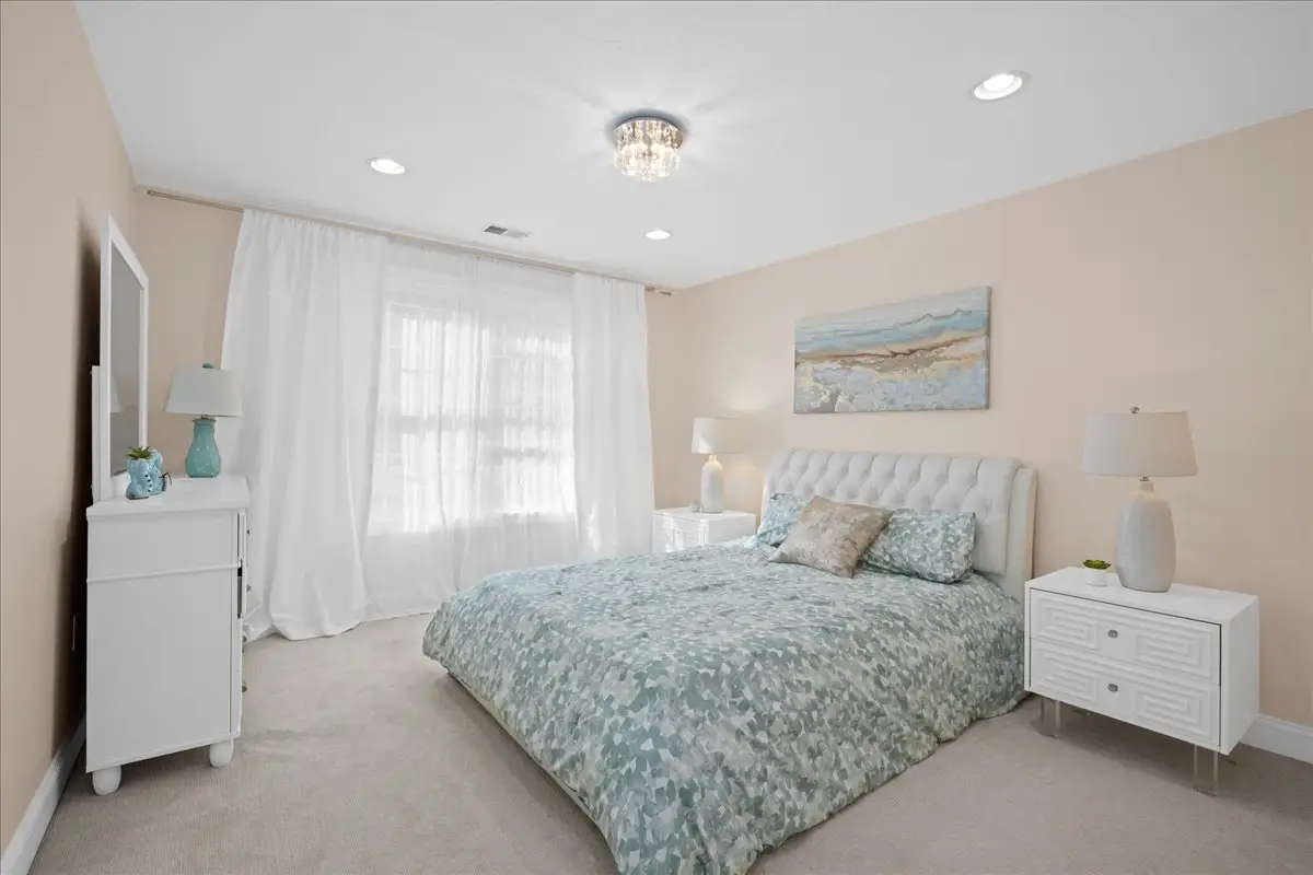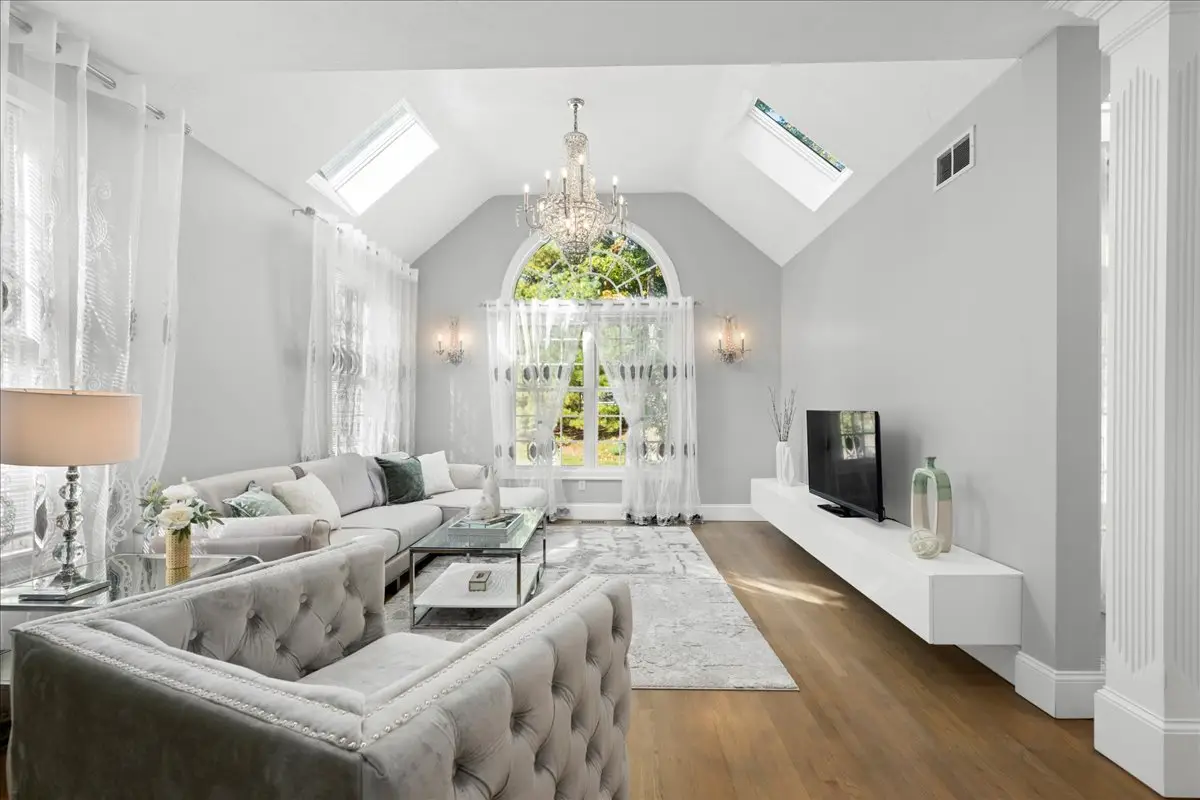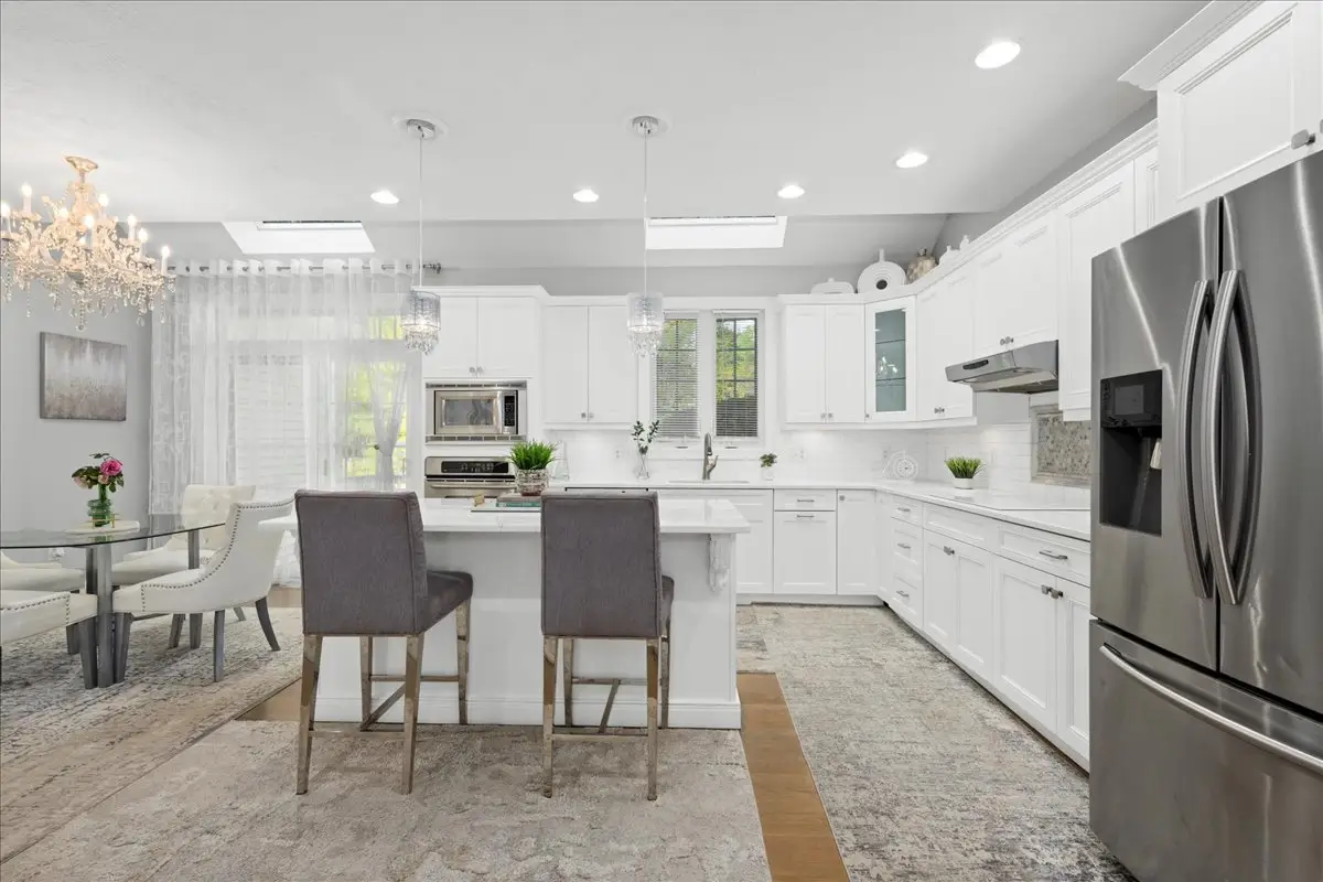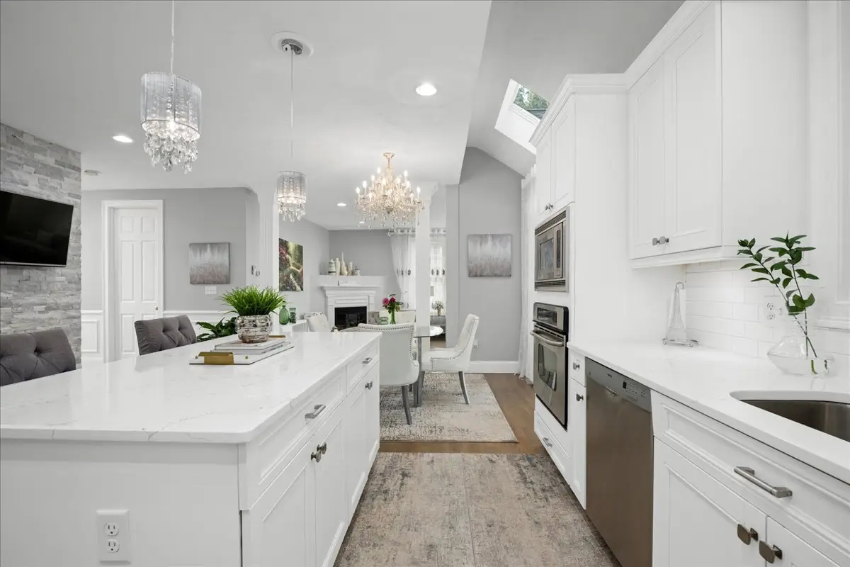 Dramatic, outstanding, mint condition transitional Colonial with decidedly modern look & feel located on a cul-de-sac. Welcoming Foyer with designer chandelier sets the stage. Incredible renovated custom white Kitchen with upscale quartz counters, tiled backsplash, center island with corbels, stunning natural stone decorated wall & eating area enjoys sun from skylights, slider & transom windows. Lovely open floor plan. The Kitchen opens to impressive cathedral ceiling Family Room with fireplace & skylights. Multi-generational option living with office or first floor Bedroom with walk-in closet & private Full Bath. Romantic Primary Suite with vaulted ceiling sitting area, sumptuous bath with jetted tub & walk-in closets. 3 additional Bedrooms & Full Bath located on the upper Level. Impressive designer chandeliers, 8ft doors on 1st floor & a plethora of recessed lighting. Extensive landscaping has been completed with walkways, professional landscaping lights, flower beds, 40+ Emerald Green Arborvitaes & storage shed.