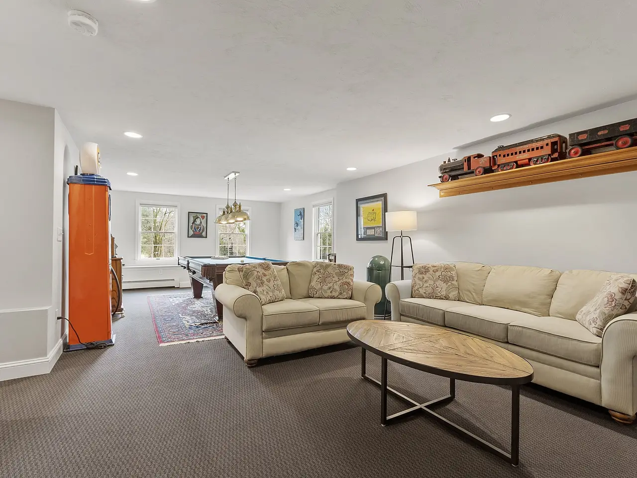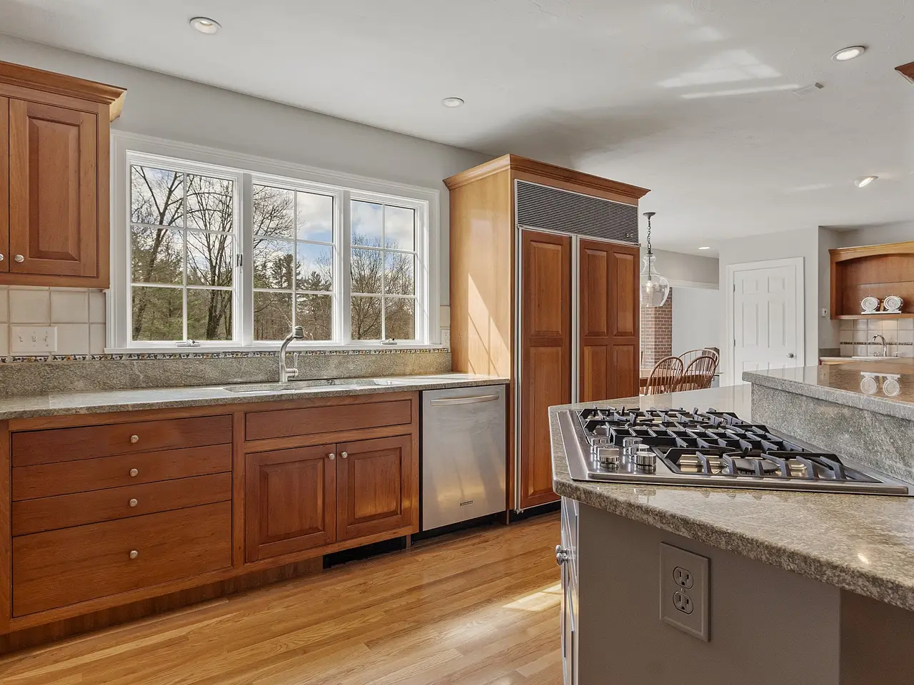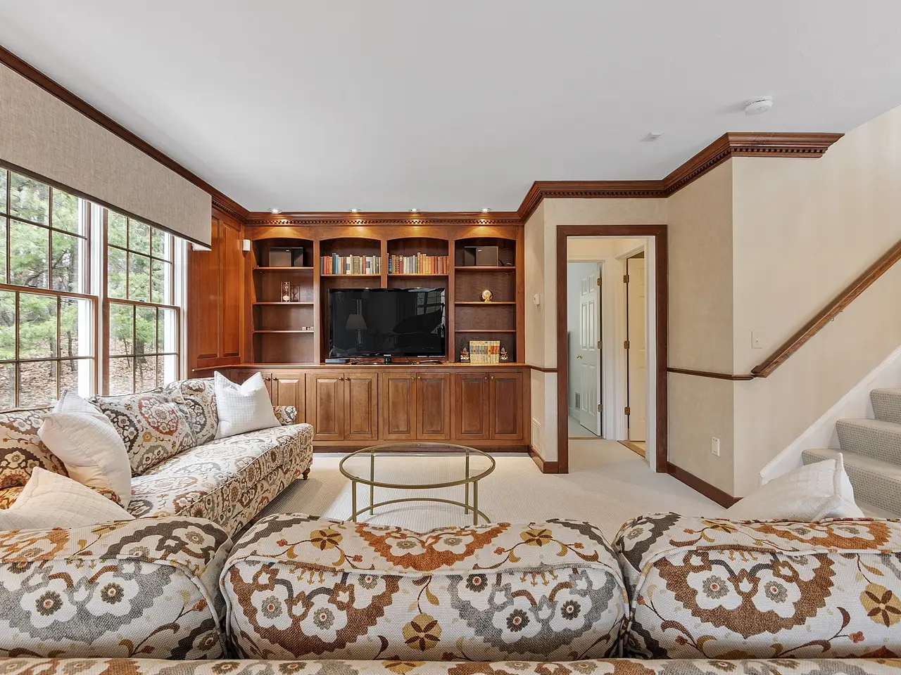 Tucked within a picturesque Currier & Ives–style setting, this bright Cape Cod home embodies classic New England living. Sunlight fills every corner, from the welcoming front approach to the rear façade with southern exposure. The sun-splashed four-season room overlooks a private, tree-lined backyard and flows to a sparkling in-ground pool and spacious patio—perfect for summer gatherings. Inside, craftsmanship shines in the upgraded cherry kitchen with fireplace, inset cabinetry, stainless appliances, and Sub-Zero refrigerator, plus a built-in coffee/wine bar. The wood-paneled fireplaced family room invites relaxation, while the formal dining room framed by French doors hosts memorable celebrations. A first-floor bedroom with bath offers guest or office space. Upstairs, the owner’s suite features sunlit windows, a custom walk-in closet, and spa-like bath. Two bedrooms, a loft, bonus room, and finished walkout level with playroom, bar, and bath complete this serene, commuter-friendly home