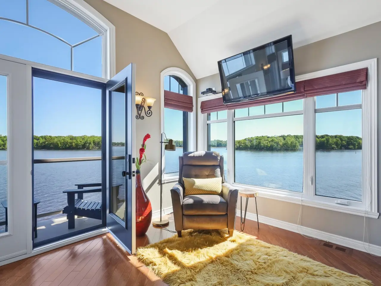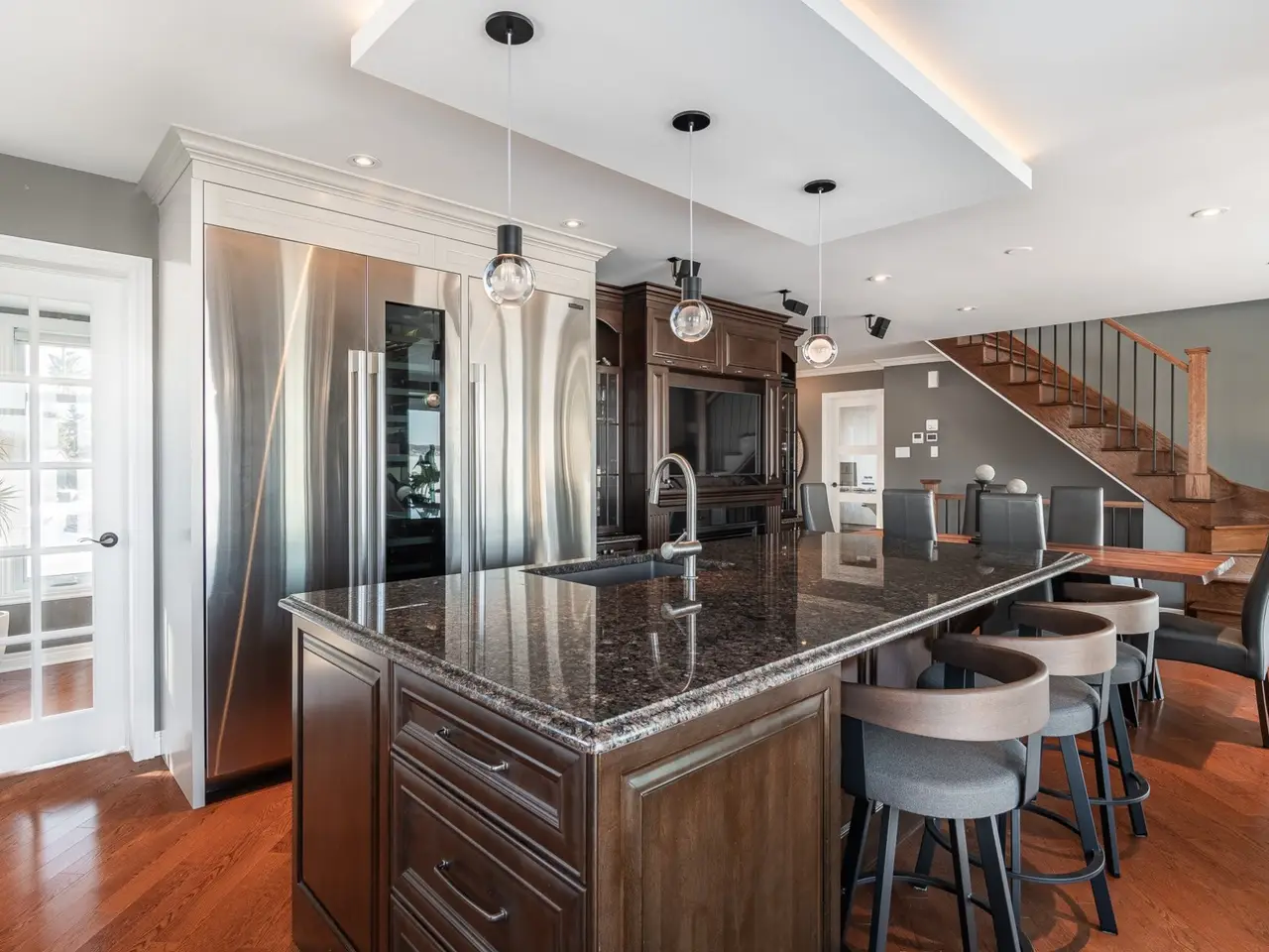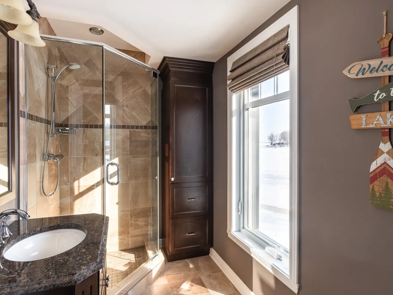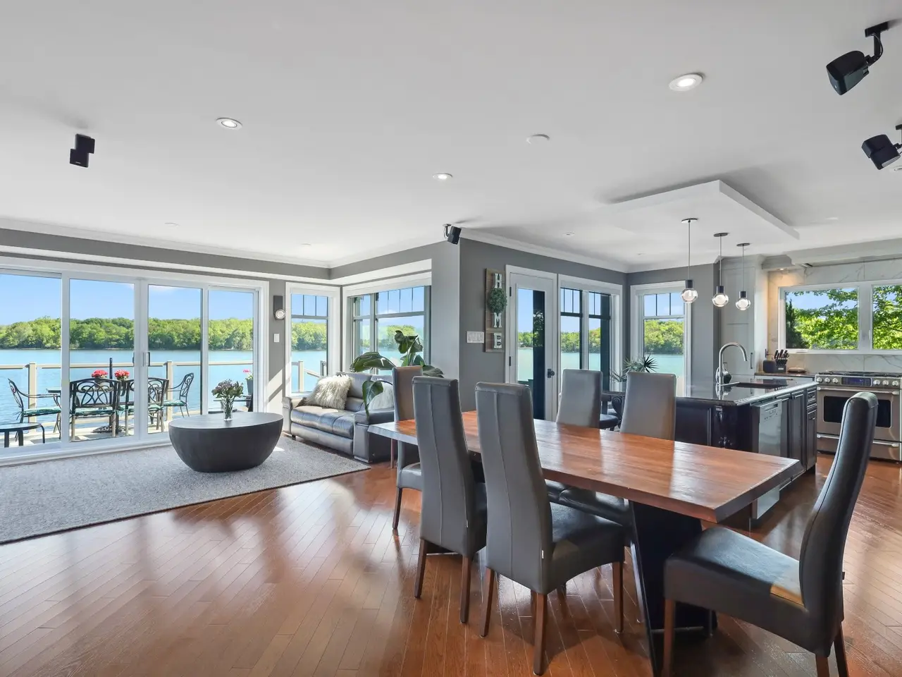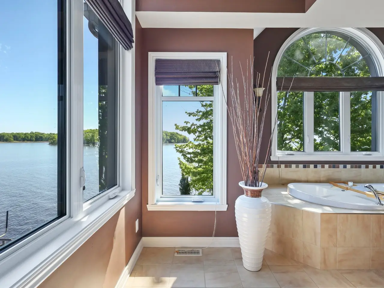 Experience unparalleled waterfront living on a private peninsula with 360-degree views of Lac St-Louis, gated entrance, and a stunning unistone driveway. This exceptional home features three fireplaces and an open-concept main floor with breathtaking views. The chef's kitchen boasts granite counters and a butler's pantry. Upstairs, the retreat-style primary suite offers walls of windows, 10-foot ceilings, a spacious walk-in closet, and an ensuite. 2 bedrooms with basement or office that can be converted into a 3rd bedroom. Built in 2008 and beautifully rejuvenated in 2021 with new siding, triple-pane windows, and exterior doors. A rare gem.
