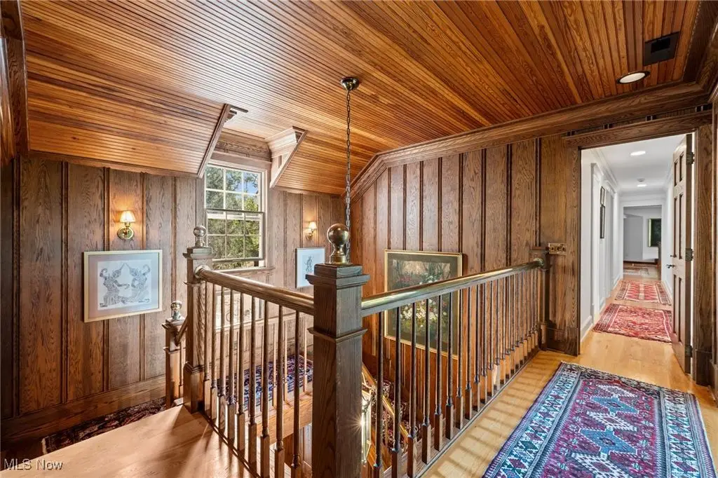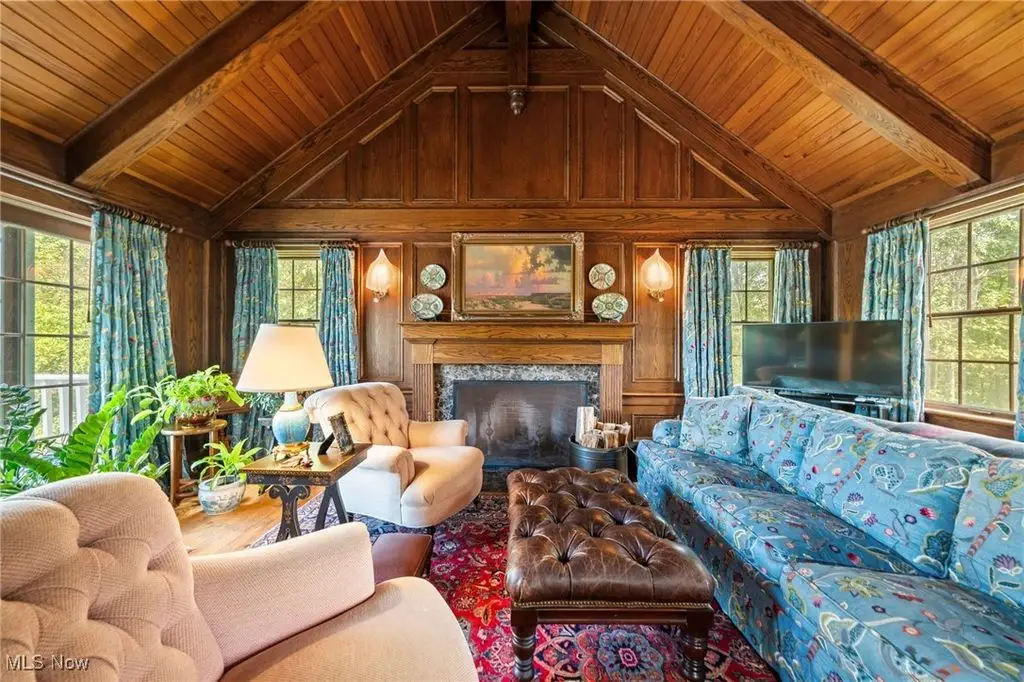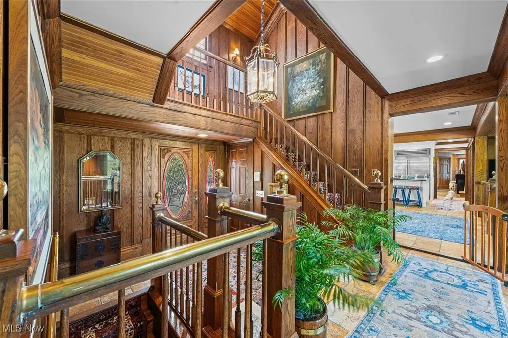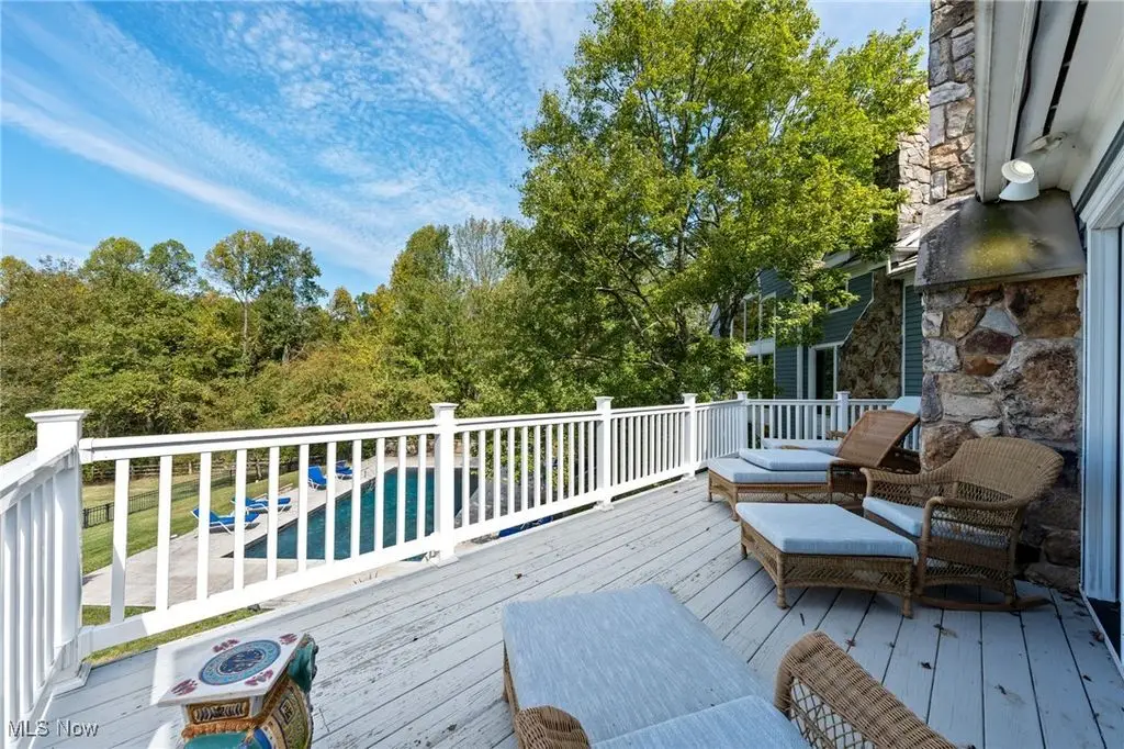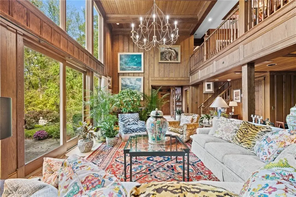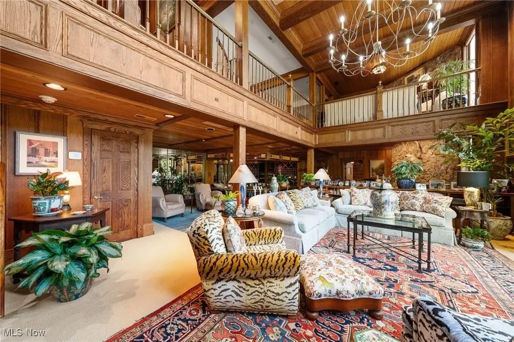 Welcome to this extraordinary home set on 6.9 meticulously maintained acres, blending architectural distinction with modern comfort. The entrance hall, with rich wood paneling and marble accents, offers a warm welcome. The home's most captivating feature is its open, multi-level design, where dramatic lofts and custom brass-accented railings create seamless visual connections, flooding the interior with natural light and a remarkable sense of space. The living room, with pool views, flows into a full-service bar and sunken hearth room. The open floor plan extends effortlessly to outdoor living areas, perfect for entertaining. The stunning pool area, framed by manicured gardens and stone terracing, offers a resort-like retreat. The main level hosts the heart of the home: a gourmet kitchen with professional-grade appliances including a Wolf Range and Sub-Zero refrigerator/freezer, granite counters, custom cabinetry, and an island. Adjacent is a cozy hearth room. The primary suite provides a private escape with dual walk-in closets and a deck access overlooking the yard and pool. Across the main level, a den with full bath offers flexible space for guests. With 5 bedrooms and 5 full bathrooms, the home accommodates family and visitors with ease. Upstairs are 4 additional bedrooms, 2 full baths, a loft, a gym with pool views. The lower level features dual cabana rooms for poolside service, a wine tasting room and cellar with wood ceilings for the discerning collector, and a walk-in refrigerator for serious entertainers. Multiple access points ensure easy flow throughout. The pool's mechanical systems are discreetly housed here. This level also includes a spacious laundry room, pantry, and a second staircase to both upper and lower floors. A finished, heated three-car garage completes the first level. Additional highlights include geothermal HVAC, dual hot water tanks, a circular driveway, and a peaceful setting offering seclusion without compromising convenience.