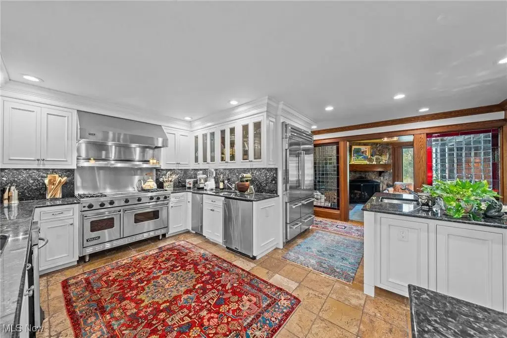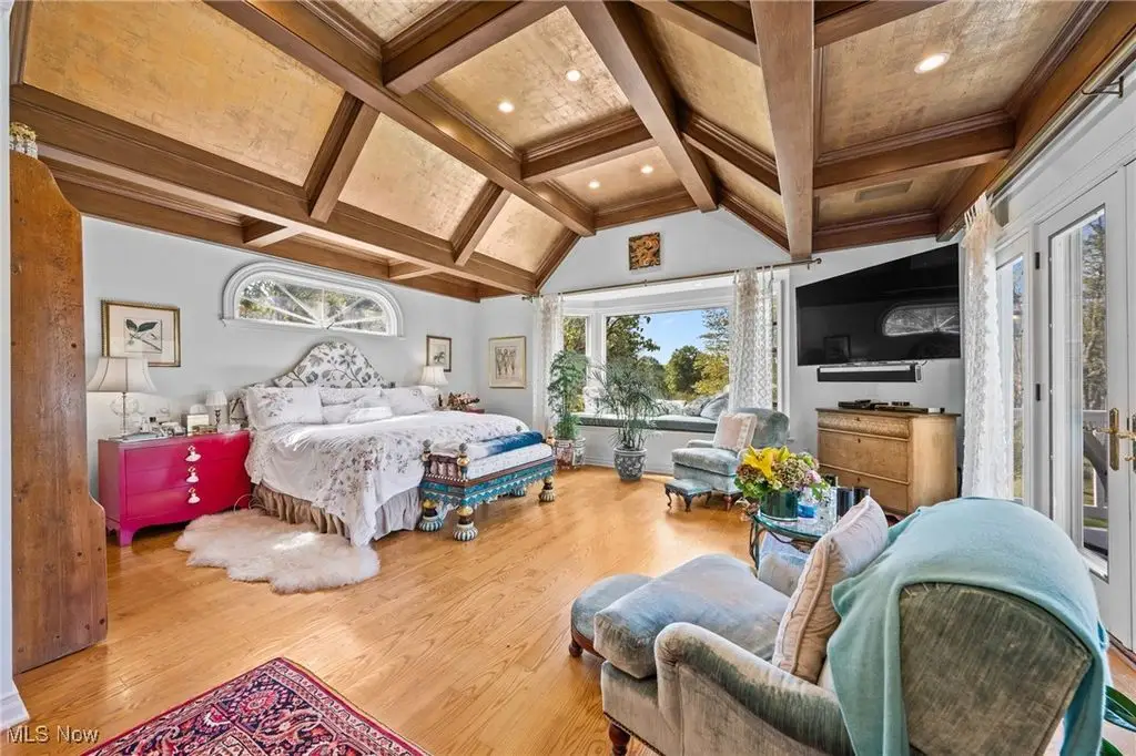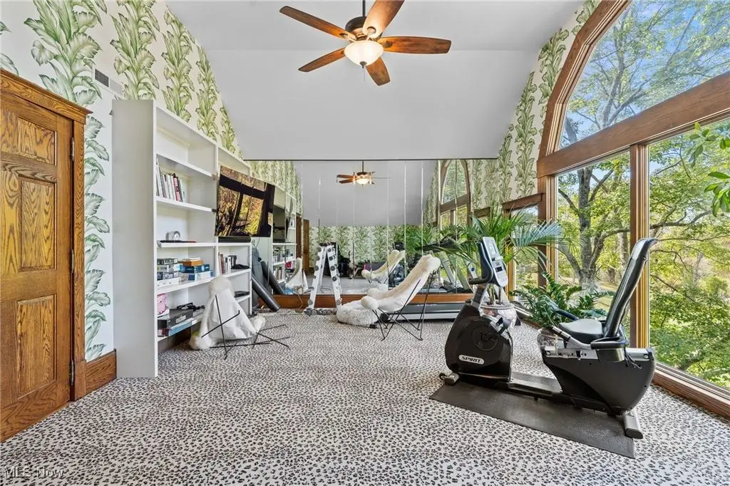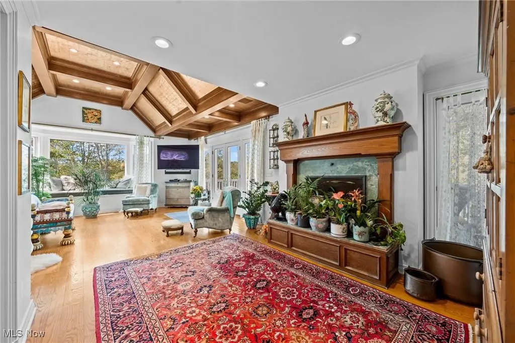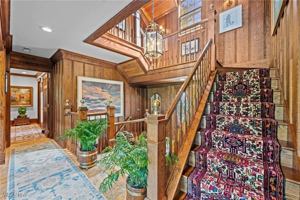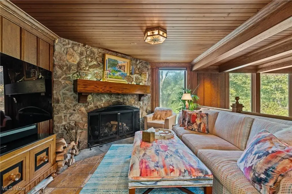 Welcome to this extraordinary home set on 6.9 meticulously maintained acres, blending architectural distinction with modern comfort. The entrance hall, with rich wood paneling and marble accents, offers a warm welcome. The home's most captivating feature is its open, multi-level design, where dramatic lofts and custom brass-accented railings create seamless visual connections, flooding the interior with natural light and a remarkable sense of space. The living room, with pool views, flows into a full-service bar and sunken hearth room. The open floor plan extends effortlessly to outdoor living areas, perfect for entertaining. The stunning pool area, framed by manicured gardens and stone terracing, offers a resort-like retreat. The main level hosts the heart of the home: a gourmet kitchen with professional-grade appliances including a Wolf Range and Sub-Zero refrigerator/freezer, granite counters, custom cabinetry, and an island. Adjacent is a cozy hearth room. The primary suite provides a private escape with dual walk-in closets and a deck access overlooking the yard and pool. Across the main level, a den with full bath offers flexible space for guests. With 5 bedrooms and 5 full bathrooms, the home accommodates family and visitors with ease. Upstairs are 4 additional bedrooms, 2 full baths, a loft, a gym with pool views. The lower level features dual cabana rooms for poolside service, a wine tasting room and cellar with wood ceilings for the discerning collector, and a walk-in refrigerator for serious entertainers. Multiple access points ensure easy flow throughout. The pool's mechanical systems are discreetly housed here. This level also includes a spacious laundry room, pantry, and a second staircase to both upper and lower floors. A finished, heated three-car garage completes the first level. Additional highlights include geothermal HVAC, dual hot water tanks, a circular driveway, and a peaceful setting offering seclusion without compromising convenience.