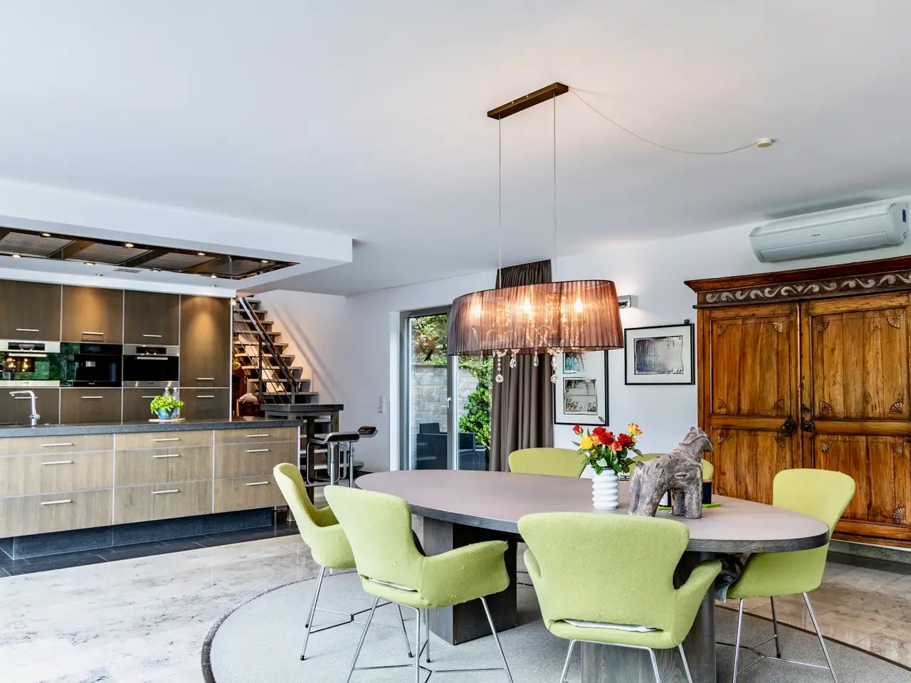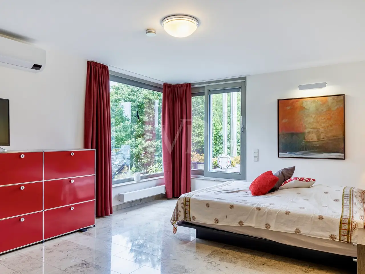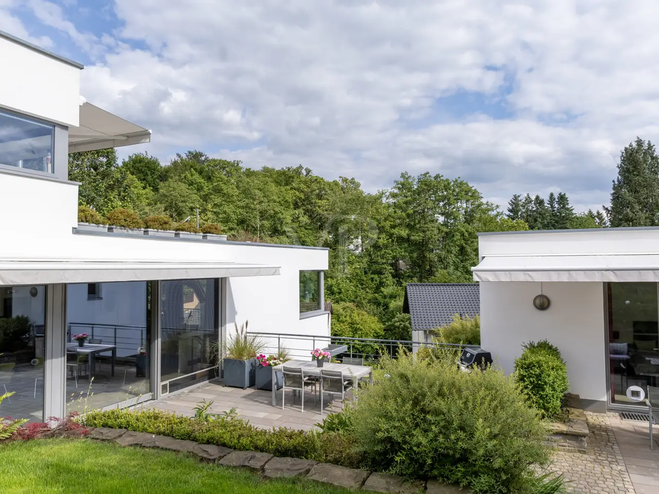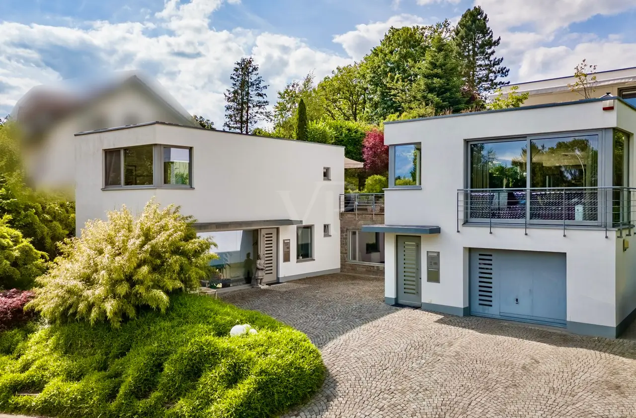 A unique ensemble with two separate houses, built in 2004 in the timeless Bauhaus style and last extensively modernized in 2017, is for sale. The property offers a spacious plot consisting of two plots with a total area of 1,050 m². The location of the plot is characterized by a slight to moderate slope and was laid out like a park. The south-west orientation ensures excellent sunlight. Access to the property is via a quiet cul-de-sac, which guarantees privacy and minimal traffic. The driveway leads over an attractively paved courtyard area made of cobblestones and graywacke, on which there are two parking spaces and a garage. Additional comfort is provided by a switchable patio heater, which ensures snow-free access even on frosty days. A well with a depth of 38 meters is available for watering the garden and is also suitable for the use of geothermal energy. The main house itself extends over three levels and offers a well thought-out room layout. The modern and spacious ground floor, with a large checkroom and built-in cupboards, wine cellar, boiler room and guest WC, leads to the heart of the property. From here you also have direct access to the garage. On the first floor there is an open-plan living and dining area with a free-standing kitchen block and fireplace and direct access to a spacious terrace. The south-west facing terrace allows you to enjoy many hours of sunshine outdoors. The kitchen is equipped with high-quality modern appliances and offers enough space for a cozy dining area. On the first floor there is also a practical utility room and a bathroom. An additional room, which would be ideal for using the sauna, is also located on this level. The 2nd floor comprises 2 spacious bedrooms with en-suite barrier-free bathrooms and a terrace each, as well as a spacious dressing room with functional built-in wardrobes and a laundry chute to the utility room/kitchen. House 2 has the same luxurious fittings as house 1, but is also fully air-conditioned and equipped with radiator heating. It offers a multifunctional use as an office on both floors with reception and meeting room on the ground floor, or e.g. partial use for residential purposes on the upper floor. The terrace on the upper level by the guest room unit enables short distances to House 1. The property was extensively modernized in 2017, with attention paid to high-quality materials and contemporary furnishings. The well thought-out architecture and high-quality construction offer comfortable living at the highest level, leaving nothing to be desired.