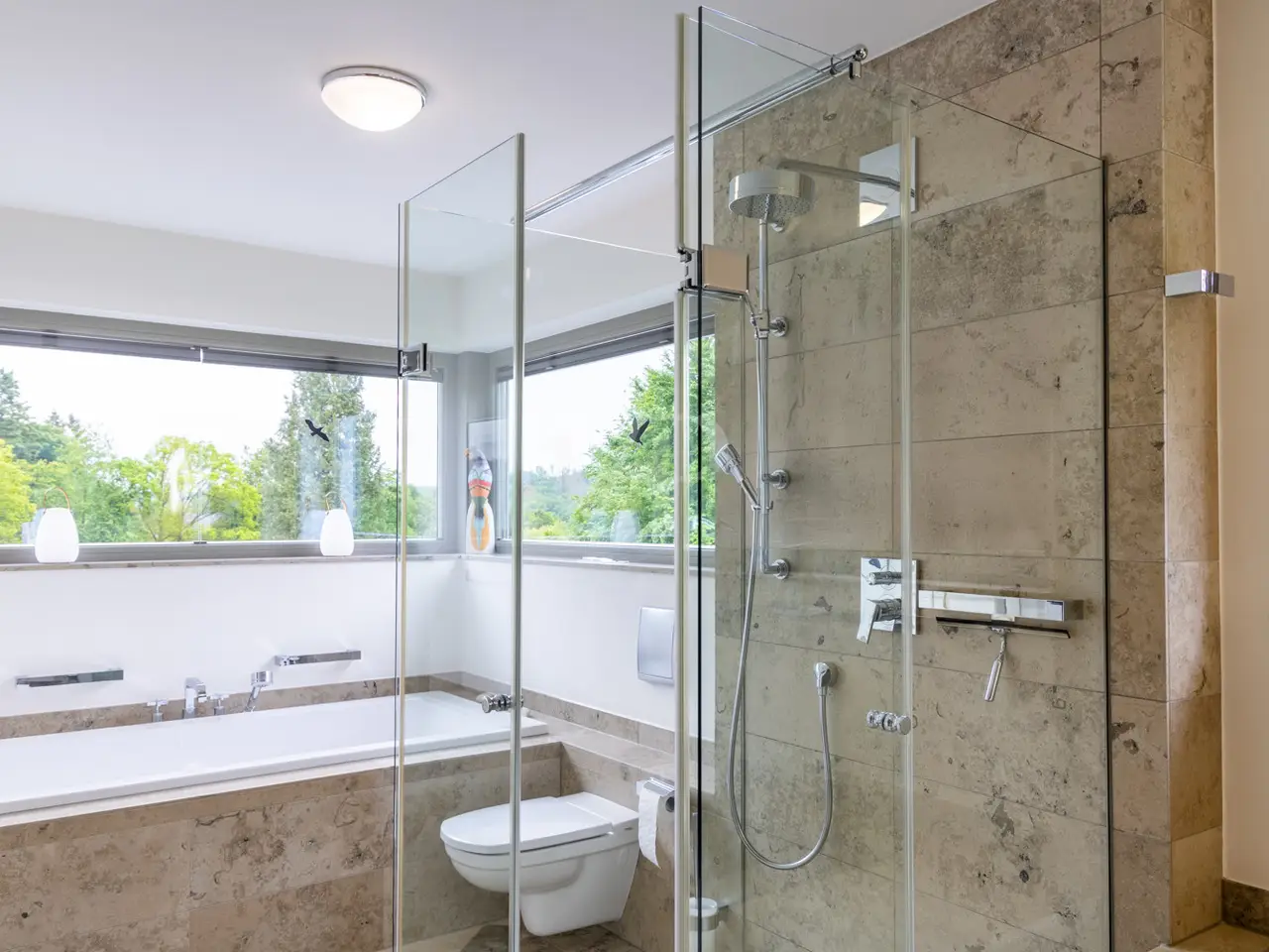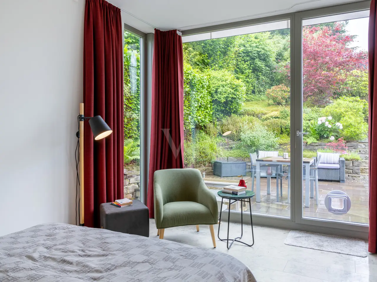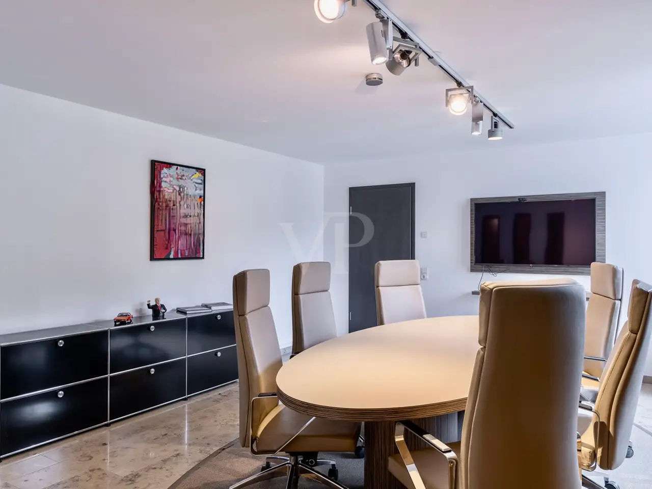 A unique ensemble with two separate houses, built in 2004 in the timeless Bauhaus style and last extensively modernized in 2017, is for sale. The property offers a spacious plot consisting of two plots with a total area of 1,050 m². The location of the plot is characterized by a slight to moderate slope and was laid out like a park. The south-west orientation ensures excellent sunlight. Access to the property is via a quiet cul-de-sac, which guarantees privacy and minimal traffic. The driveway leads over an attractively paved courtyard area made of cobblestones and graywacke, on which there are two parking spaces and a garage. Additional comfort is provided by a switchable patio heater, which ensures snow-free access even on frosty days. A well with a depth of 38 meters is available for watering the garden and is also suitable for the use of geothermal energy. The main house itself extends over three levels and offers a well thought-out room layout. The modern and spacious ground floor, with a large checkroom and built-in cupboards, wine cellar, boiler room and guest WC, leads to the heart of the property. From here you also have direct access to the garage. On the first floor there is an open-plan living and dining area with a free-standing kitchen block and fireplace and direct access to a spacious terrace. The south-west facing terrace allows you to enjoy many hours of sunshine outdoors. The kitchen is equipped with high-quality modern appliances and offers enough space for a cozy dining area. On the first floor there is also a practical utility room and a bathroom. An additional room, which would be ideal for using the sauna, is also located on this level. The 2nd floor comprises 2 spacious bedrooms with en-suite barrier-free bathrooms and a terrace each, as well as a spacious dressing room with functional built-in wardrobes and a laundry chute to the utility room/kitchen. House 2 has the same luxurious fittings as house 1, but is also fully air-conditioned and equipped with radiator heating. It offers a multifunctional use as an office on both floors with reception and meeting room on the ground floor, or e.g. partial use for residential purposes on the upper floor. The terrace on the upper level by the guest room unit enables short distances to House 1. The property was extensively modernized in 2017, with attention paid to high-quality materials and contemporary furnishings. The well thought-out architecture and high-quality construction offer comfortable living at the highest level, leaving nothing to be desired.