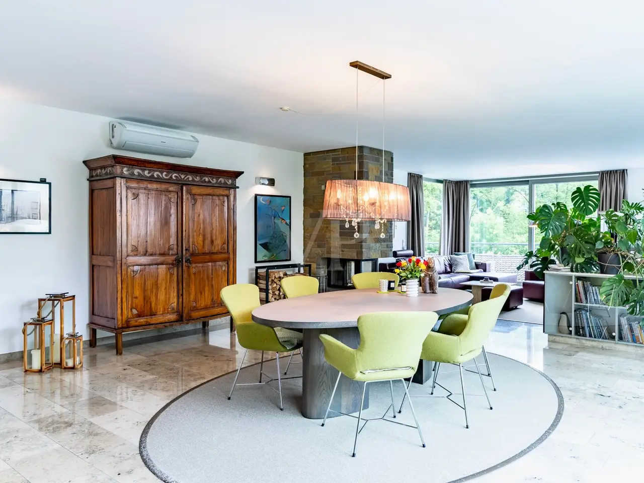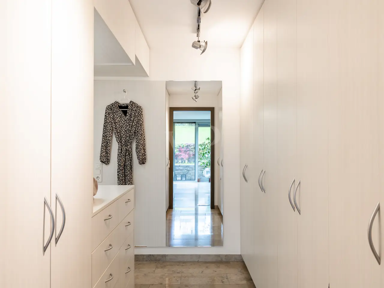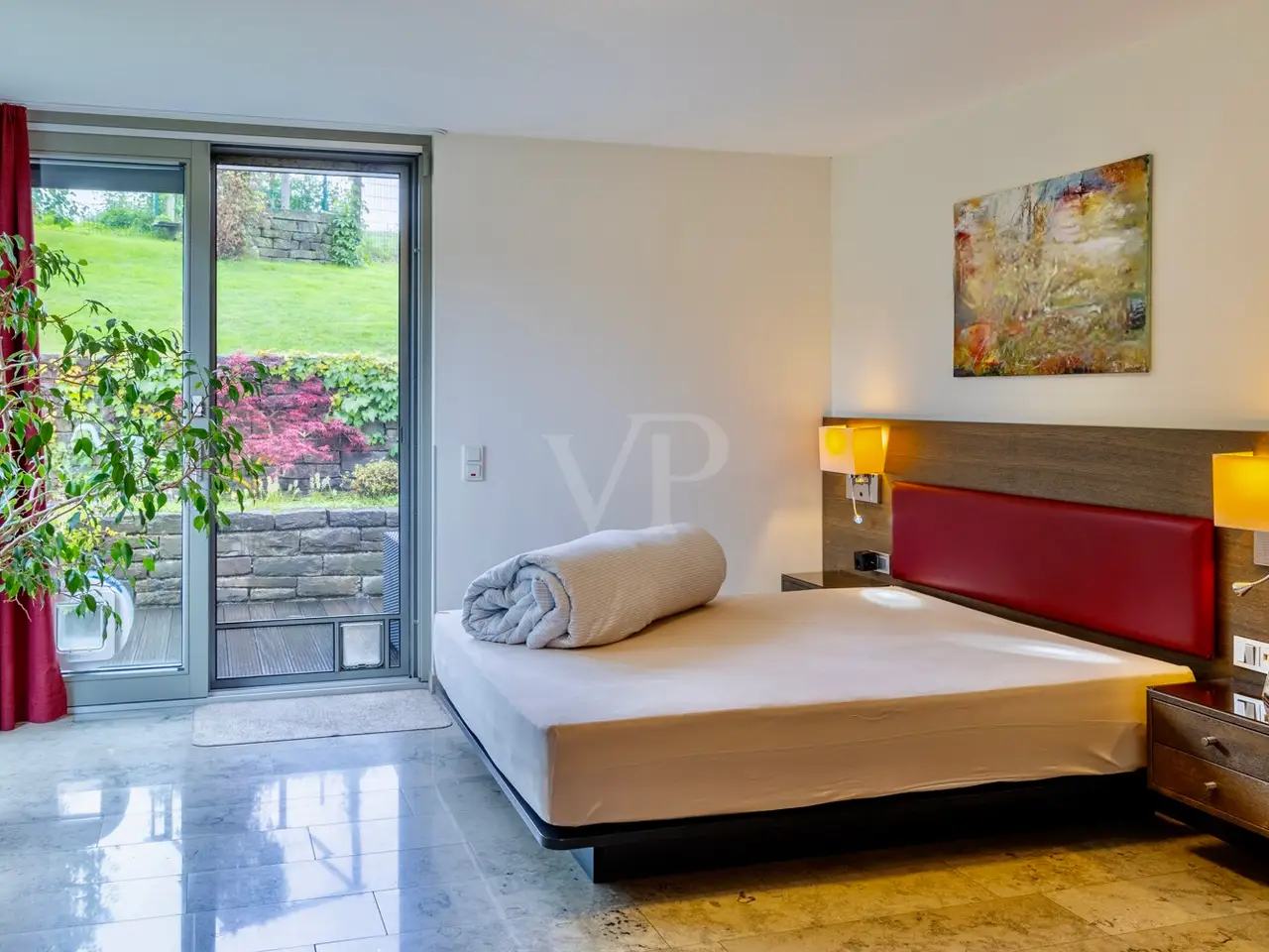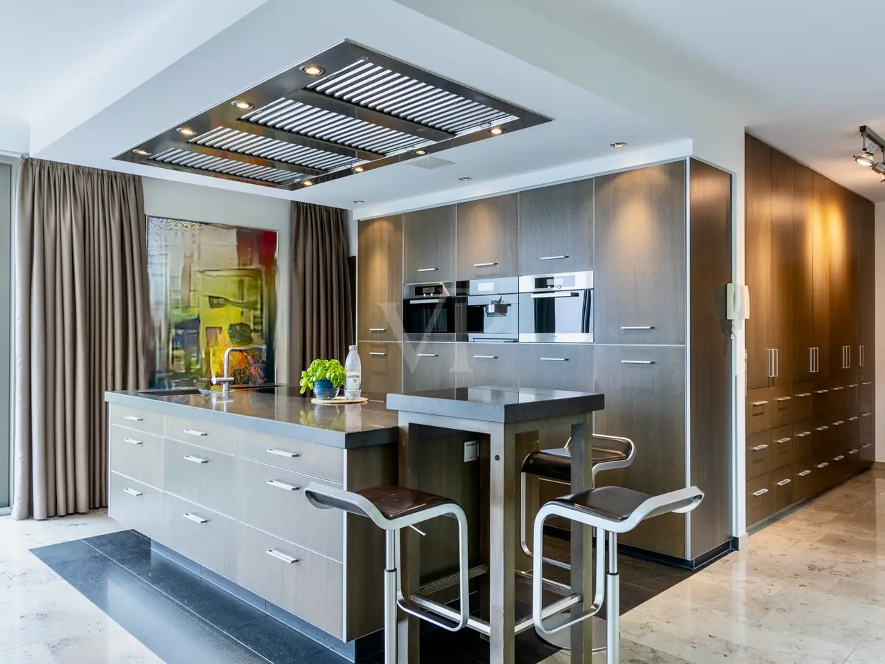 A unique ensemble with two separate houses, built in 2004 in the timeless Bauhaus style and last extensively modernized in 2017, is for sale. The property offers a spacious plot consisting of two plots with a total area of 1,050 m². The location of the plot is characterized by a slight to moderate slope and was laid out like a park. The south-west orientation ensures excellent sunlight. Access to the property is via a quiet cul-de-sac, which guarantees privacy and minimal traffic. The driveway leads over an attractively paved courtyard area made of cobblestones and graywacke, on which there are two parking spaces and a garage. Additional comfort is provided by a switchable patio heater, which ensures snow-free access even on frosty days. A well with a depth of 38 meters is available for watering the garden and is also suitable for the use of geothermal energy. The main house itself extends over three levels and offers a well thought-out room layout. The modern and spacious ground floor, with a large checkroom and built-in cupboards, wine cellar, boiler room and guest WC, leads to the heart of the property. From here you also have direct access to the garage. On the first floor there is an open-plan living and dining area with a free-standing kitchen block and fireplace and direct access to a spacious terrace. The south-west facing terrace allows you to enjoy many hours of sunshine outdoors. The kitchen is equipped with high-quality modern appliances and offers enough space for a cozy dining area. On the first floor there is also a practical utility room and a bathroom. An additional room, which would be ideal for using the sauna, is also located on this level. The 2nd floor comprises 2 spacious bedrooms with en-suite barrier-free bathrooms and a terrace each, as well as a spacious dressing room with functional built-in wardrobes and a laundry chute to the utility room/kitchen. House 2 has the same luxurious fittings as house 1, but is also fully air-conditioned and equipped with radiator heating. It offers a multifunctional use as an office on both floors with reception and meeting room on the ground floor, or e.g. partial use for residential purposes on the upper floor. The terrace on the upper level by the guest room unit enables short distances to House 1. The property was extensively modernized in 2017, with attention paid to high-quality materials and contemporary furnishings. The well thought-out architecture and high-quality construction offer comfortable living at the highest level, leaving nothing to be desired.