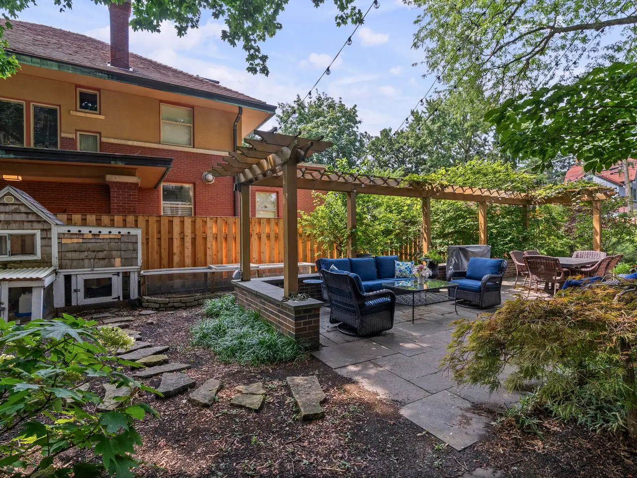 Professionally landscaped backyard with pergola