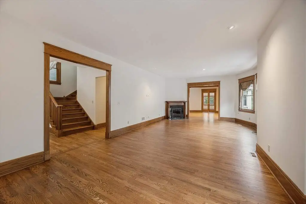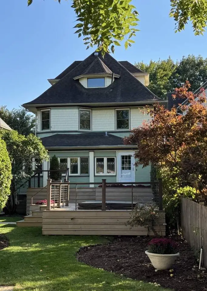 Welcome to The Francis J. Woolley House built in 1893. This Frank Lloyd Wright transitional masterpiece is spacious, restored and updated. Enjoy the unique and special neighborhood with views of other historic homes from your restored front porch (2025). The large foyer opens to the double living room with working fireplace (new liner 2019). A unique light fixture in the dining room highlights the space. Newer custom kitchen (2018) is a cooks delight! Miles of counter space and a huge island allows for everyone to join in meal prep or just relax and chat. Kitchen opens to the family room with beautiful art glass and both have a panoramic view of the multi-tiered deck w/hot tub (2019) and landscaped backyard. 1st floor 1/2 bath with W/D closet redone in (2020). Take the double staircase to the 2nd floor which offers 4 large bedrooms including the primary with its zen-like en suite bath and walk-in closet with custom shelving. 3 additional bedrooms share a large hall bath and all bedrooms have ample closet space. The 3rd floor is a treat, with 3 large rooms which could be additional bedrooms, perfect for guests. However, sellers used it as 2 offices and a guest BR. Basement (perma seal 2018) and new carpet is a great REC room with 1/2 bath, wine room, utility and plenty of additional storage. 2 car garage in fenced in backyard, brick pavers recently power washed. This house has been lovingly cared for and updated over the years. Many, but not all, windows have been replaced, newer floors and bathrooms too. 2 zone HVAC. Fresh neutral decor 2025, floor refinished on 1st floor 2025. Foundation and chimney tuck pointed 2025. This sun filled house has it all, history, architectural pedigree, in-town location and a very open feel throughout. Don't miss this opportunity to own a Wright in the heart of the Frank Lloyd Wright Prairie School of Architecture Historic District and in a walk to everything location! Steam shower, heated floors in primary and outdoor yard sprinkler are as-is.