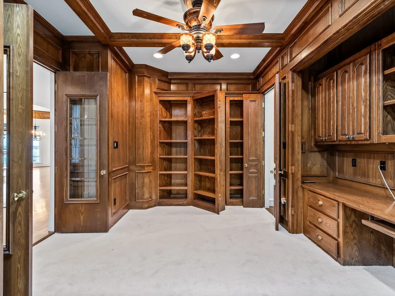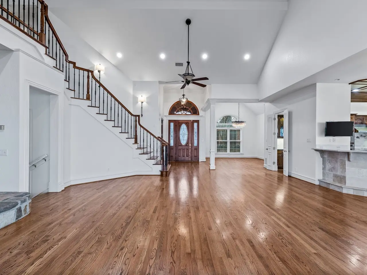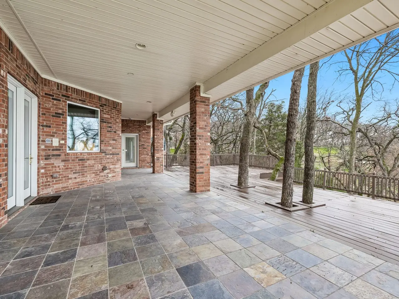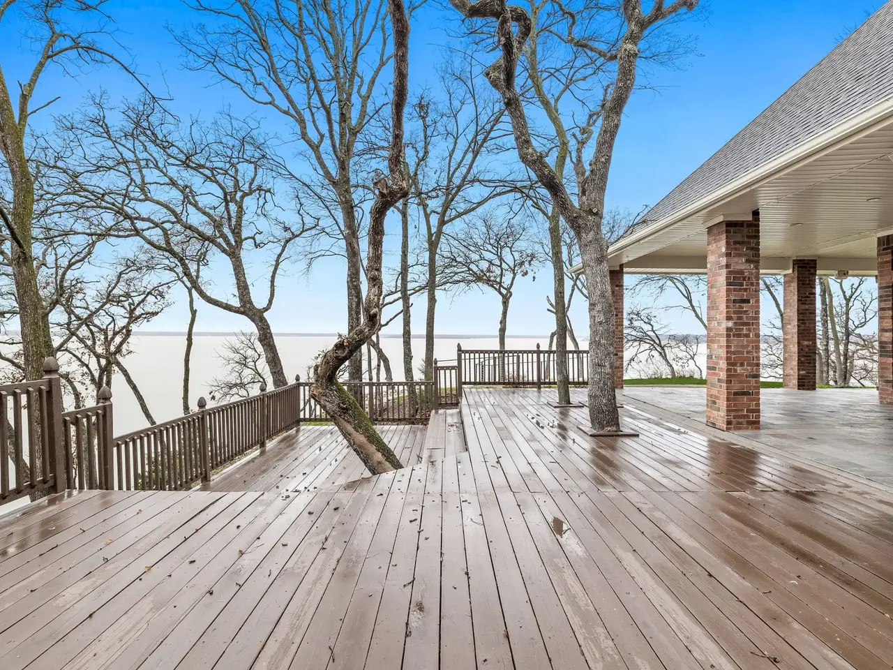 Welcome to this stunning Lake Lewisville Lakefront Estate, where sweeping water views add to this unique property. Main house is recently updated with new flooring and fixtures, plus bathroom & kitchen updates. Invite guests into grand living area, accented by dramatic staircase, stone fireplace, and incredible water views looking out to the horizon. Stately study is accented by sleek hardwoods, new carpet, and boasts impressive rounded windows, generous built-ins and secret door to storm shelter! Dining room glows under shimmering chandelier, making an elegant space for entertaining. Unique hardwood ceiling accents gourmet kitchen and provides ample countertop and built-in storage space. Luxury touches, including built-in industrial fridge, island, prep sink, and Viking hood make cooking a delight. Connected breakfast nook continues the thoughtful hardwood detailing and provides close patio access and generous views of expansive lake. Oversized primary is a retreat, with rounded bay windows looking out to the lake with ample space for peaceful sitting area. Spa-like primary bath includes dual vanities, separate garden tub and shower, and 2 WIC that provide plenty of custom built-in storage. Additional downstairs bedroom is perfect guest suite, with ensuite bath and WIC. Downstairs bright sunroom features built-ins, making it ideal for craft room or additional office space. Upstairs offers roomy game room with bay windows and convenient wet bar for entertaining. Additional bedrooms include jack & jill bath and WIC. 2nd floor of garage includes additional apartment space, with kitchen, full bath, living area, and bedroom. Outdoor oasis features generous multi-level patio space, perfect for outdoor seating or dining. Backyard leads down to the water with stone pathways and includes private woods for quiet seclusion. Additional features include oversized garage, 3 water heaters, 5 heat pumps, geothermal system for HVAC, and propane generator!