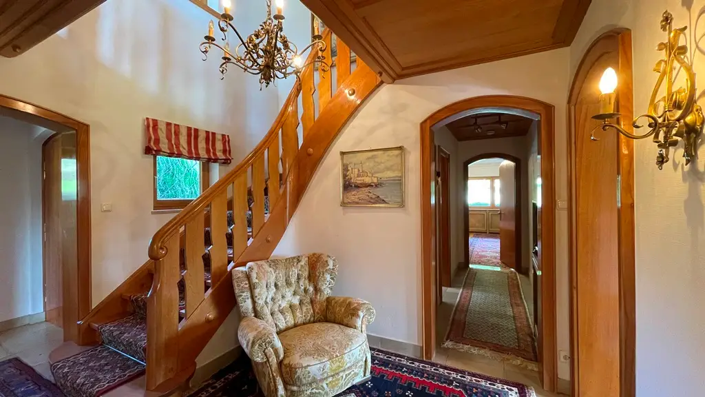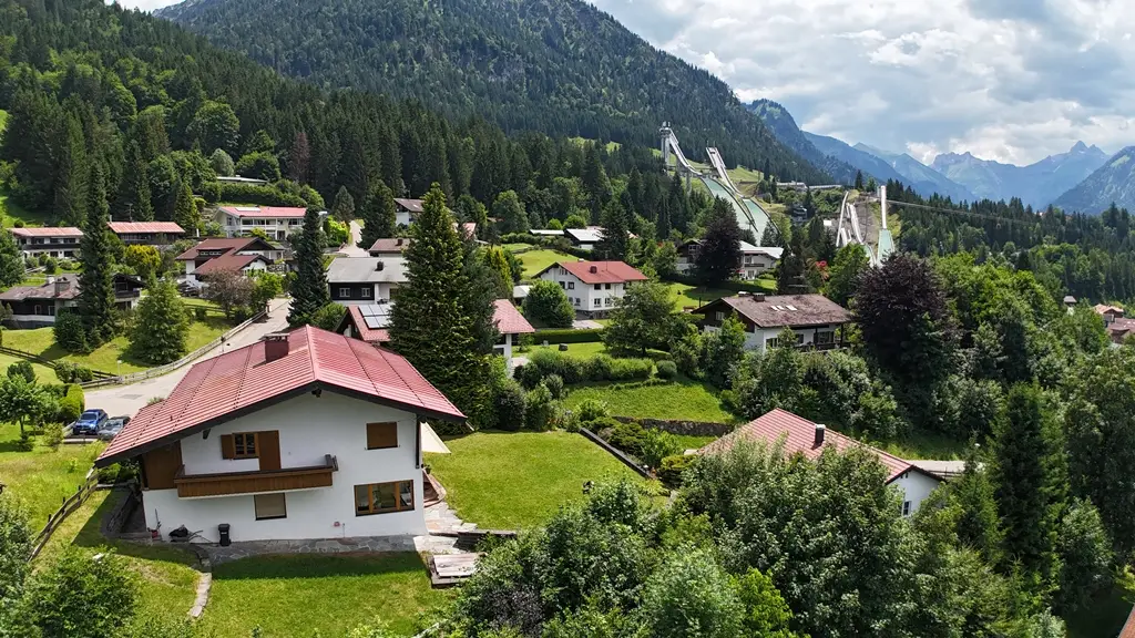 In one of the most sought-after and at the same time rarest locations that Oberstdorf has to offer, this detached house presents itself as a real gem - a property that only comes on the market once in a generation. The address "Am First" is already one of the village's premium locations per se, but this property occupies an absolute top position among them. In the middle of the exclusive residential areas "Plattenbichl" and "Am First", this property stands out as a top location - with an unobstructable panorama, absolute tranquillity and a plot size that is hard to find today. The special atmosphere greets you as soon as you enter: stylish architecture, lovingly preserved elements from the 1959 construction year and a condition that impresses with continuous maintenance and high-quality modernization. The exterior is characterized by mature structures and an elegance that is never loud, but always present. The property offers breathtaking views of the surrounding mountains - including unobstructed views of the ski jump - while at the same time offering absolute privacy. The spacious outdoor seating areas on both floors have been designed with a keen sense of orientation and panorama and invite you to linger at any time of day. The interior of the house is characterized by fine materials, extraordinary details and furnishings that are above average even for the year of construction. High-quality parquet flooring (partly in a herringbone pattern), elaborate solid wood ceilings, coffered ceilings and well thought-out fixtures run through the entire house. Windows and shutters have been continuously modernized - the stylish folding shutters on the upper floor in particular underline the charming overall appearance. With three bedrooms and three bathrooms on two floors, the room layout offers an ideal setting for families, guests or retreats. Particularly noteworthy is the integrated wellness area with sauna, large shower and relaxation zone - an oasis of relaxation with direct access to the outdoor seating area. The technical infrastructure has been extensively renovated and future-proofed: a modern pellet heating system was installed just last year - a reliable and efficient heating system with generous buffer storage. In addition, the basement area was professionally protected and structurally upgraded to ensure a dry, stable indoor climate - discreetly and sustainably implemented without visibly interfering with the fabric of the building. The garage is directly connected to the house, heated and accessible via a garage forecourt, which is also suitable as an additional parking space. This property is not just a house - it is a rare piece of Oberstdorf living culture that offers its new owners much more than just a home: a retreat, a center of life, a place for lasting memories. Such properties are not usually sold - they are inherited. The fact that it is now coming onto the market is a unique opportunity for lovers of exclusive properties in exceptional locations. An offer of exceptional quality - for people who are looking for something special and appreciate the rare.