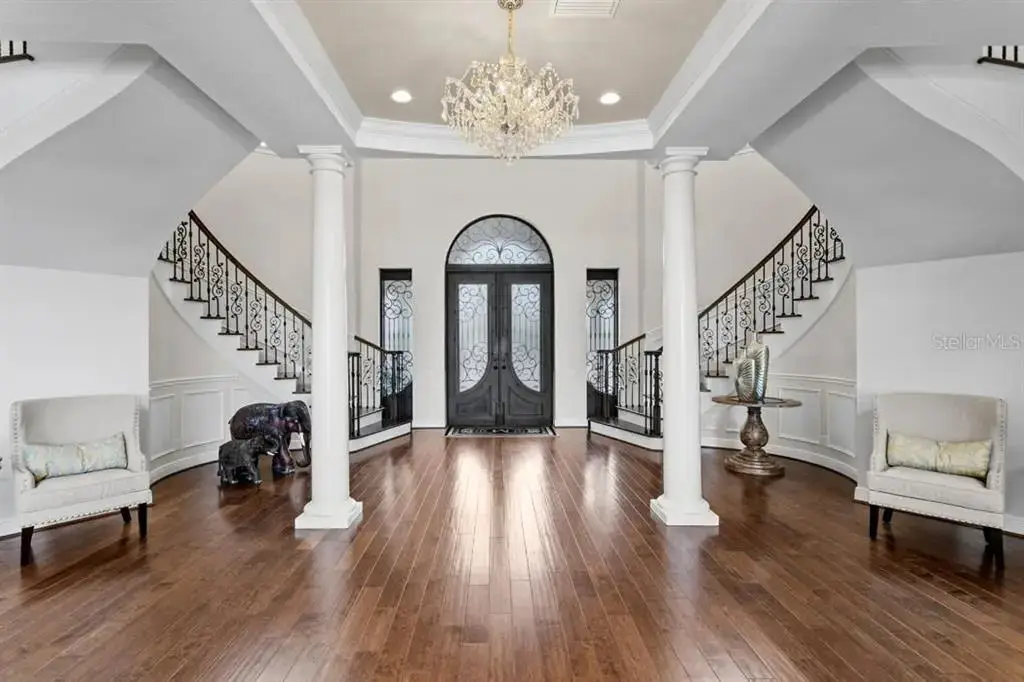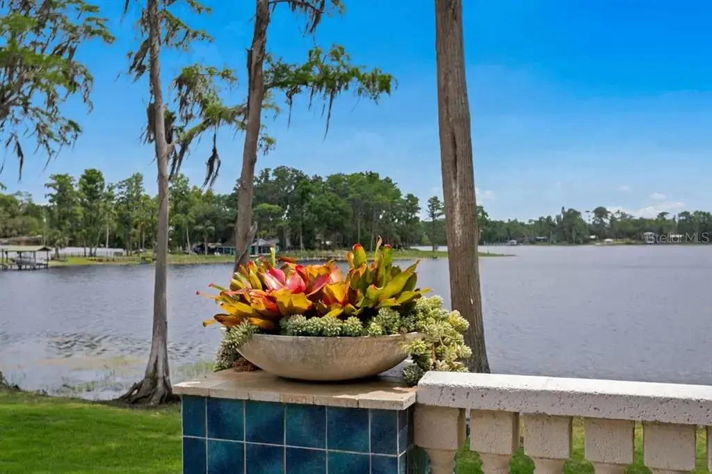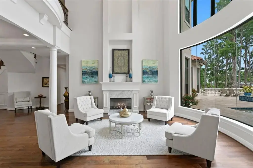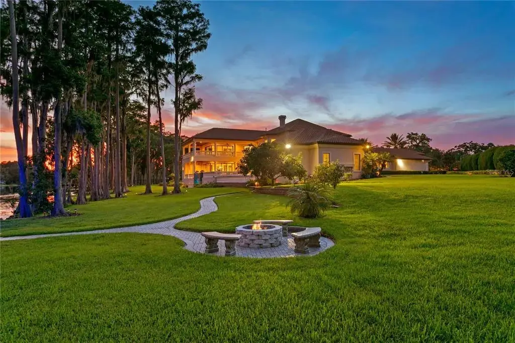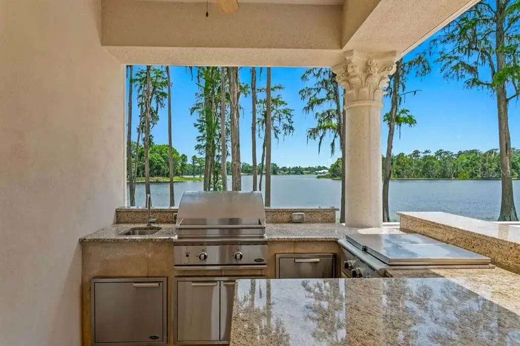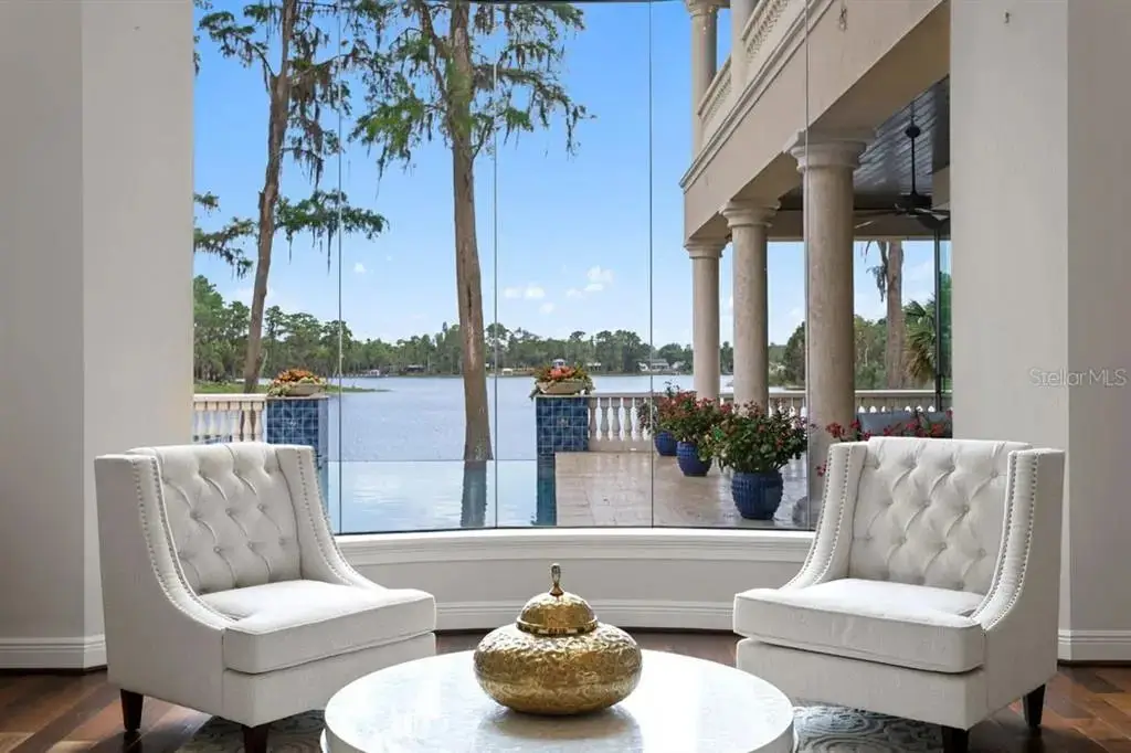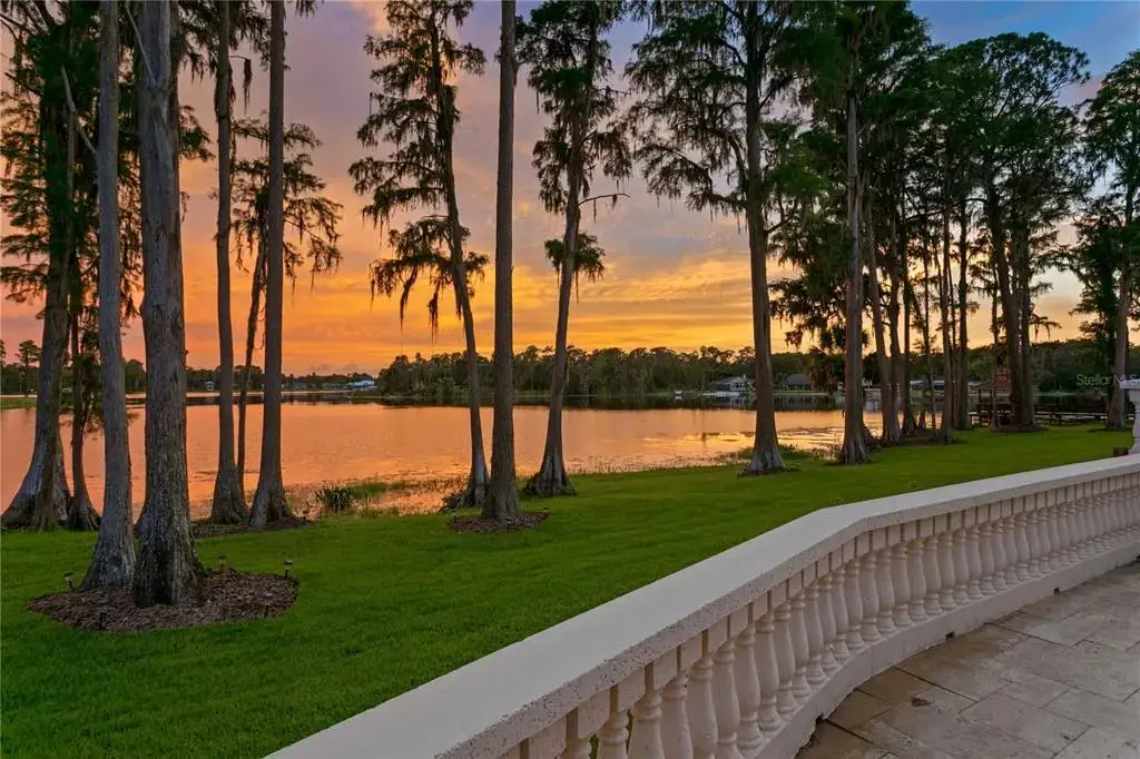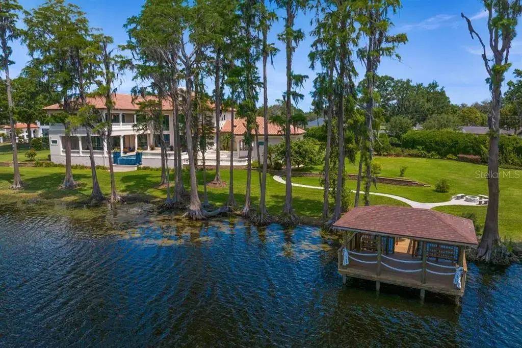 Gated lakefront estate offering space, privacy, and a stunning natural setting—17124 Crawley Road in Odessa is a rare opportunity to live expansively on nearly 6 acres along the tranquil shoreline of Rainbow Lake. With 300 feet of private lake frontage, this custom residence offers 10,545 square feet of living space. Built for both comfort and entertaining, the main house includes 5 bedrooms, 6 full baths, 2 half baths, entertainment space, gym, study, and 2 attached garages—one on each side of the home—designed for convenience and symmetry. Separate guest house features 1 bedroom and 1 full bath. The estate is finished with a pool, spa, and private dock—all with no HOA or CDD fees. Step through the grand double doors into a sweeping foyer with a dramatic double staircase. Straight ahead, the formal living room welcomes you with nearly 24-foot ceilings, gas fireplace, and open view to the pool and lake beyond. The spacious family room serves as a relaxed space with TV, electric fireplace, and sliding glass doors that lead seamlessly to the outdoor terrace. At the heart of the home, the kitchen is both stylish and functional—featuring a striking Cianitus granite island and Cambria Menai quartz on the perimeter, along with a gas range with 1.5 ovens, a separate wall oven, pot filler, microwave and refrigerator, and thoughtful storage. Nearby butler’s pantry with granite countertops and wine refrigerator connects the kitchen to the formal dining room, ideal for entertaining or daily living. Downstairs also includes a primary suite with a fireplace and sitting area, dual custom closets, and a spa-style bath with freestanding tub and oversized walk-in shower. 2 additional ensuite bedrooms are located on the main level. A dedicated study with soaring ceilings and separate gym complete the thoughtful main-level layout. Upstairs, 2 large suites offer the flexibility of dual primary bedrooms, each with its own full bath and walk-in closet. Just beyond, a large entertainment area includes a sunken game room, wet bar with refrigerator, and balcony with balustrades—perfect for entertaining or relaxing. Throughout the home, 8-foot doors, wood flooring, detailed crown and tray ceilings, and custom-finished walk-in closets in every bedroom enhance the design, while both upstairs and downstairs laundry rooms and electric vehicle charging station in the garage add everyday convenience. The separate guest cabana offers a refined yet relaxed extension of the home’s living space. Located just off the pool, it includes a built-in TV, crown and tray ceilings, and walk-in closet, along with full bath and bar with refrigerator. The grounds are the heart of this property. Designed by Ryan Hughes Design Build, the outdoor spaces are a blend of texture, scale, and serenity. Stacked stone retaining walls, lush gardens, fruit trees, and paver walkways surround a heated saltwater pool and spa, fire pit, covered terrace, full summer kitchen, and a separate outdoor full bath for added convenience. At the water’s edge, a private dock features electricity and nautical rope detailing, offering direct access to Rainbow Lake. Located in the heart of Odessa—where luxury homes, wide-open spaces, and natural beauty converge—this estate captures the essence of lakefront living with the convenience of being just minutes from Tampa, major roadways, and top-tier amenities. A rare opportunity to live expansively, privately, and beautifully.