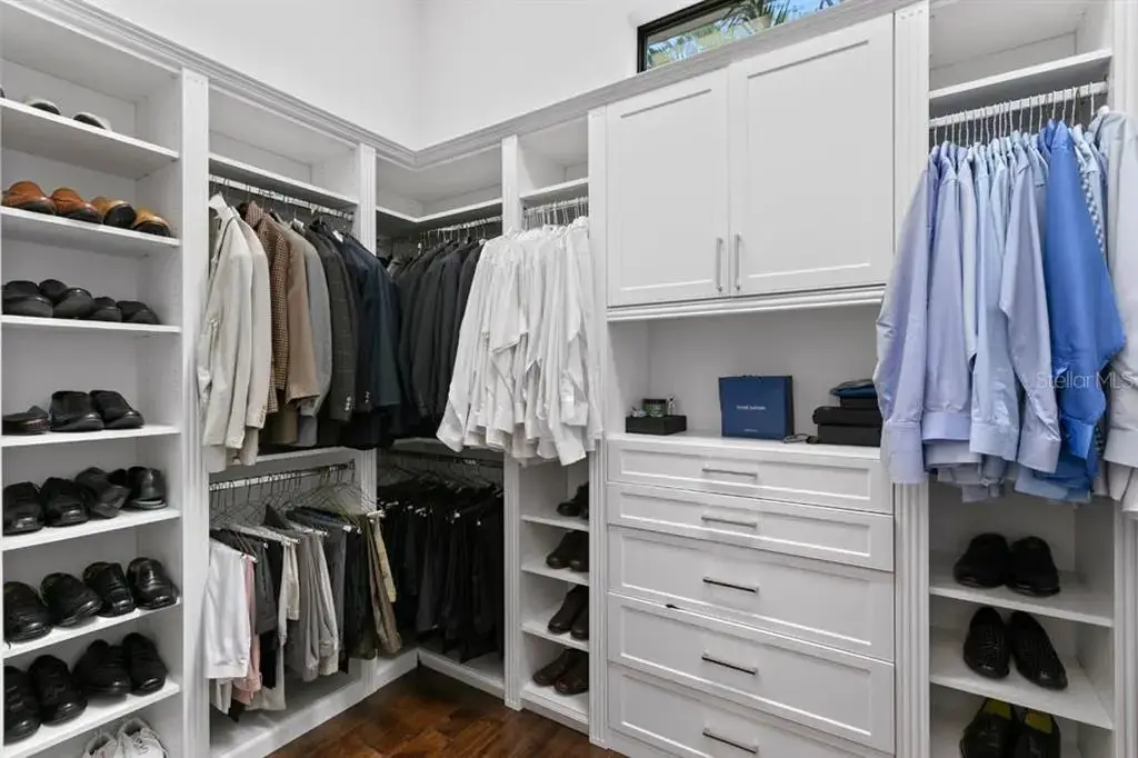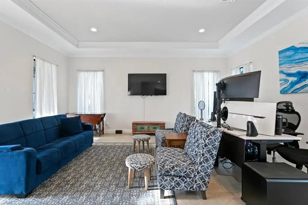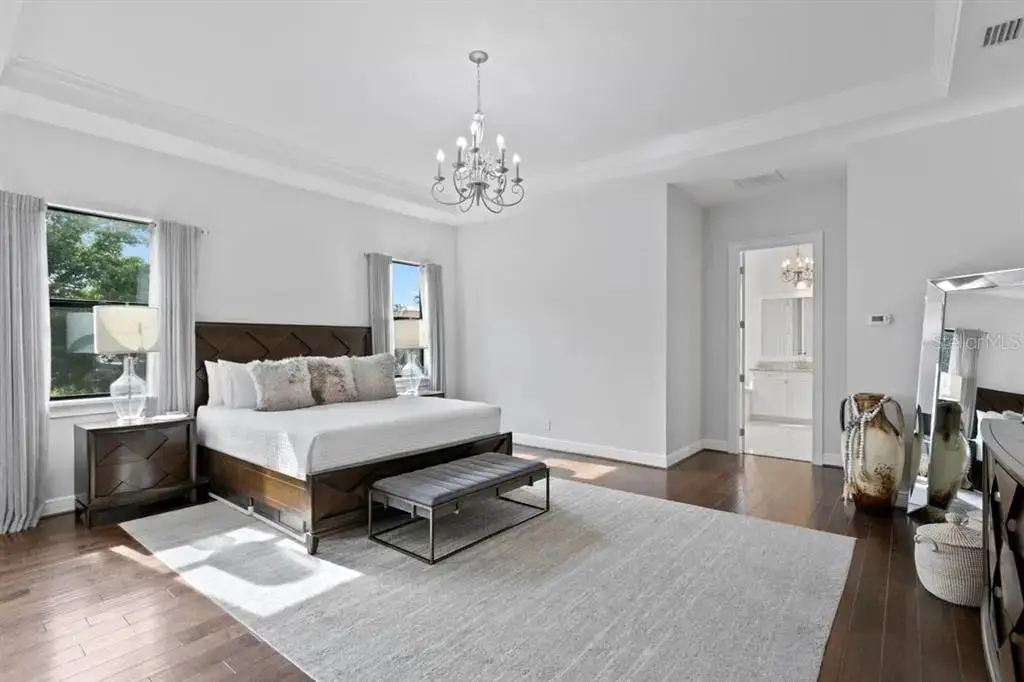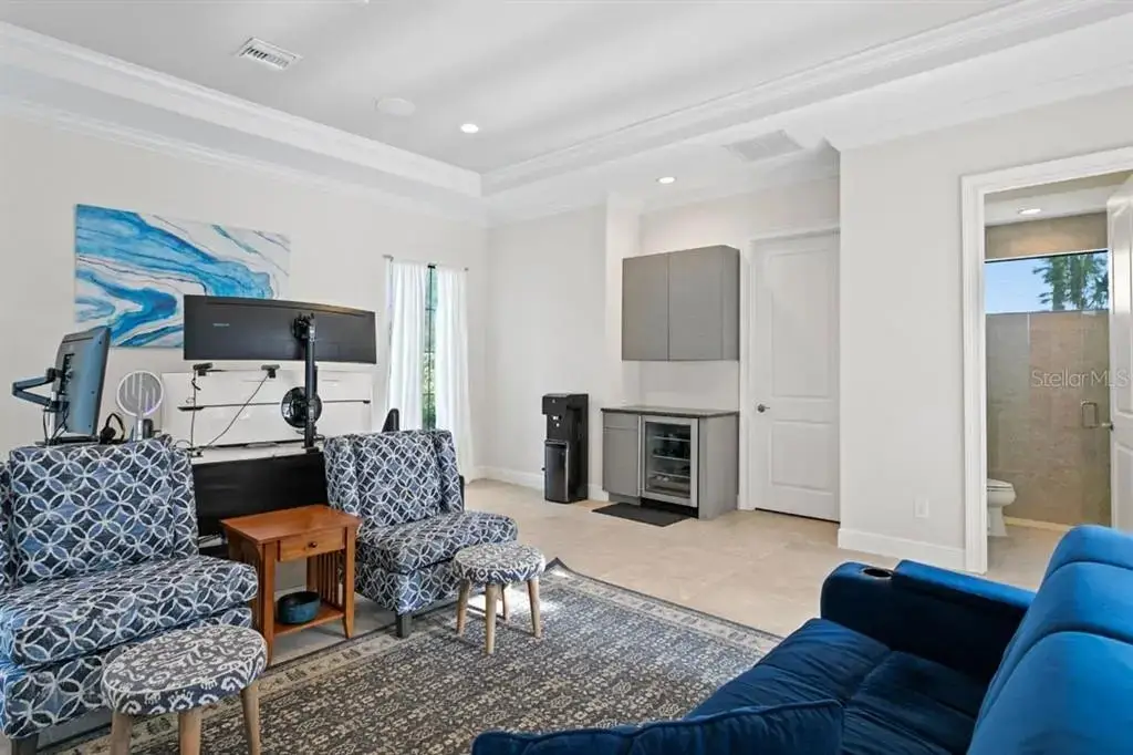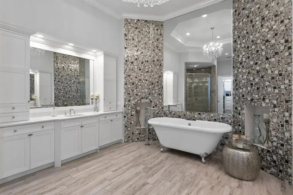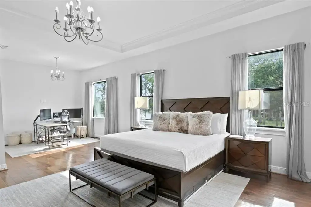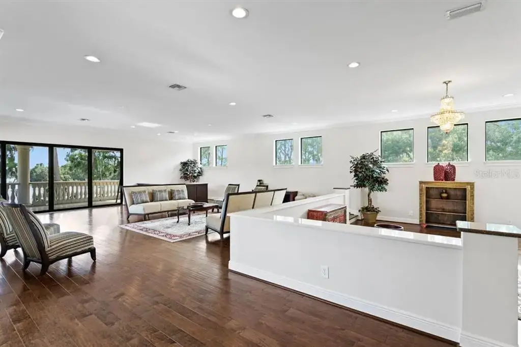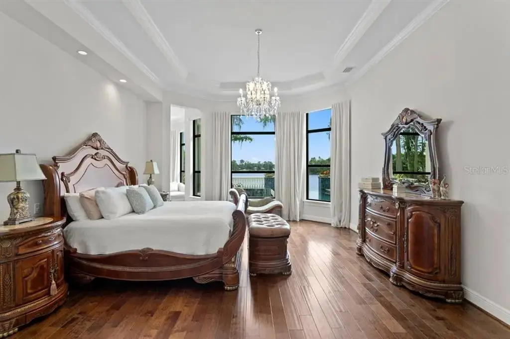 Gated lakefront estate offering space, privacy, and a stunning natural setting—17124 Crawley Road in Odessa is a rare opportunity to live expansively on nearly 6 acres along the tranquil shoreline of Rainbow Lake. With 300 feet of private lake frontage, this custom residence offers 10,545 square feet of living space. Built for both comfort and entertaining, the main house includes 5 bedrooms, 6 full baths, 2 half baths, entertainment space, gym, study, and 2 attached garages—one on each side of the home—designed for convenience and symmetry. Separate guest house features 1 bedroom and 1 full bath. The estate is finished with a pool, spa, and private dock—all with no HOA or CDD fees. Step through the grand double doors into a sweeping foyer with a dramatic double staircase. Straight ahead, the formal living room welcomes you with nearly 24-foot ceilings, gas fireplace, and open view to the pool and lake beyond. The spacious family room serves as a relaxed space with TV, electric fireplace, and sliding glass doors that lead seamlessly to the outdoor terrace. At the heart of the home, the kitchen is both stylish and functional—featuring a striking Cianitus granite island and Cambria Menai quartz on the perimeter, along with a gas range with 1.5 ovens, a separate wall oven, pot filler, microwave and refrigerator, and thoughtful storage. Nearby butler’s pantry with granite countertops and wine refrigerator connects the kitchen to the formal dining room, ideal for entertaining or daily living. Downstairs also includes a primary suite with a fireplace and sitting area, dual custom closets, and a spa-style bath with freestanding tub and oversized walk-in shower. 2 additional ensuite bedrooms are located on the main level. A dedicated study with soaring ceilings and separate gym complete the thoughtful main-level layout. Upstairs, 2 large suites offer the flexibility of dual primary bedrooms, each with its own full bath and walk-in closet. Just beyond, a large entertainment area includes a sunken game room, wet bar with refrigerator, and balcony with balustrades—perfect for entertaining or relaxing. Throughout the home, 8-foot doors, wood flooring, detailed crown and tray ceilings, and custom-finished walk-in closets in every bedroom enhance the design, while both upstairs and downstairs laundry rooms and electric vehicle charging station in the garage add everyday convenience. The separate guest cabana offers a refined yet relaxed extension of the home’s living space. Located just off the pool, it includes a built-in TV, crown and tray ceilings, and walk-in closet, along with full bath and bar with refrigerator. The grounds are the heart of this property. Designed by Ryan Hughes Design Build, the outdoor spaces are a blend of texture, scale, and serenity. Stacked stone retaining walls, lush gardens, fruit trees, and paver walkways surround a heated saltwater pool and spa, fire pit, covered terrace, full summer kitchen, and a separate outdoor full bath for added convenience. At the water’s edge, a private dock features electricity and nautical rope detailing, offering direct access to Rainbow Lake. Located in the heart of Odessa—where luxury homes, wide-open spaces, and natural beauty converge—this estate captures the essence of lakefront living with the convenience of being just minutes from Tampa, major roadways, and top-tier amenities. A rare opportunity to live expansively, privately, and beautifully.