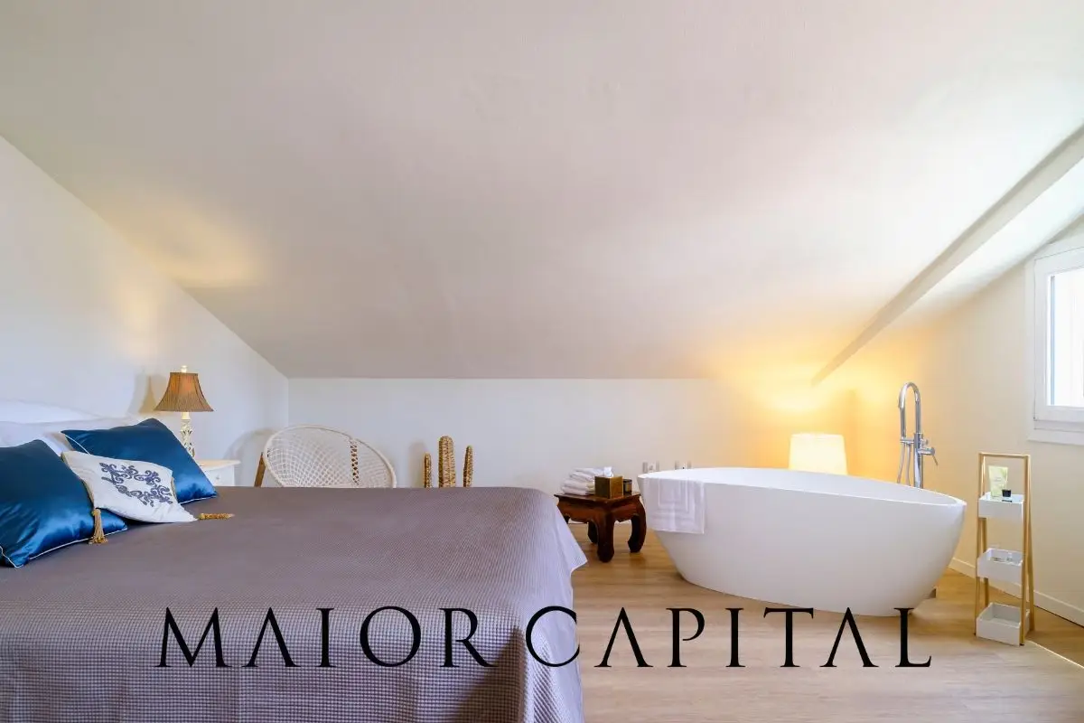 In the heart of Olbia's historic centre, along the lively Corso Umberto, we are offering an exclusive penthouse that is much more than just a home: it is a veritable art gallery, where creativity and design blend harmoniously with the timeless charm of a historic building. Located on the second and top floor, the property is part of a 1940s building, embellished with original frescoes that preserve its period character.A central and vibrant locationThe residence enjoys a privileged location in the heart of the city. Just a few steps away are the library, cinema, historic shops, traditional restaurants, aperitif bars and artisan workshops that reveal the authentic soul of Olbia. Furthermore, its proximity to the international airport and the Marina di Olbia - Moys makes this the perfect solution for those who want to live in the centre without sacrificing immediate access to the sea and the world.Interiors with an artistic soulThe penthouse is the result of a refined restyling that has successfully combined the spirit of the building with a contemporary language, enriched with touches of pure art and vintage references. The attic rooms, lit by large French windows and skylights, create a play of light and perspectives that amplify the perception of space.The furniture has been selected with extreme care: among the most significant pieces is a 1970s brass bed with matching bedside tables, which harmoniously dialogue with contemporary art elements.The bathrooms stand out for their dramatic character, with vintage cement tiles combined with carved wooden tops and contrasting washbasins, a combination that unites tradition and aesthetic research.Art as a common threadArt takes centre stage in every room: from works by local artists, including Scoobafish, to those by an Argentine artist who works with recycled iron materials, to a tribute by a Sicilian artist. Every detail contributes to transforming this home into an inspired and inspiring place. Not just a penthouse, but an environment that conveys emotions and tells stories.Stunning views and outdoor spacesThe living room opens onto a veranda overlooking Corso Umberto, offering unique views of the dome of St. Paul's Church and the Ferris wheel - known as the 'London Eye of Olbia' - which lights up at night, creating a magical atmosphere. The second covered veranda, connected to the kitchen and dining room, offers a more intimate space, perfect for private dinners or moments of relaxation.The sleeping area and master suiteAn elegant hallway leads to the sleeping area, which consists of two bedrooms, a large study and two bathrooms. The master suite is a charming retreat, with a freestanding bathtub in the bedroom, designed to provide a living experience reminiscent of a luxury boutique hotel.Comfort and technologyThis penthouse is not only aesthetically appealing, but has also been designed to guarantee a superior living experience. Every detail has been carefully considered to offer well-being, efficiency and safety, thanks to the integration of the best technologies for air conditioning, energy saving and home automation.A residence for those who love beautyThis property is designed for those looking for a home that is not just a dwelling, but a sensory experience. A penthouse that combines art, design and comfort in one of the most authentic and lively areas of Sardinia, ready to become the ideal home for lovers of beauty, collectors and creative spirits.Composed as follows:* Large living room with access to the uncovered veranda* Kitchen with access to a second covered veranda* Hallway* Master suite with freestanding bathtub* Second double bedroom* Two bathrooms with walk-in showers* Third bedroom or workshop/studyFeatures:* Fully furnished* Private lift* L
