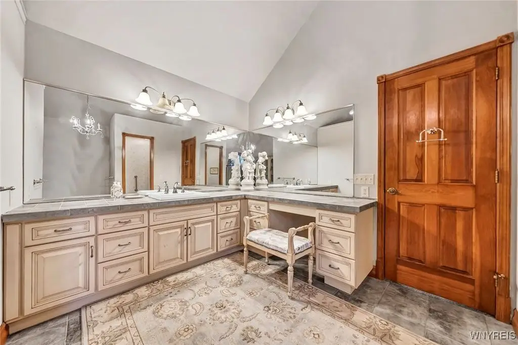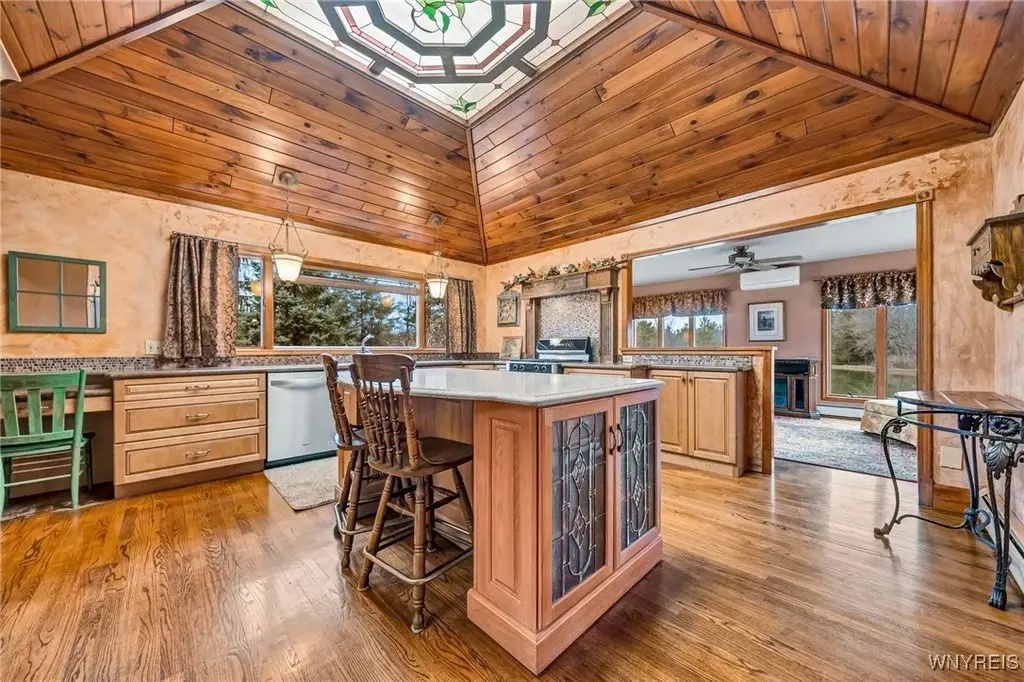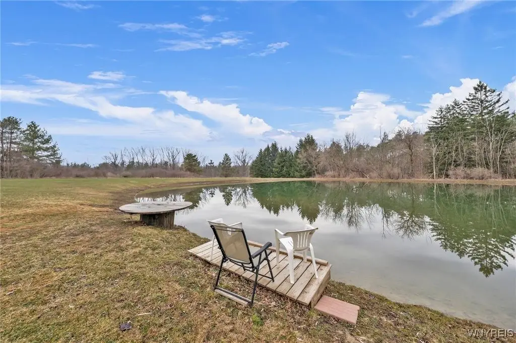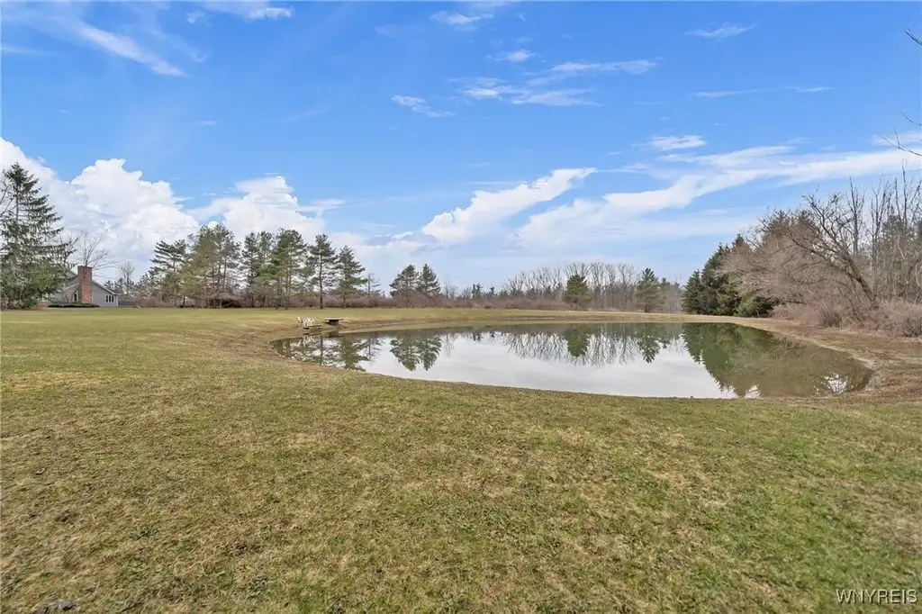 Exquisite all-brick, sprawling ranch nestled on 17 serene, partially wooded acres, complete with a tranquil pond, 3-car garage, in coveted Orchard Park. Enjoy the pond with dock, fountains, gazebo, pergola & wander the wooded trails, surrounded by nature's beauty. Stunning cathedral-ceiling foyer beckons you through double French doors into a majestic Great Room, where soaring wood-lined ceilings & a monumental gas fireplace w/built-ins & a raised hearth set the stage for elegant living. Oak bar, with leaded glass cabinetry, creates the perfect ambiance for hosting unforgettable gatherings. The chef-inspired eat-in kitchen, featuring wood-lined cathedral ceilings, hardwood floors, Cambria quartz island counter & leaded glass doors. This flows into Family Room w/an electric fireplace & Formal Dining area, both of which open through French doors onto a roomy deck. The outdoor space is an entertainer's dream, a pergola, swing, gazebo, fountain, sweeping views of the pond & lush yard. The private primary suite boasts a tray ceiling, walk-in closet, glamour bath bathed in natural light from an abundance of windows with a hint of romance. Guest suite offers cathedral ceilings, its own walk-in closet & private ensuite bath. A convenient 1st-floor laundry room includes modern appliances. The library/den provides a versatile space that could serve as a 3rd bedroom. The lower level is an entertainer's paradise or ideal in-law suite, featuring a vast finished area with a bedroom, spacious walk-in closet, full kitchen w/stove & refrigerator space, a dining area, & a living room with a gas-burning stove. Ceramic-tiled exit from lower-level leads to yard & 3rd garage. Recently updated with a brand-new on-demand HWT '24 & full tear-off roof '24, offering comfort & luxury with its central vacuum system & mini split A/C system. The attached 2.5-car garage is outfitted w/cabinets, sink & is designed for indoor entertainment. A truly a once-in-a-lifetime special opportunity! Offers reviewed as they come in & seller reserves the right to set a deadline for offers. Sq ft was measured by architect - 1st flr = 3162 sq ft. Finished lower-level areas = 1785. Total sq ft is 4947.