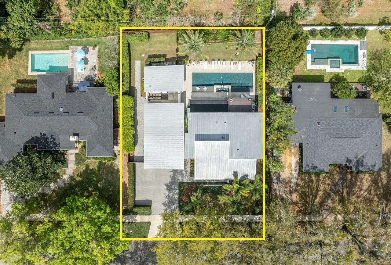 This contemporary five-bedroom, three-and-a-half-bath home with a detached 384 SF casita in desirable Beverly Shores/Rose Isle showcases designer-inspired finishes and a resort-style pool retreat. Custom-built with a modern aesthetic and open floor plan, it features a gourmet kitchen with an island, breakfast bar, stainless steel appliances including a Viking refrigerator and separate freezer, espresso cabinetry, and Caesarstone countertops. The open dining area flows seamlessly into the spacious great room, highlighted by polished concrete floors, a custom-built media center, a wine room, bedroom with en-suite bath, and aan office with wrap around desk. Twelve-foot retractable sliding glass doors fill the main living area with natural light and open to spectacular views of the heated saltwater pool and spa. Upstairs, the primary suite offers a serene retreat with a custom-designed walk-in closet, Caesarstone dual vanities, soaking tub, separate shower, and a private balcony overlooking the pool and Mead Gardens. Two additional bedrooms share a Jack-and-Jill bath, while another flexible space serves perfectly as a media room, gym, or nursery. A secondary washer and dryer upstairs add convenience. The outdoor living area is an entertainer’s dream, complete with a summer kitchen, bar area, gas grill, and retractable awning. Guests will love the detached guest house with its private entrance and pool views. The garage provides flexibility, accommodating either two or four cars. Ideally located near both Orlando and Winter Park, and just steps from scenic Mead Gardens, this home offers luxury living at its finest—a perfect blend of modern design, functionality, and resort-style comfort.