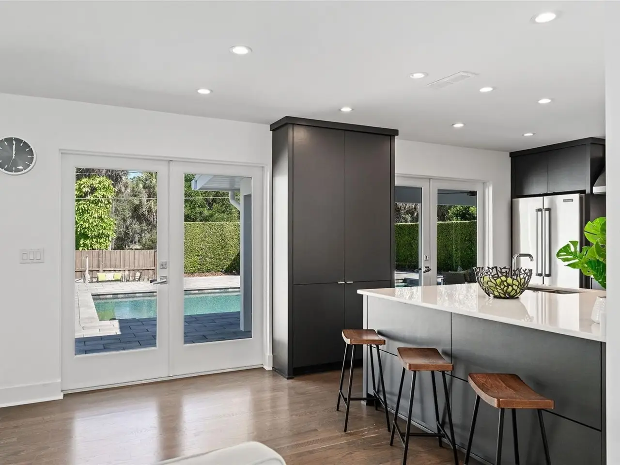 Modern Sophistication Meets Effortless Living! Nestled in the highly sought-after Beverly Shores/Rose Isle community, this stunning 4-bedroom, 3.5-bath residence perfectly balances modern design, architectural details & natural beauty. Thoughtfully expanded & reimagined by skilled craftsmen, every inch of this home has been curated to enhance both daily living & stylish entertaining. Beyond its exceptional design, the property offers something truly rare—private access to the enchanting 47-acre Mead Botanical Garden, where trails, picnic areas & vibrant wildlife are steps from your backyard. Step inside to airy, sunlit spaces where smooth-textured ceilings & walls, recessed lighting & refinished hardwood floors establish a bright, gallery-like aesthetic. The living area centers around a dramatic floor-to-ceiling marble fireplace that adds warmth & elegance to the home’s contemporary lines. Expansive sliders from the kitchen & dining areas open to the lanai & pool, blending indoor & outdoor living. The striking kitchen merges beauty & functionality with refined cabinetry, marble countertops & premium KitchenAid appliances. Designed as the heart of the home, it flows effortlessly into the living & dining areas and out to the lanai & pool, where the island with beverage refrigerator serves as the perfect centerpiece for gathering. Designed for privacy, the primary suite is a tranquil haven with a sitting area & hurricane-rated sliders opening directly to the pool terrace. The indulgent spa-like bath features a freestanding soaking tub & oversized shower with multiple showerheads in an open wet-room layout. A floating double vanity with quartz counters & imported Porcelanosa fixtures adds European refinement, while a customized walk-in closet with built-in vanity connects seamlessly to both bedroom & bath. Three walls of custom built-ins define the versatile media room—ideal as a stylish home office or cozy den. The upgraded laundry room includes custom cabinetry, quartz counters, sink & an additional refrigerator for convenience. You will also find three additional spacious bedrooms, with two featuring double French doors to the lanai for serene views & direct access. The 2nd bedroom includes a custom walk-in closet & elegant en-suite bath with marble walls & floors, custom floating vanity, quartz counters, Kohler fixtures & a multi-head shower. Bath 3 offers an oversized wall-mounted vanity, glass-enclosed shower & Kohler fixtures. Step outside to your private resort-style retreat with a sparkling saltwater pool featuring remote-controlled lighting & cleaning system. The expansive brick-paver deck is perfect for lounging or entertaining, while the covered lanai, outdoor shower & lush privacy hedges create a secluded, relaxing atmosphere. Professionally designed landscaping enhances the home’s architectural appeal with manicured hedges, gravel walkways & garden beds for herbs or flowers—evoking a scene straight from Architectural Digest. Pineapple plants, plum, mango & peach trees, accent the grounds with vibrant foliage & the promise of fresh, seasonal fruit. Smart home features include Nest thermostats, smart irrigation, landscape lighting & security cameras—each app-controlled for convenience & peace of mind. All of this in a premier location with convenient access to Orlando’s major hospitals, renowned museums, Downtown Orlando & Winter Park’s celebrated Park Avenue—within the highly rated Audubon K–8 school district.
