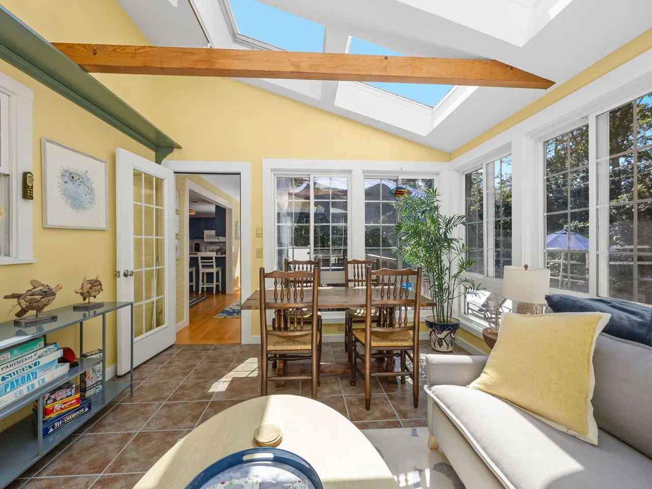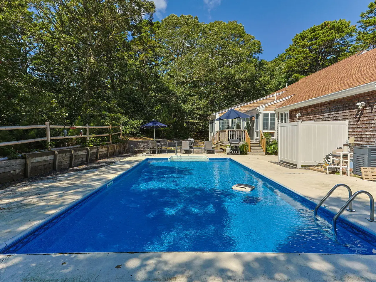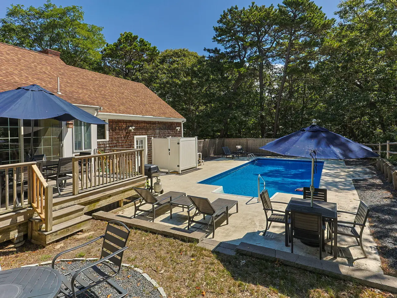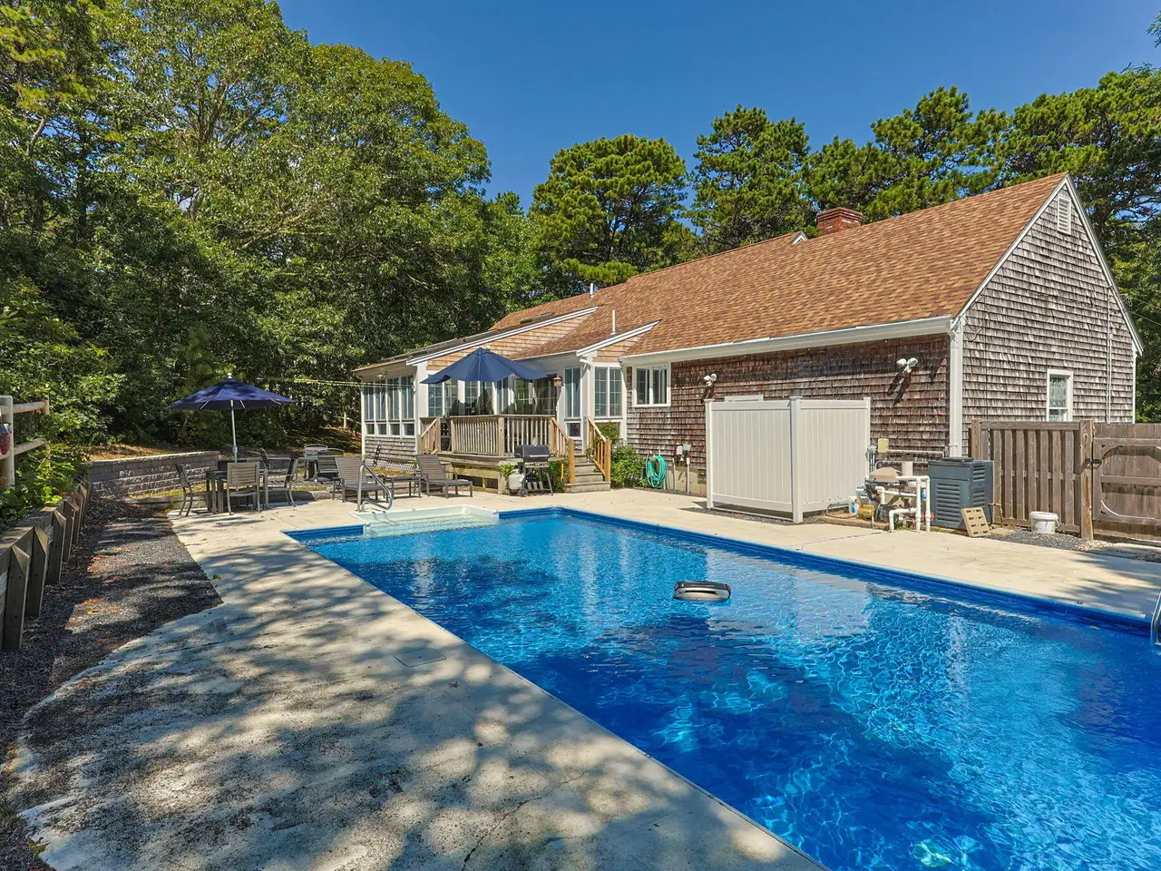 Tucked away on a quiet cul-de-sac, this inviting 3-bedroom, 2-bath ranch offers the perfect blend of comfort and coastal charm. The vaulted living room, enhanced by skylights and a cozy fireplace, creates a bright and welcoming gathering space. A sunroom with a warming stove overlooks the private backyard, while the spacious deck and sparkling pool are ideal for summer living and entertaining. The lower level includes an exercise room, abundant storage, and excellent potential for additional living space. With a newer roof and a quiet setting close to the beach, this home offers privacy, convenience, and an easy Cape Cod lifestyle.