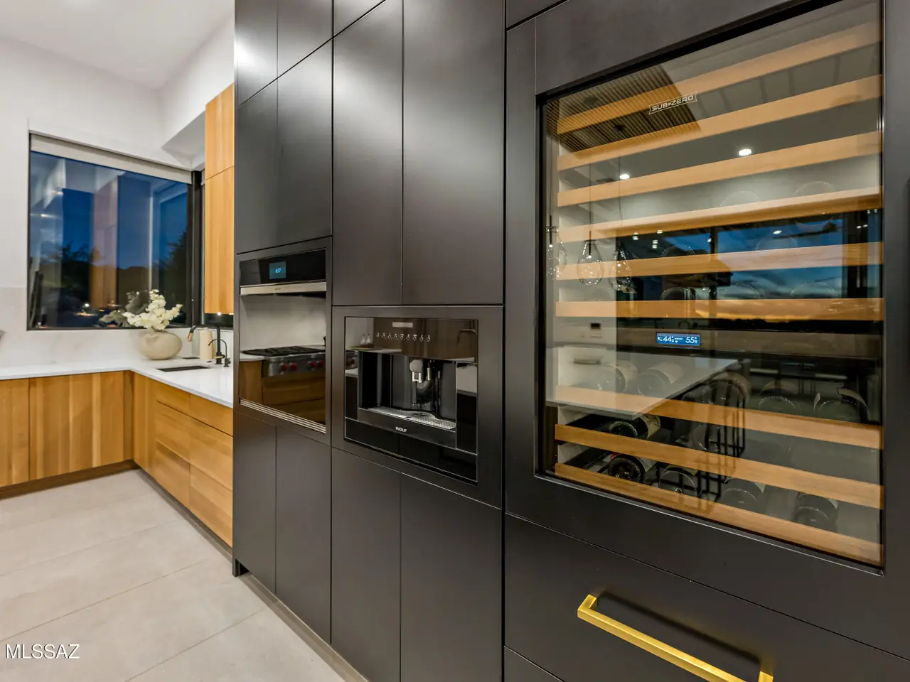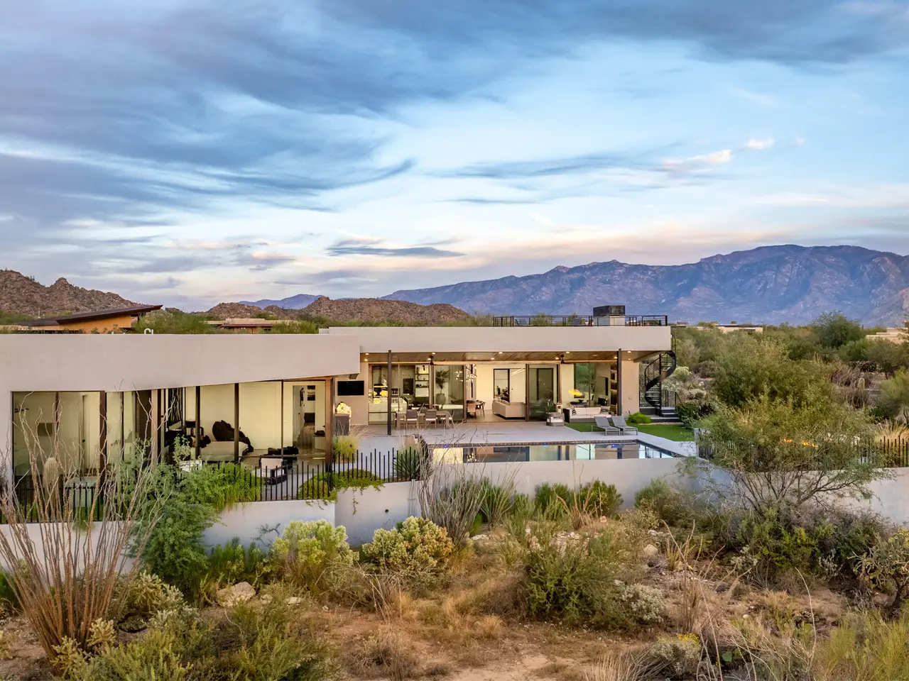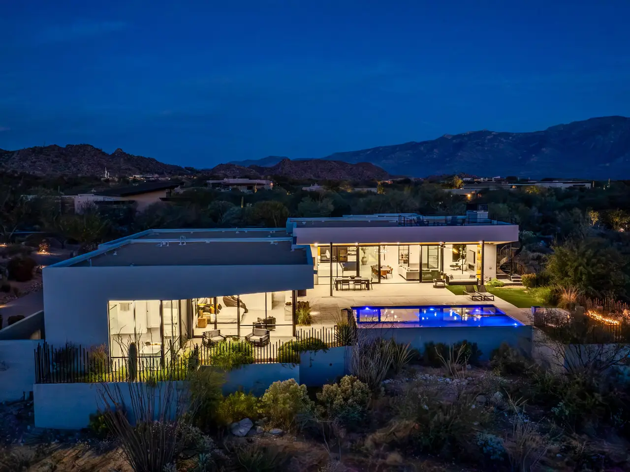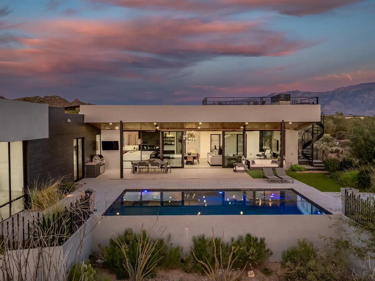 Modern luxury and integrated technology define this newly completed residence, designed by renowned architect Marc Soloway with interiors by Designs by Priya. Located in Stone Canyon's premier guard-gated community, the property offers mountain views, unobstructed sunsets, and backs to preserved desert for privacy. A pivot front door opens to a streamlined floor plan with tall ceilings, 24x48 Italian tile, and a full glass wall overlooking the resort-style backyard. Western multi-slide doors create a true indoor-outdoor layout. The kitchen features a quartz waterfall island, Sub-Zero, Wolf, and Dacor appliances, a built-in Wolf coffee maker, dual sinks, a hidden walk-in pantry, white-oak accents, and a Sub-Zero wine column. The primary suite includes floor-to-ceiling glass, a spa-inspired bath with black lavastone shower tile, floating vanities with LED mirrors, and a California Closets wardrobe. Secondary baths continue the same elevated detailing with floating vanities and full-height tile. The home is fully automated with a Control4 system managing audio, cameras, automatic shades, the cinema room, lighting, and more. Hallway lighting is upgraded to gallery-style fixtures. The cinema room includes built-in surround sound, an automatic projector, blackout shades, and a dedicated IT closet. Outdoor features include a saltwater pool and spa, view fencing, bar seating, and a Lynx Sedona grill. A custom metal spiral staircase leads to the rooftop deck for star-gazing, city light views, and sunset watching. A modern, well-built home with high-level finishes and a prime Stone Canyon setting